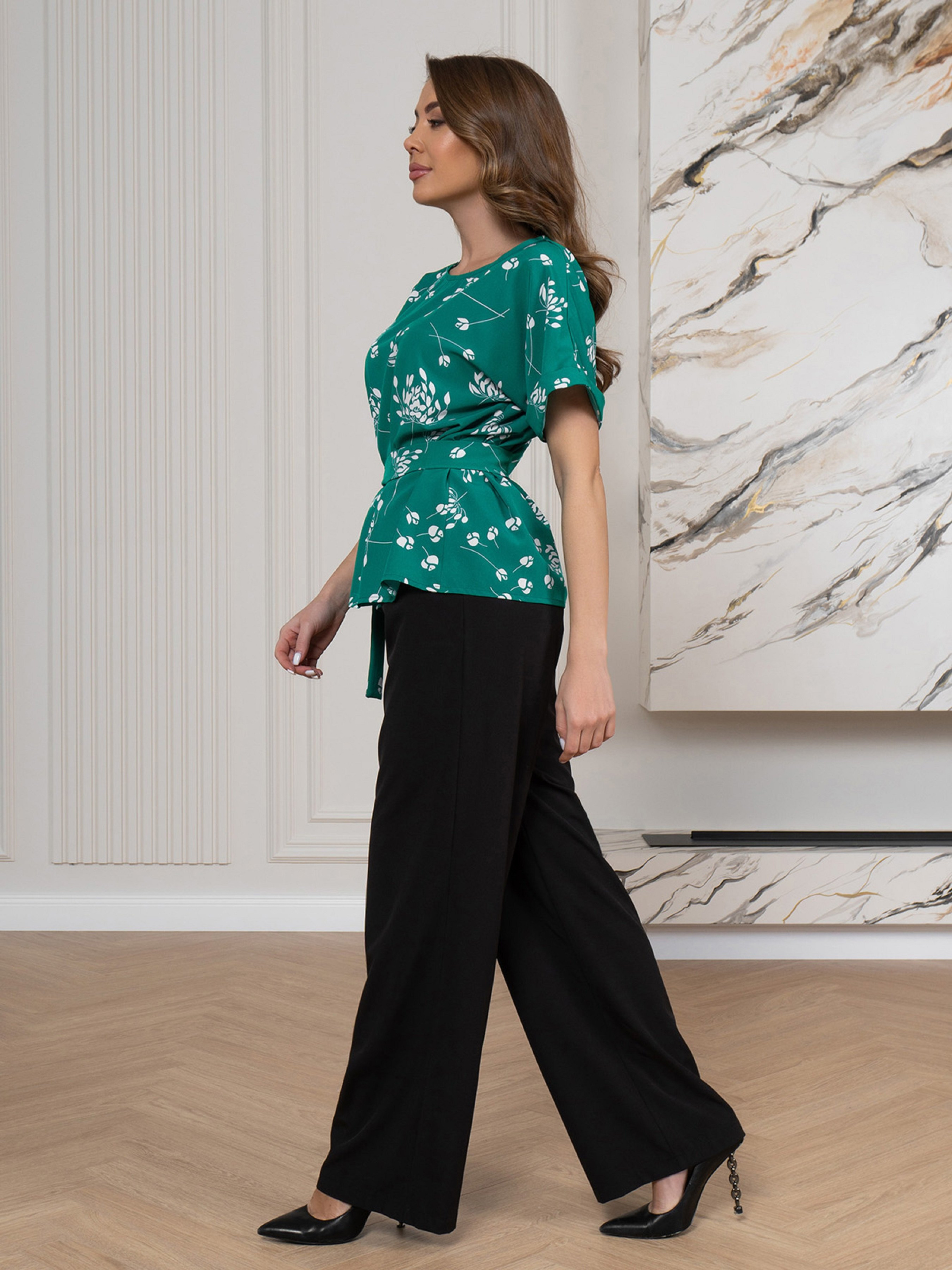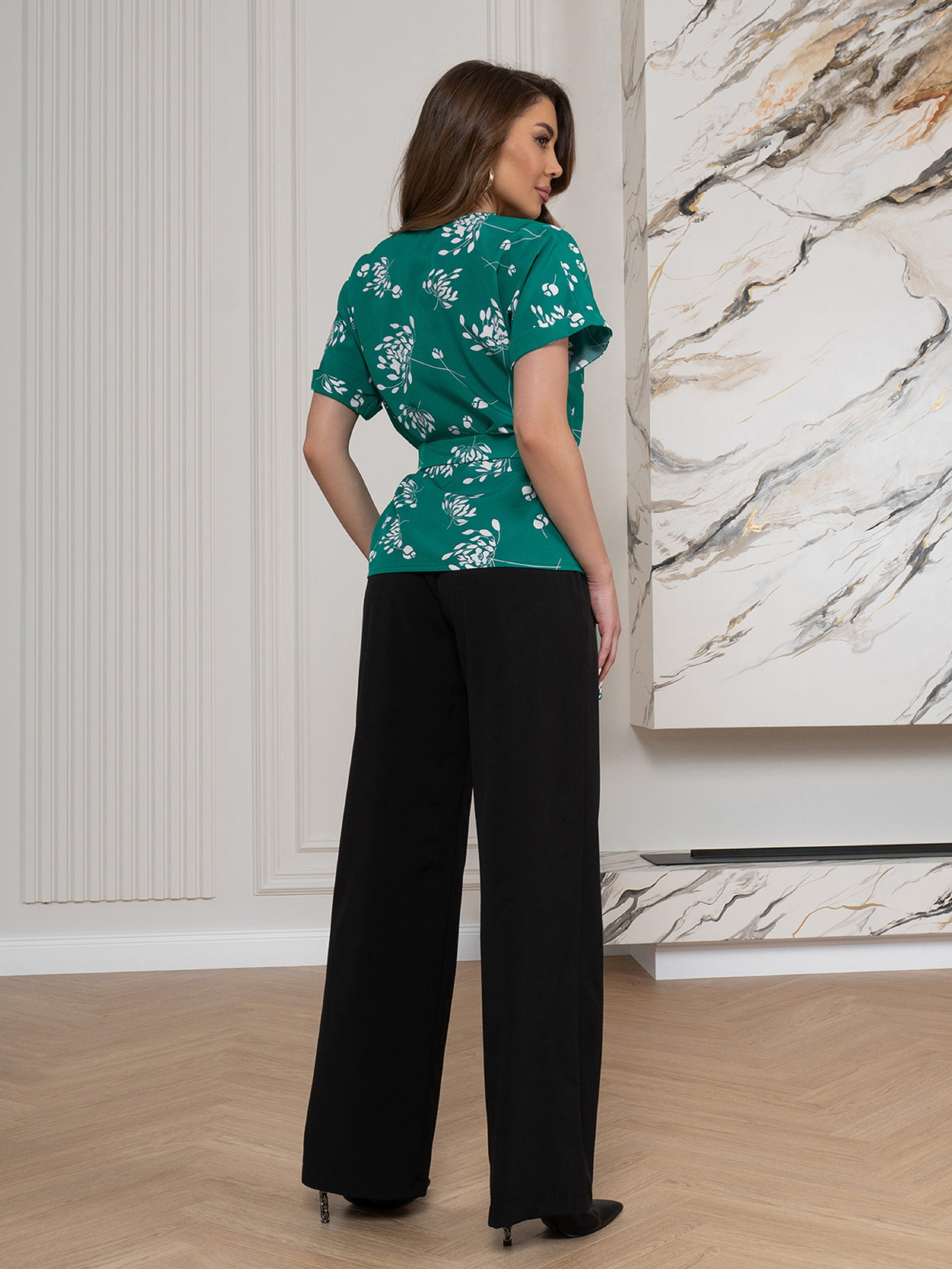 Повседневный костюм с принтом и съемным поясом, выполненный из зеленого и черного софта. Блуза с кроем летучая мышь и короткими рукавами с подворотами. Черные широкие брюки на резинке с боковыми карманами. Полуобхват: Блузка: Грудь: S (51), M (53), L (55), XL (57), Длина изделия - 64, Рукав - 14, Брюки: Талия: S (31-38), M (33-40), L (35-42), XL (37-44), Бедра: S (54), M (56), L (58), XL (60), Длина изделия - 106, Длина по внутреннему шву - 81, Ткань: Низкой эластичности.