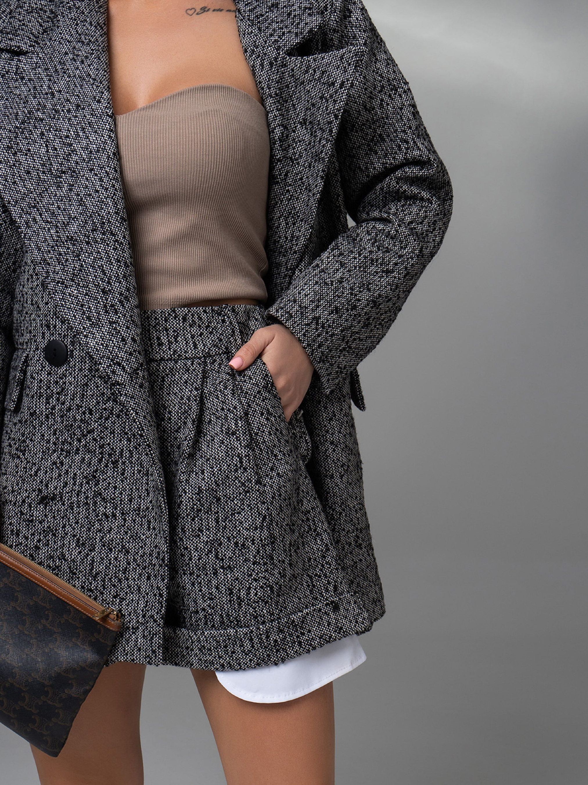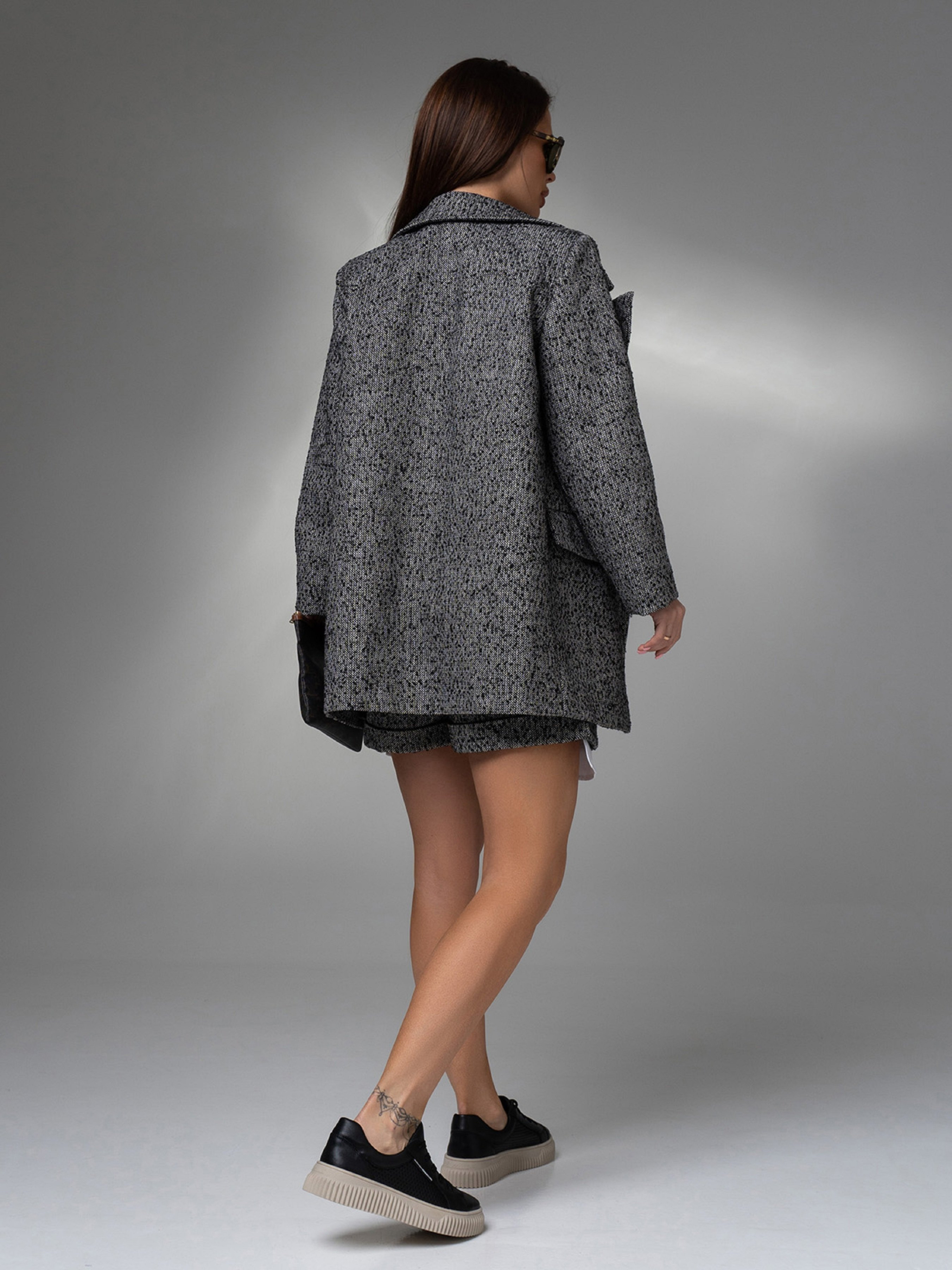 Демисезонный твидовый костюм с короткими шортами и длинным пиджаком. Пиджак на пуговице с длинными рукавами и карманами с клапанами. Шорты высокой посадки с подворотами, застежкой-пуговицей и молнией. Модель с карманами. Пиджак и шорты с нижним подкладом. Полуобхват: Пиджак: Грудь: S (50), M (52), L (54), XL (56), Длина изделия - 71, Рукав - 59, Шорты: Талия: S (32), M (34), L (36), XL (39), Бедра: S (52), M (54), L (56), XL (58), Длина изделия - 37, Длина по внутреннему шву - 5, Ткань: Низкой эластичности.