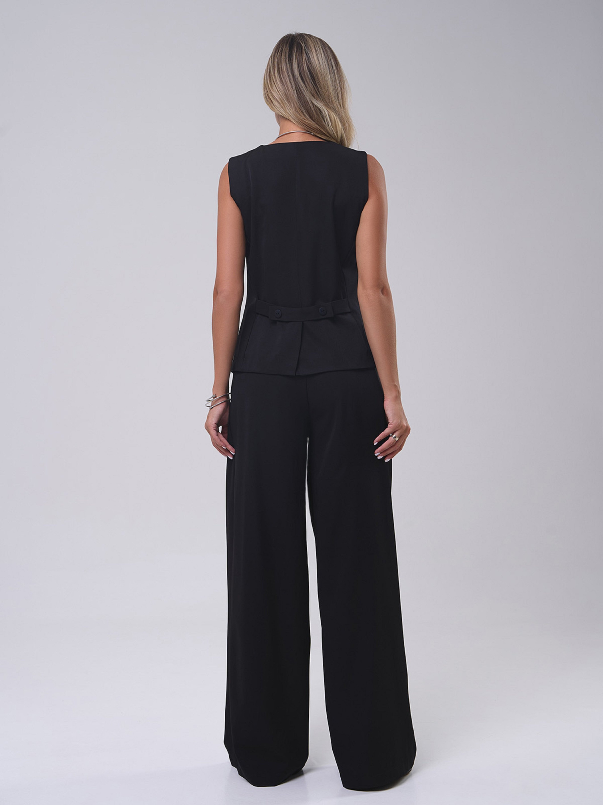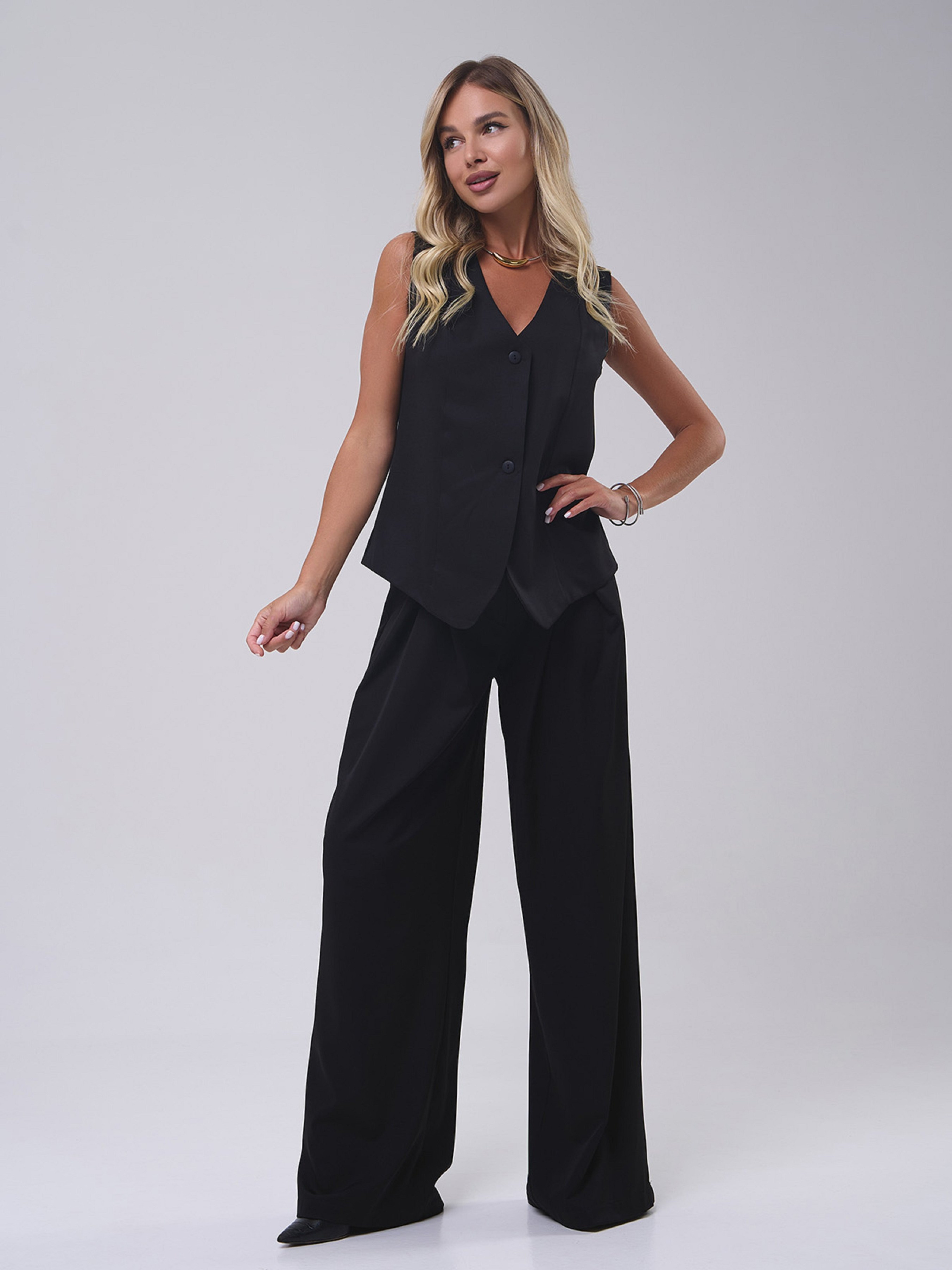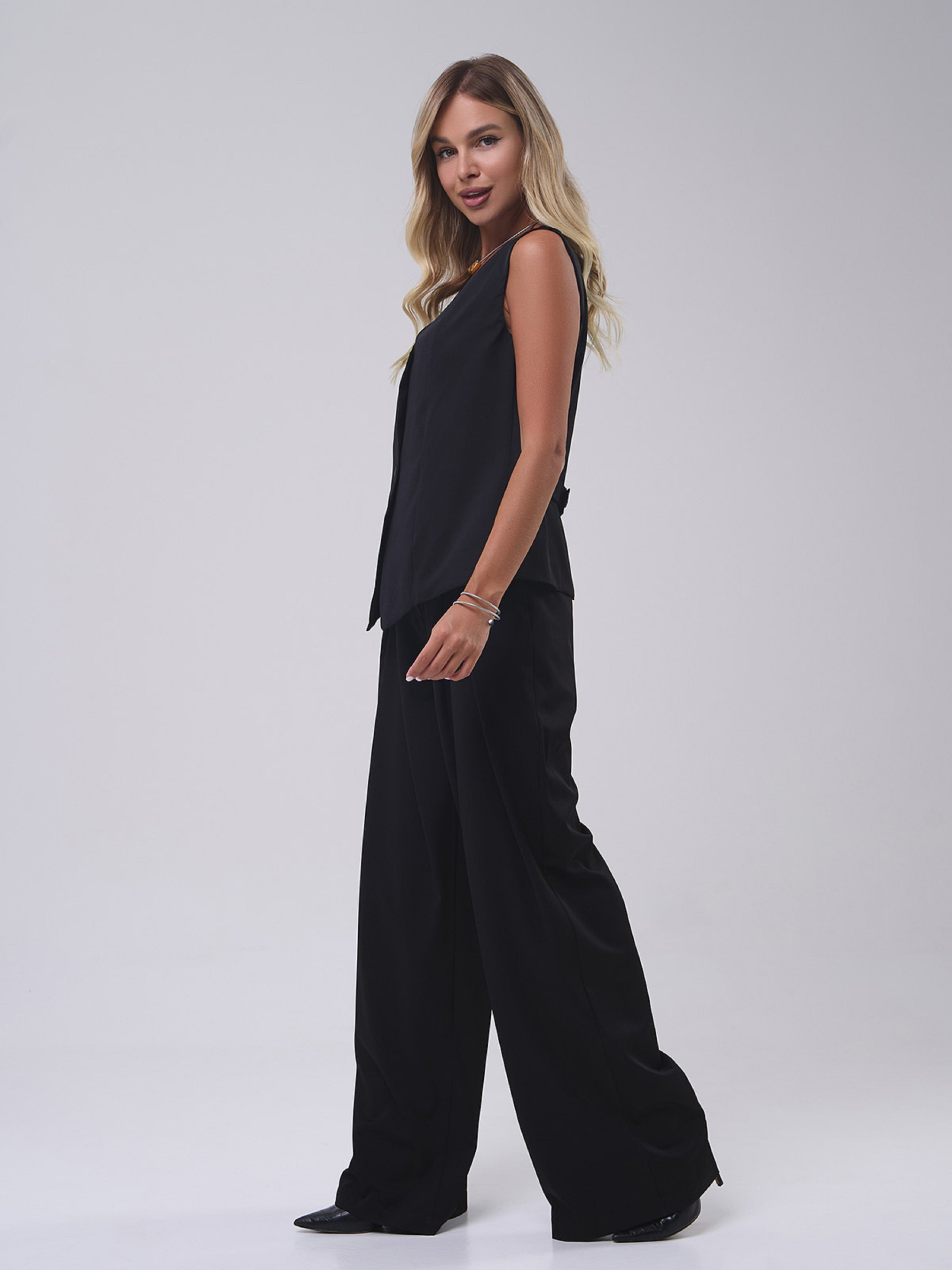 Черный классический костюм, выполненный из однотонной костюмки. Брюки высокой посадки с широким прямым кроем, карманами и защипами. Жилет на пуговицах с V-образной горловиной и вырезом сзади с фиксатором. Полуобхват: Жилет: Грудь: S (46), M (48), L (50), XL (52), Длина изделия - 63, Брюки: Талия: S (32), M (34), L (36), XL (39), Бедра: S (52), M (54), L (56), XL (58), Длина изделия - 113, Длина по внутреннему шву - 82, Ткань: Низкой эластичности.