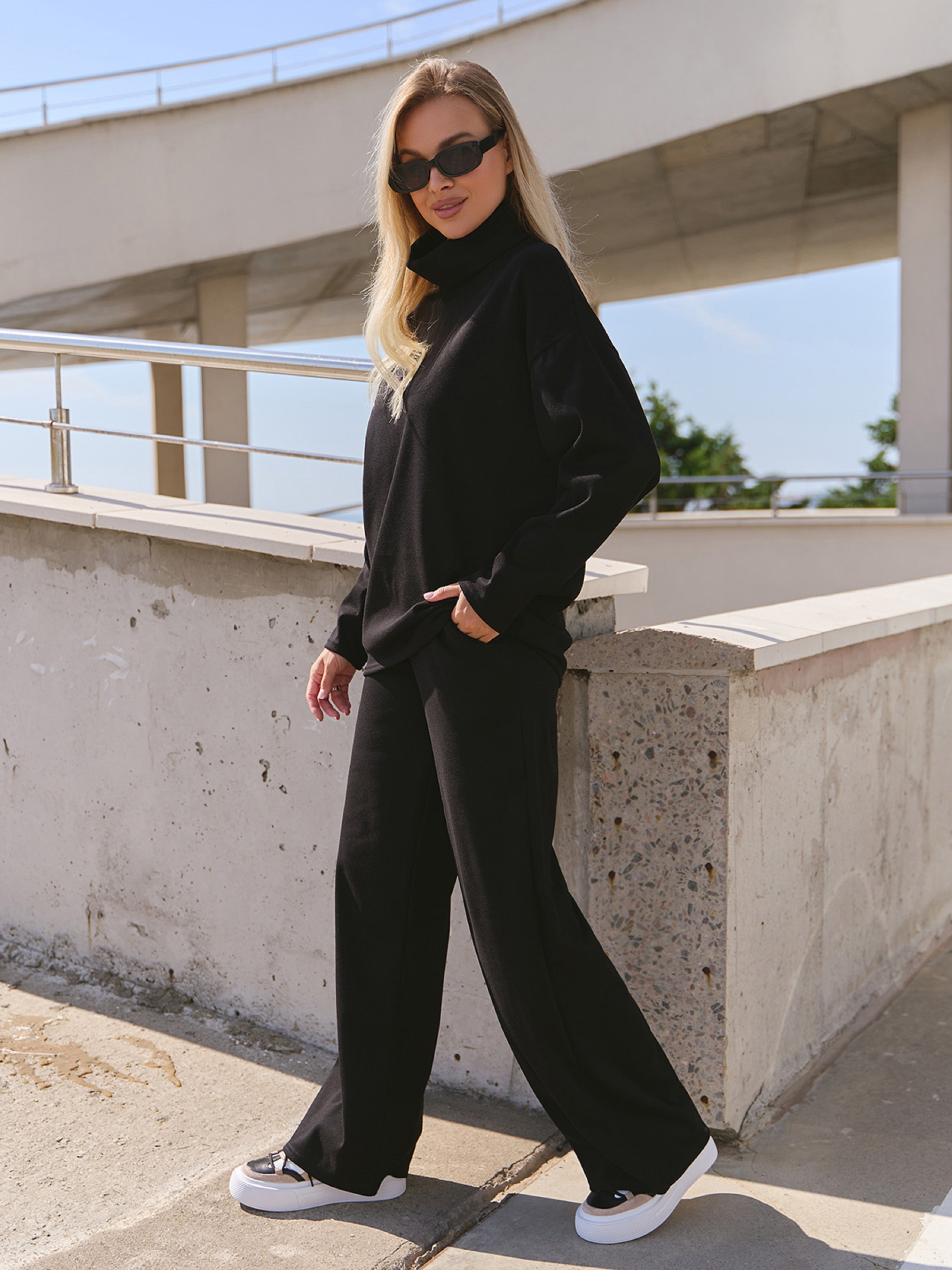 Утепленный брючный костюм свободного кроя, выполненный из черного ангорового трикотажа на флисе. Кофта прямого свободного кроя с длинными рукавами и воротником-хомутом. Брюки широкого прямого кроя с поясной резинкой и карманами. Полуобхват: Кофта: Грудь: S (58), M (60), L (62), XL (64), Длина изделия - 64, Рукав - 57, Брюки: Талия: S (30-370), M (32-39), L (34-41), XL (38-43), Бедра: S (50), M (52), L (54), XL (56), Длина изделия - 107, Длина по внутреннему шву - 79, Ткань: Средней эластичности