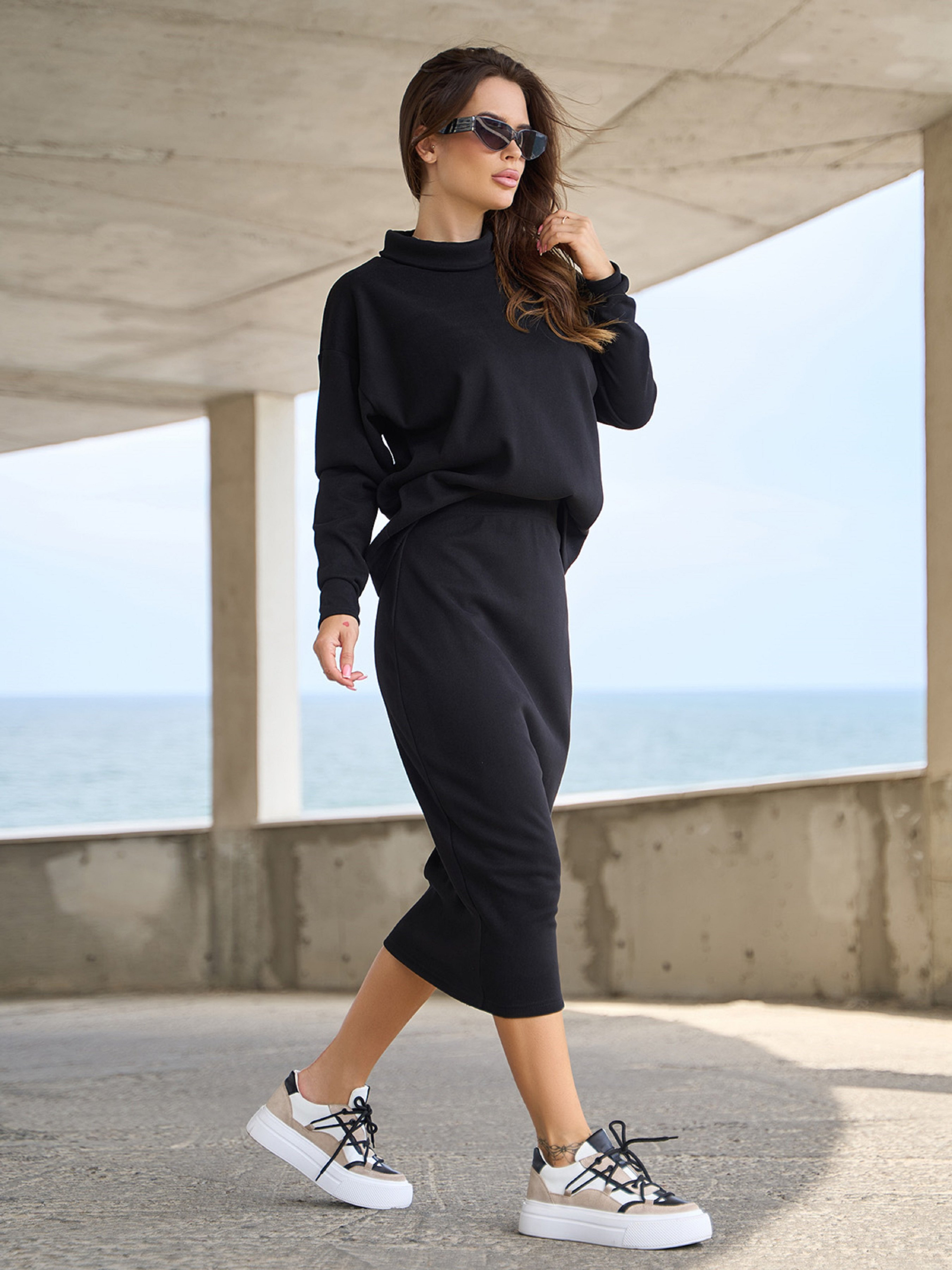 Черный утепленный костюм из ангоры на флисе с воротником-стойкой. Кофта прямого свободного кроя с длинными рукавами. Юбка карандаш прямого кроя с миди длиной и поясной резинкой. Полуобхват: Кофта: Грудь: S (50), M (52), L (54), XL (56), Длина изделия - 62, Рукав - 54, Юбка: Талия: S (30-36), M (32-38), L (34-40), XL (36-42), Бедра: S (47), M (49), L (51), XL (53), Длина изделия - 77, Ткань: Высокой эластичности.