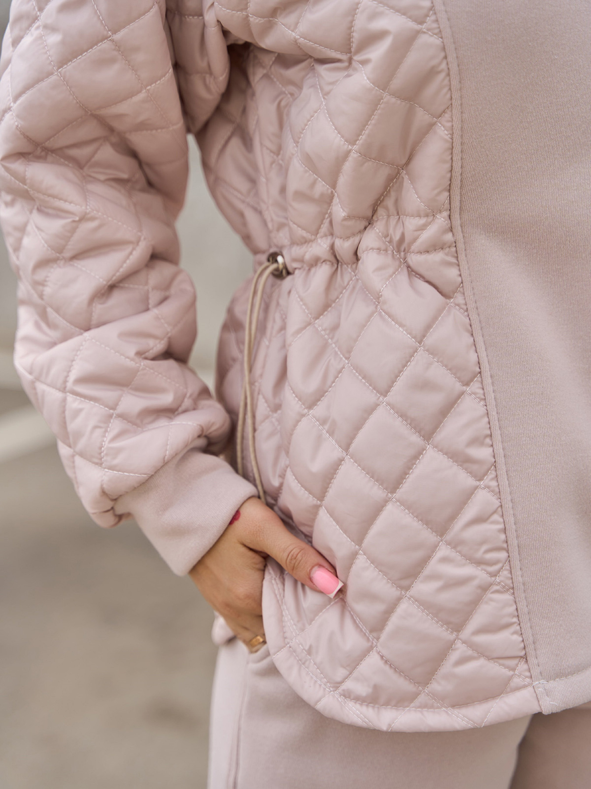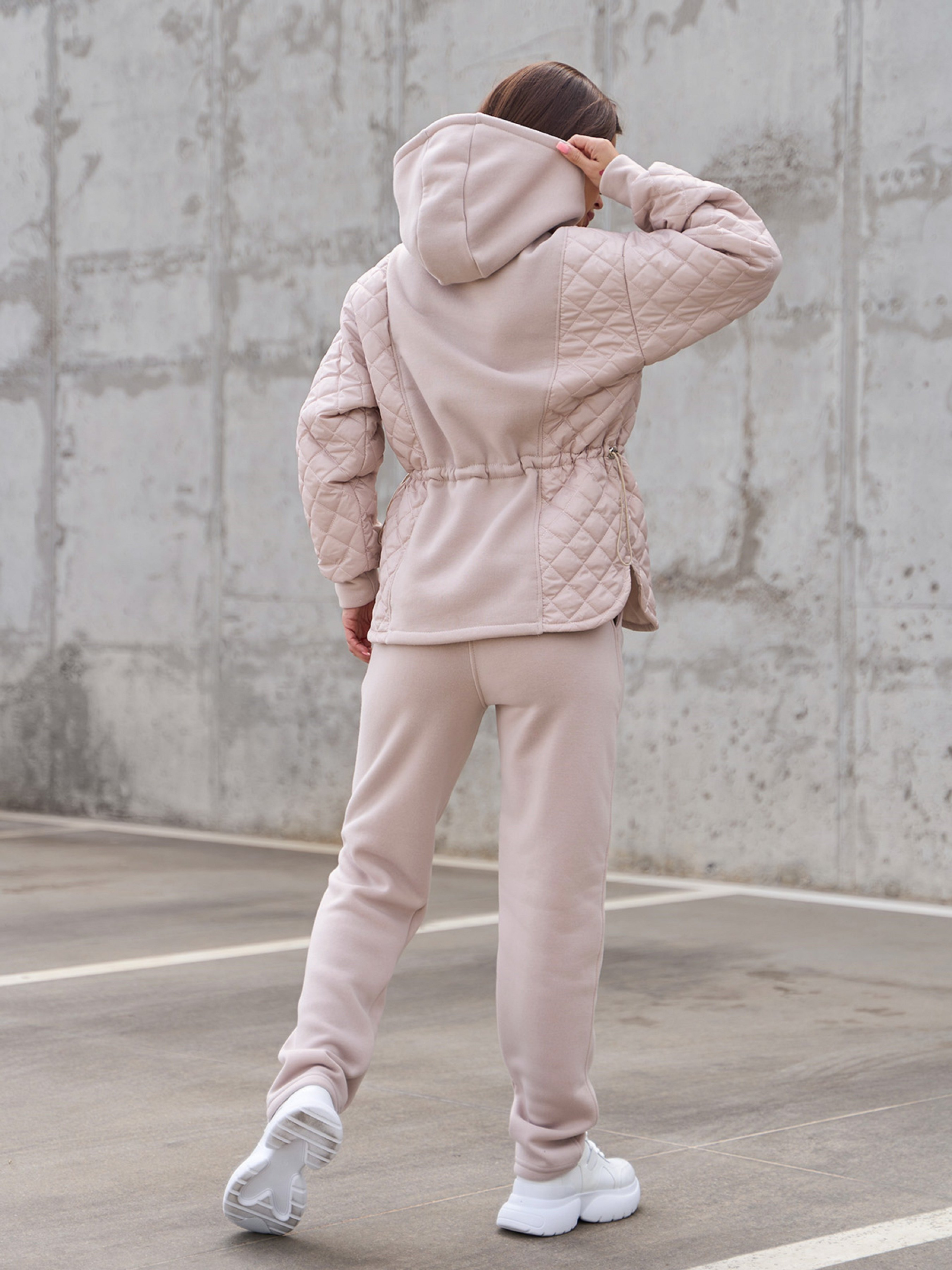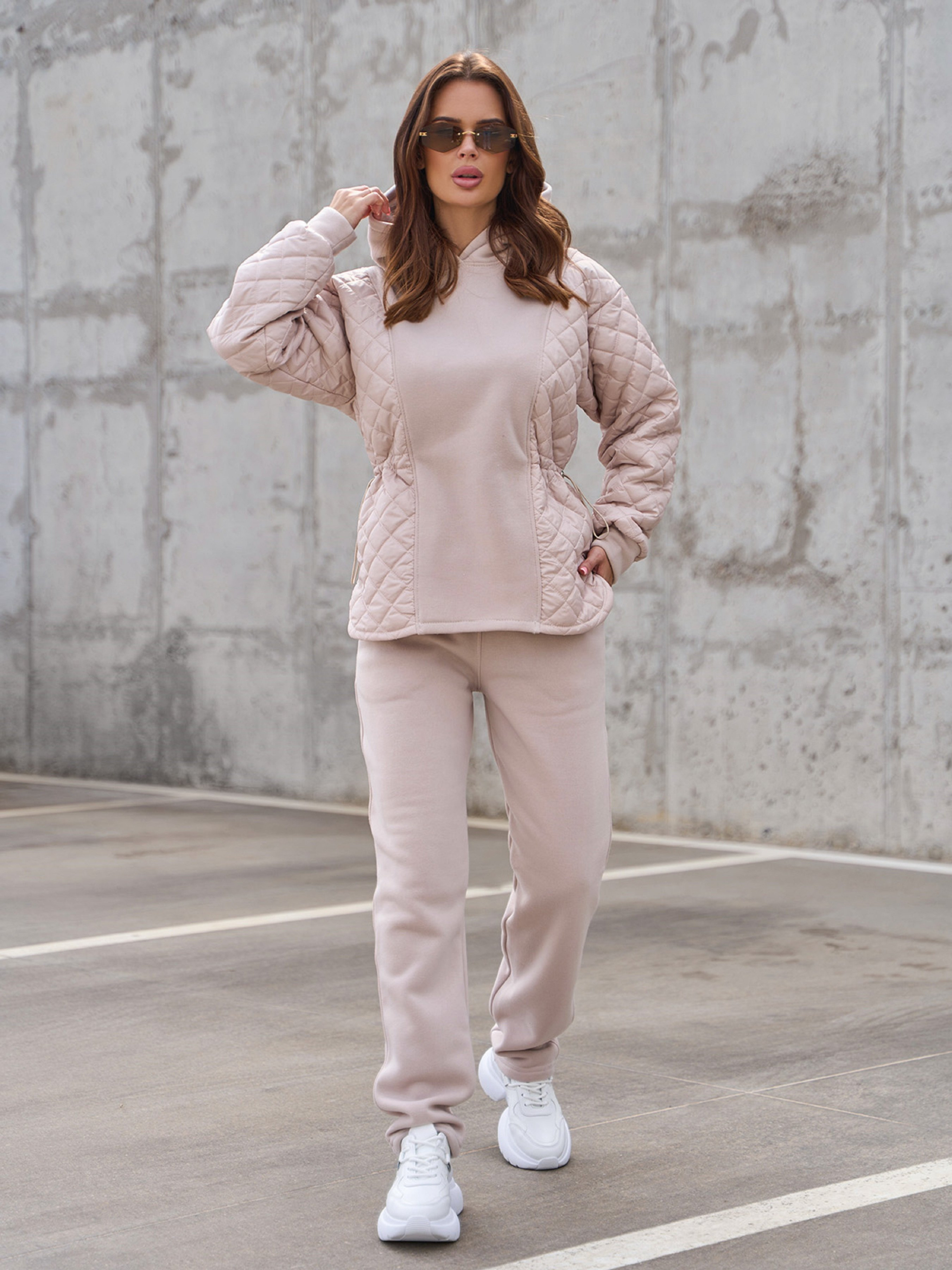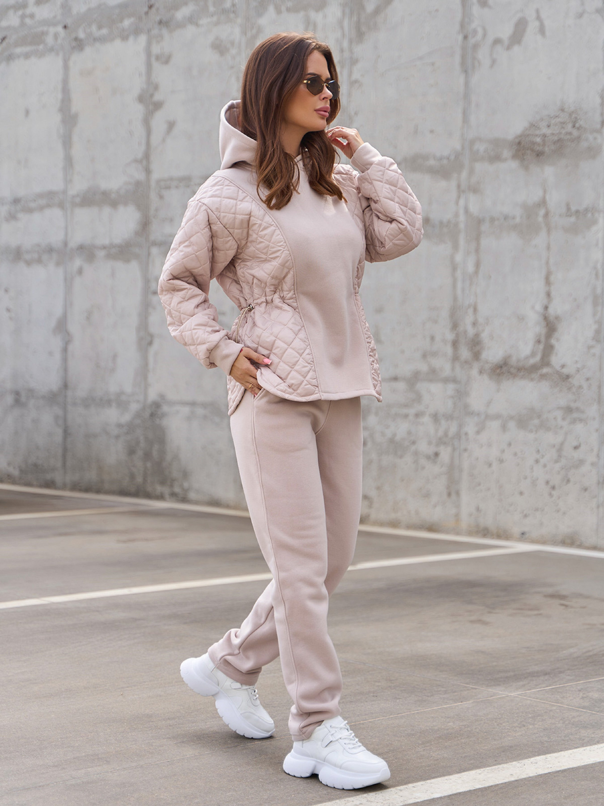 Зимний комбинированный костюм бежевого цвета из трикотажа на флисе и стеганой плащевки на тонком синтепоне. Толстовка удлиненного кроя с длинными рукавами и капюшоном. Изделие с кулиской на талии, скругленным кроем низа и боковыми симметричными разрезами. Прямые брюки с поясной резинкой и карманами. Полуобхват: Кофта: Грудь: S (52), M (54), L (56), XL (58), Длина изделия - 64, Рукав - 53, Брюки: Талия: S (30-38), M (32-40), L (34-42), XL (36-44), Бедра: S (48), M (50), L (52), XL (54), Длина изделия - 106, Длина по внутреннему шву - 76, Ткань: Низкой эластичности.