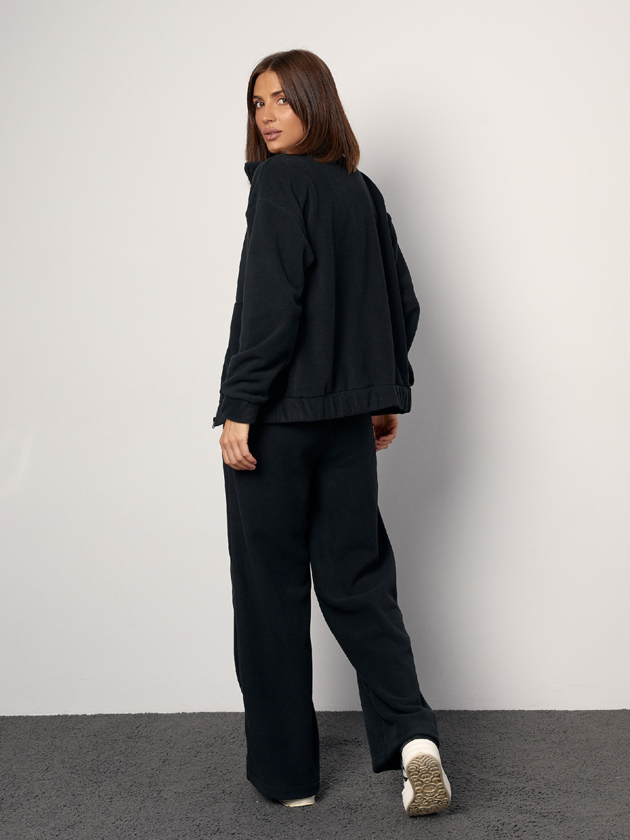 Черный флисовый костюм в спортивном стиле с толстовкой на молнии. Толстовка прямого свободного кроя с воротником-стойкой, длинными рукавами и передними карманами. Широкие брюки высокой посадки с поясной резинкой и боковыми карманами. Полуобхват: Кофта: Грудь: S (51), M (53), L (55), XL (57), Длина изделия - 62, Рукав - 54, Брюки: Талия: S (32-40), M (34-42), L (36-44), XL (38-46), Бедра: S (53), M (55), L (57), XL (59), Длина изделия - 104, Длина по внутреннему шву - 74, Ткань: Низкой эластичности.