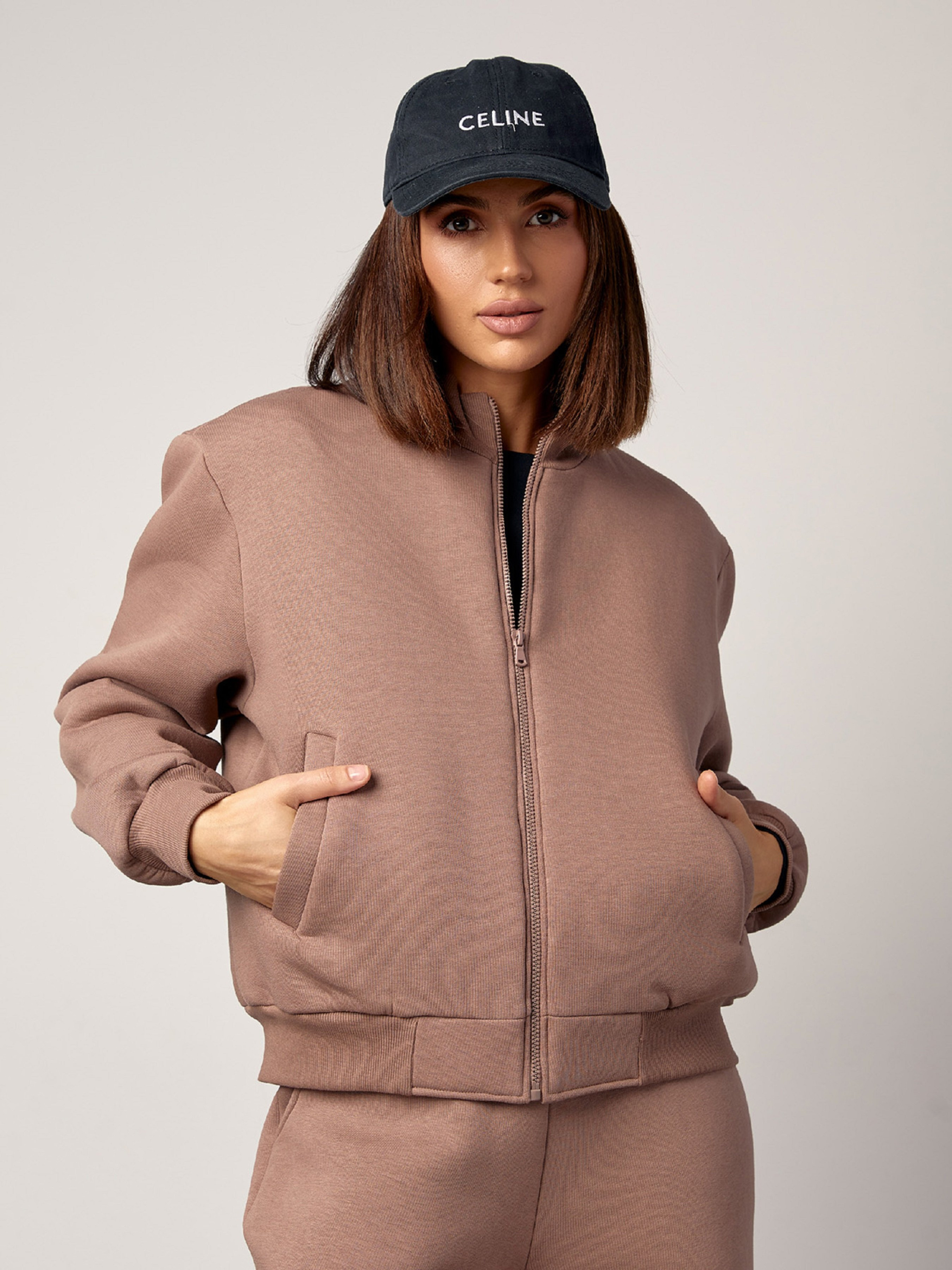 Свободный костюм из коричневого однотонного трикотажа на флисе с толстовкой на молнии и манжетами. Толстовка прямого кроя с воротником-стойкой, длинными рукавами и карманами. Широкие брюки высокой посадки с поясной резинкой и карманами. Полуобхват: Кофта: Грудь: S (58), M (60), L (62), XL (64), Длина изделия - 57, Рукав - 59, Брюки: Талия: S (32-40), M (34-42), L (36-44), XL (38-46), Бедра: S (53), M (55), L (57), XL (59), Длина изделия - 109, Длина по внутреннему шву - 78, Ткань: Низкой эластичности.