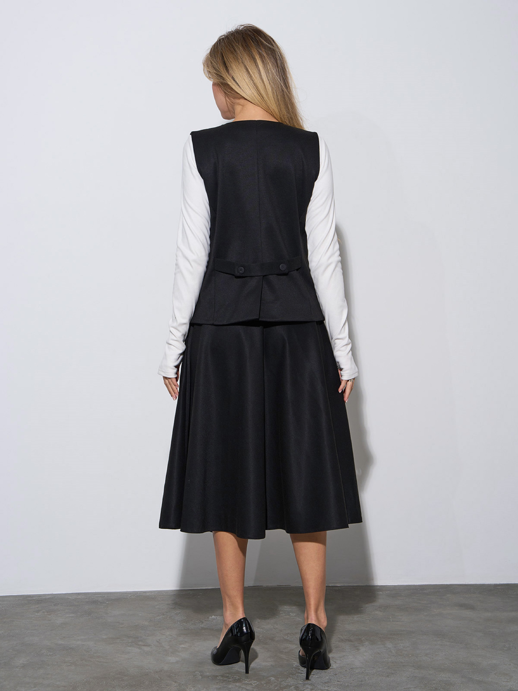 Утепленный костюм из черной шерсти с расклешенной юбкой и асимметричной жилеткой. Жилетка на пуговицах с регулируемым фиксатором сзади. Юбка миди длины с карманами и боковой молнией. Юбка оснащена съемным поясом, костюм без нижнего подклада. Полуобхват: Жилет: Грудь: S (46), M (48), L (50), XL (52), Длина изделия - 64, Юбка: Талия: S (35), M (37), L (39), XL (41), Бедра: S (60), M (62), L (64), XL (66), Длина изделия - 75, Ткань: Низкой эластичности.