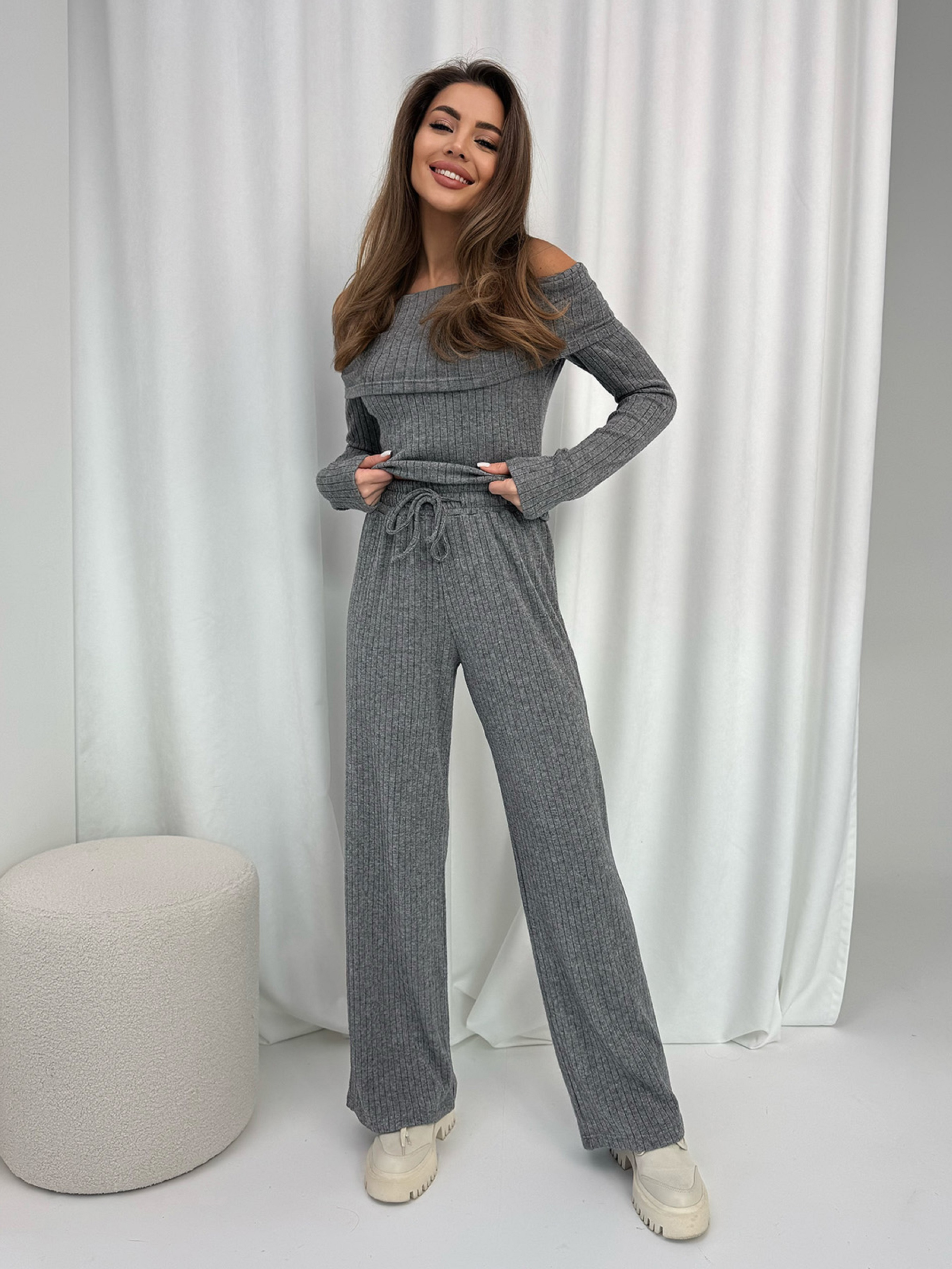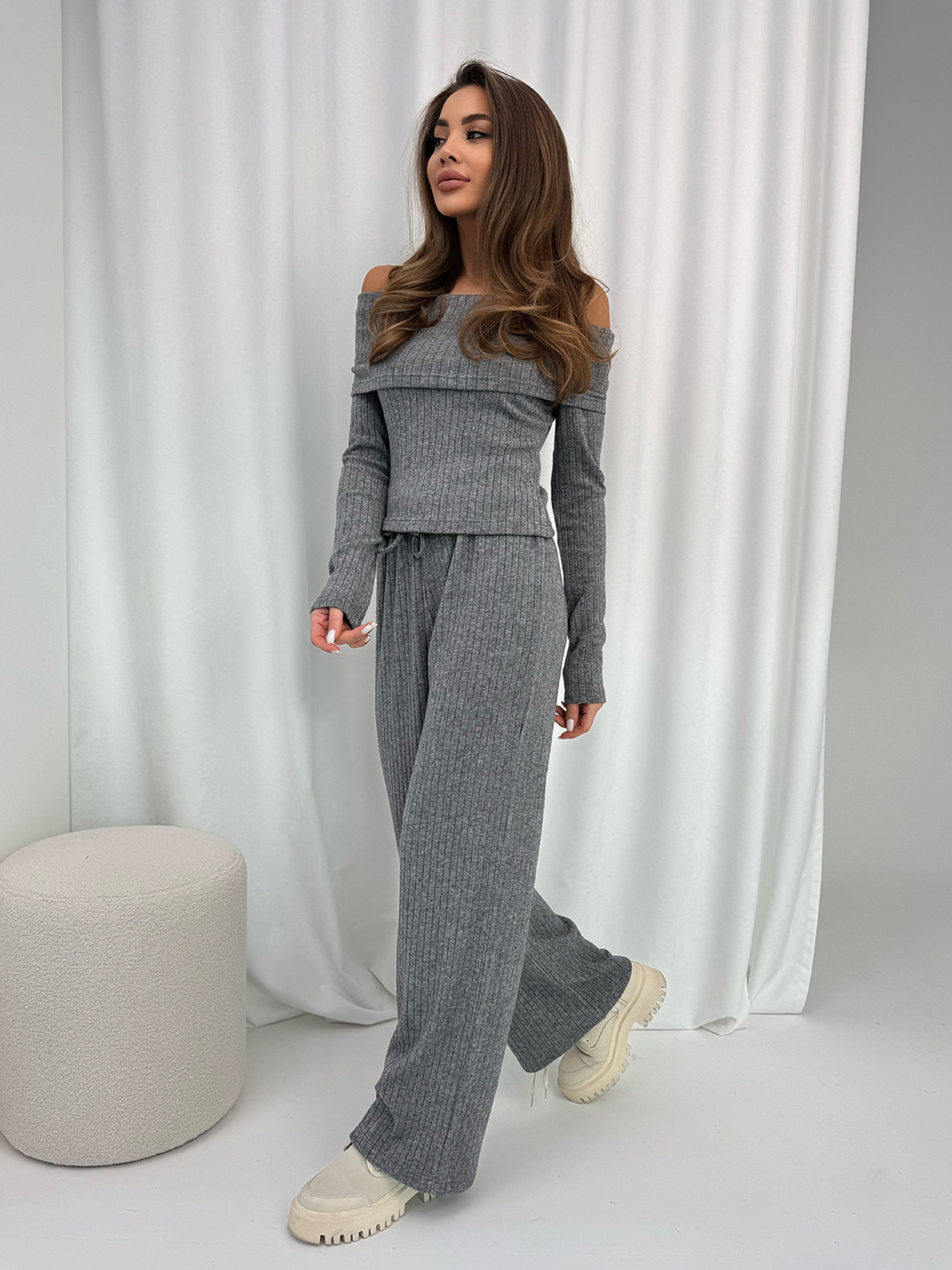 Молодежный костюм из серого ангорового трикотажа в рубчик с открытыми плечами и отворотом. Костюм с длинными рукавами и облегающим кроем верха. Брюки на резинке с широким прямым кроем. Полуобхват: Кофта: Грудь: S (38), M (39), L (41), XL (46), Длина изделия - 47, Рукав - 59, Брюки: Талия: S (29-55), M (31-58), L (33-59), XL (36-46), Бедра: S (47), M (47-53*), L (52), XL (56), Длина изделия - 108, Длина по внутреннему шву - 80, Ткань: Высокой эластичности.
