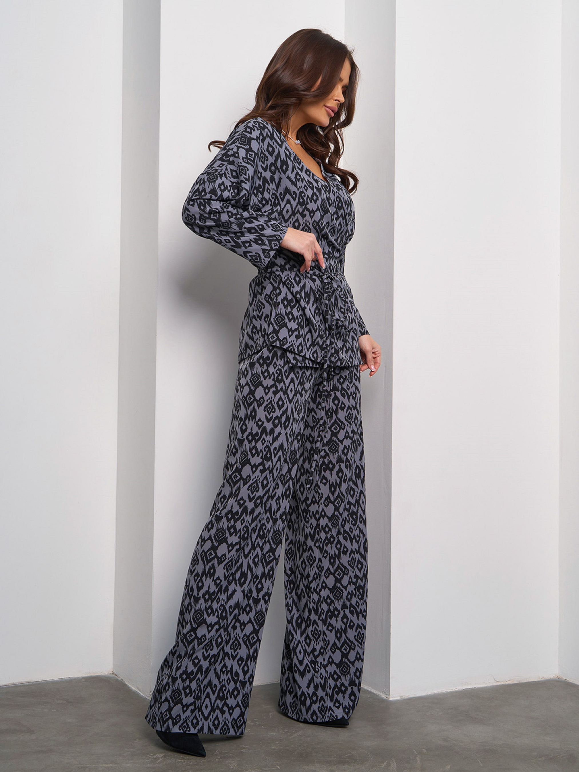 Свободный брючный костюм-кимоно, выполненный из софта серого цвета с орнаментом. Блуза кроя на запах с втачным поясом и боковыми разрезами. Изделие с приспущенными рукавами длиной 3/4 и V-образной горловиной. Брюки прямого широкого кроя с резинкой на поясе. Полуобхват: Блузка: Грудь: S (58), M (60), L (62), XL (64), Длина изделия - 66, Рукав - 34, Брюки: Талия: S (32-39), M (34-41), L (36-43), XL (38-45), Бедра: S (52), M (54), L (56), XL (58), Длина изделия - 113, Длина по внутреннему шву - 83, Ткань: Низкой эластичности.