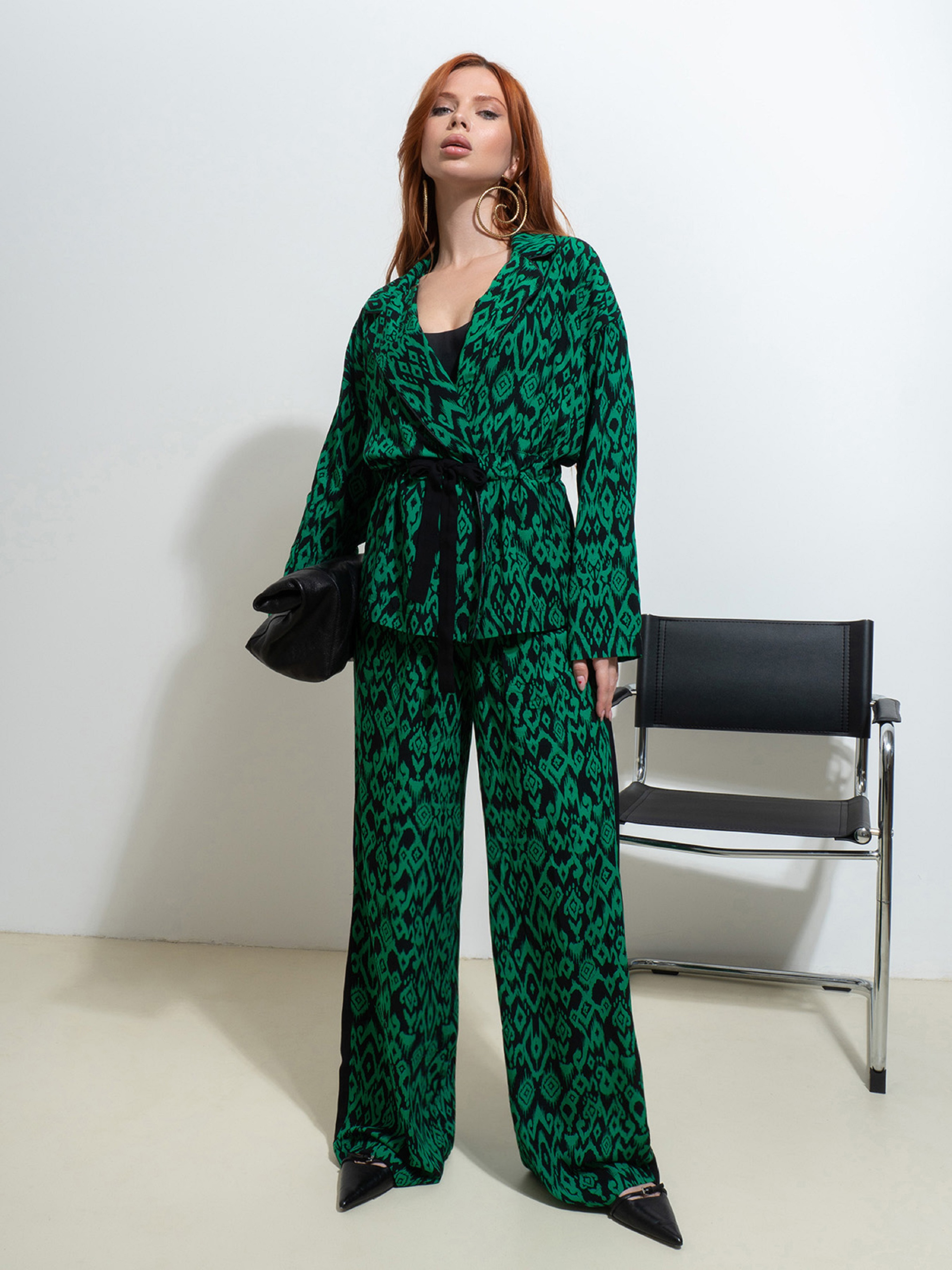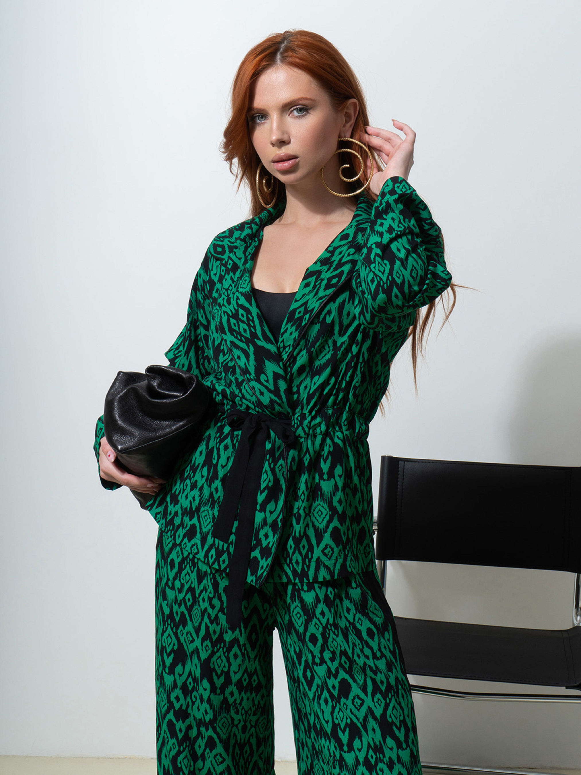 Зеленый яркий костюм из принтованного софта с боковыми лампасами. Блузка-пиджак с кулиской на талии, длинными рукавами и английским воротником. Брюки на резинке с высокой посадкой и прямым широким кроем. Полуобхват: Кофта: Грудь: S (55), M (56), L (59), XL (59), Длина изделия - 64, Рукав - 52, Брюки: Талия: S (31-50), M (33-52), L (35-55), XL (37-57), Бедра: S (55), M (57), L (58), XL (62), Длина изделия - 108, Длина по внутреннему шву - 78, Ткань: Низкой эластичности.