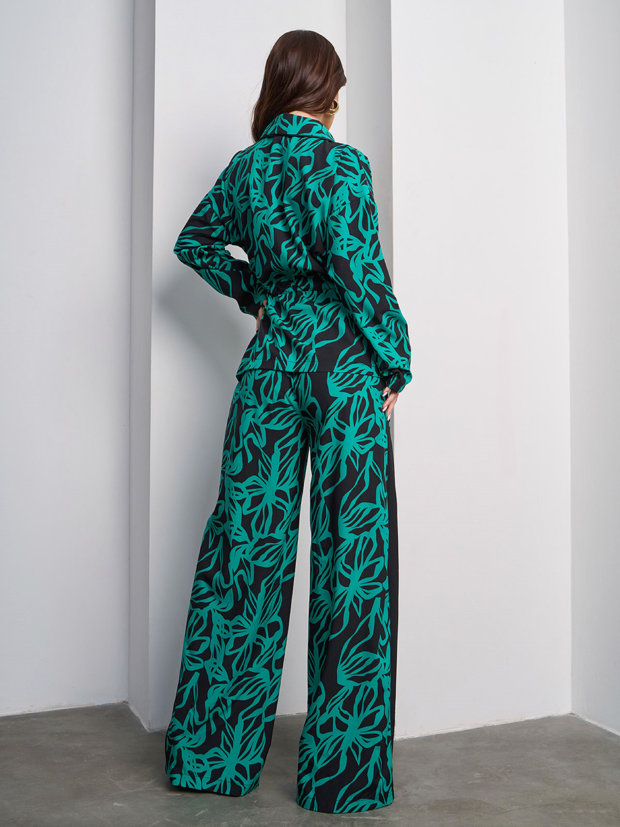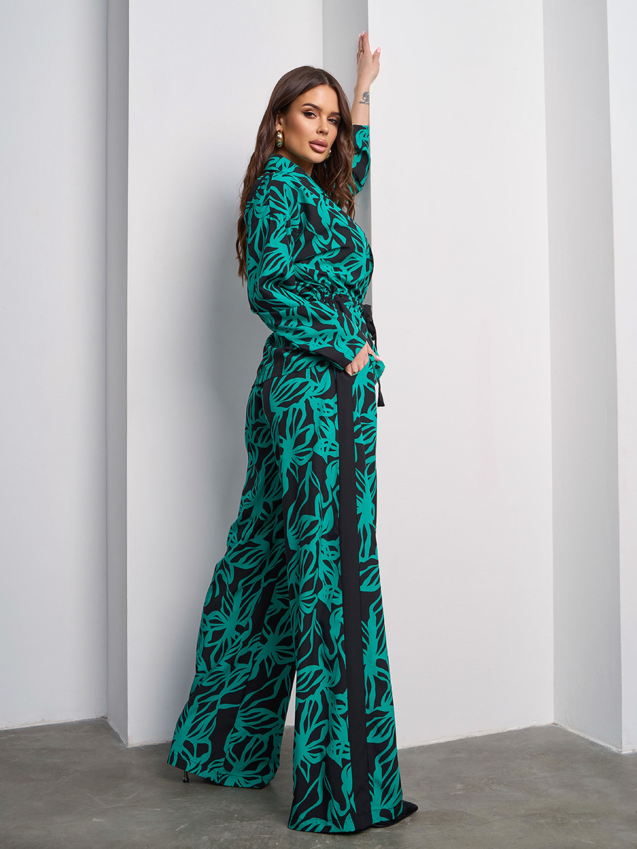 Зелено-черный костюм-кимоно с лампасами, выполненный из софта с крупным принтом. Верх костюма на кулиске, с длинными рукавами и английским воротником. Брюки на резинке с высокой посадкой и прямым широким кроем. Полуобхват: Кофта: Грудь: S (55), M (56), L (59), XL (59), Длина изделия - 64, Рукав - 52, Брюки: Талия: S (31-50), M (33-52), L (35-55), XL (37-57), Бедра: S (55), M (57), L (59), XL (61), Длина изделия - 110, Длина по внутреннему шву - 78, Ткань: Низкой эластичности.