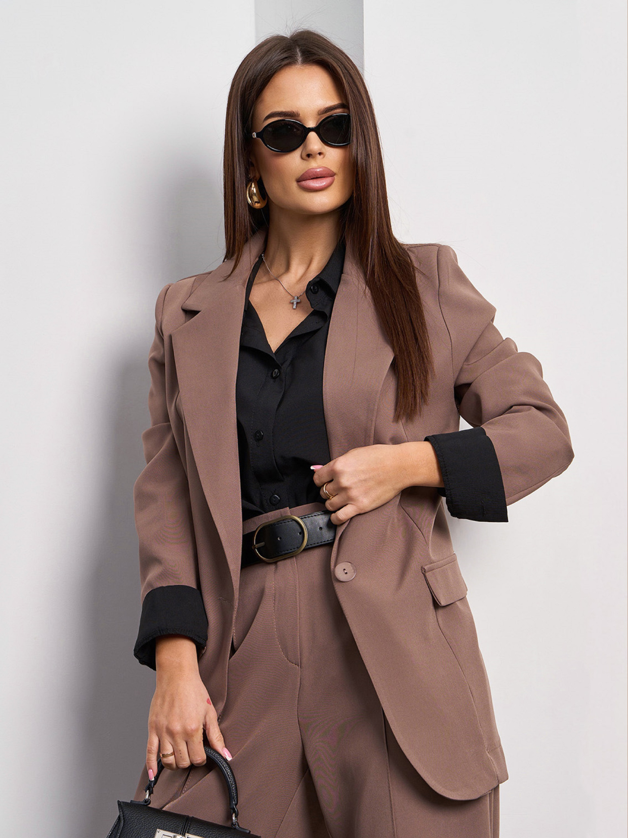 Классический костюм коричневого цвета из костюмной ткани с брюками прямого широкого кроя. Пиджак с длинными рукавами и декоративными клапанами оснащен подплечниками и английским воротником. Брюки со стрелками и карманами. Модель на пуговице и молнии оснащена резинкой сзади. Полуобхват: Пиджак: Грудь: S (47), M (49), L (51), XL (54), Длина изделия - 73, Рукав - 63, Брюки: Талия: S (31), M (32), L (36), XL (34-38*), Бедра: S (52), M (54), L (56), XL (60), Длина изделия - 110, Длина по внутреннему шву - 80, Ткань: Низкой эластичности. Состав: 59% полиэстер, 21% эластан, 20% хлопок