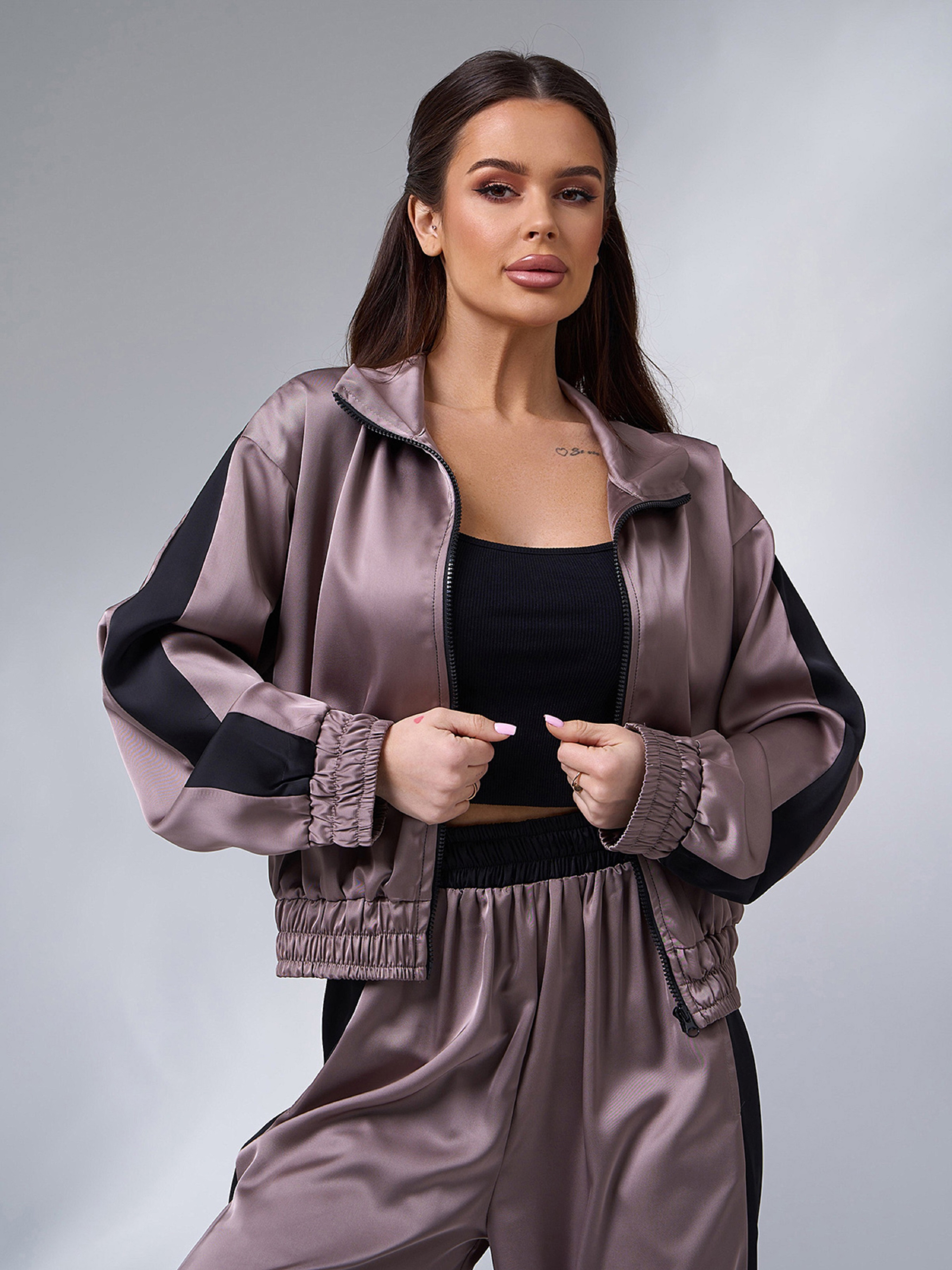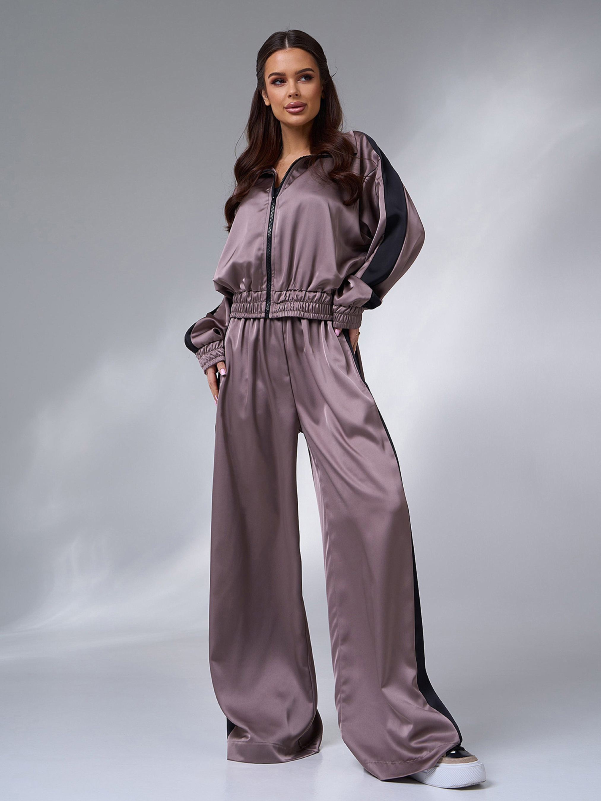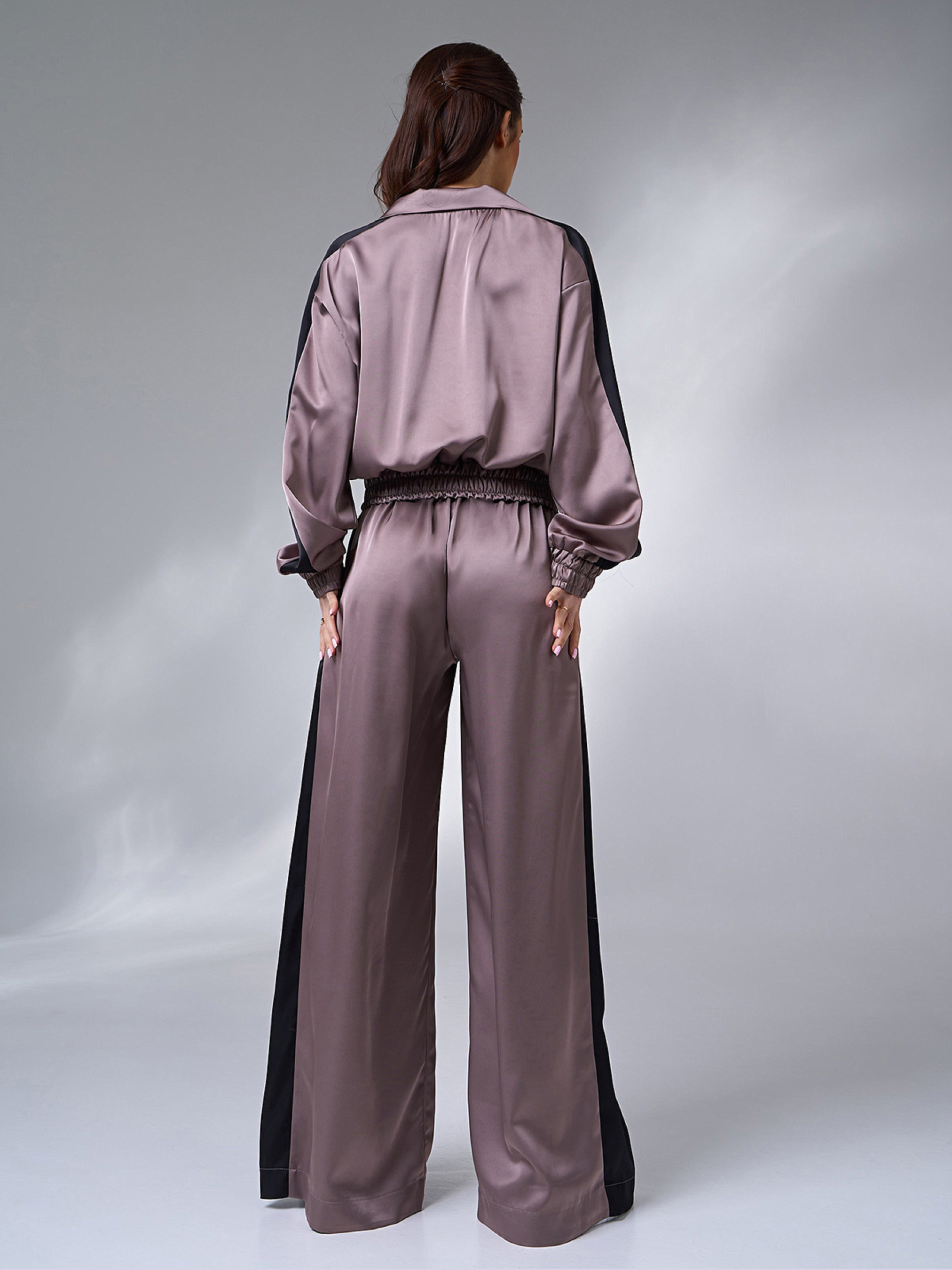Шелковый темно-бежевый костюм двойка, декорированный широкими боковыми лампасами. Верх на молнии с эластичными манжетами, длинными рукавами и воротником-стойкой. Брюки широкого кроя с поясной резинкой и высокой посадкой. Полуобхват: Кофта: Грудь: S (58), M (60), L (62), XL (64), Длина изделия - 53, Рукав - 53, Брюки: Талия: S (31-40), M (33-42), L (35-44), XL (37-46), Бедра: S (60), M (62), L (64), XL (66), Длина изделия - 110, Длина по внутреннему шву - 78, Ткань: Низкой эластичности. Состав: 80% шёлк, 20% полиэстер
