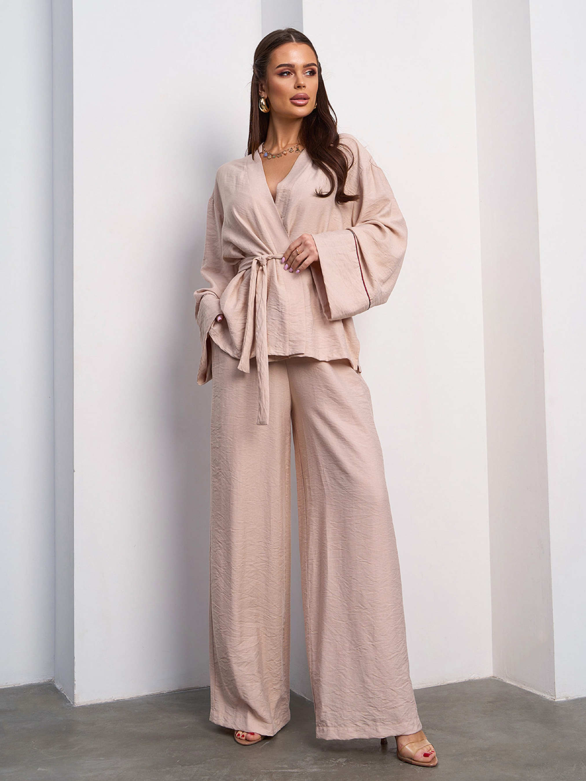 Бежевый льняной костюм-кимоно с блузой на запах. Полуобхват: Блузка: Грудь: S (54), M (56), L (58), XL (60), Длина изделия - 64, Рукав - 53, Брюки: Талия: S (29-39), M (31-41), L (33-43), XL (35-45), Бедра: S (52), M (54), L (56), XL (58), Длина изделия - 104, Длина по внутреннему шву - 73, Ткань: Низкой эластичности. Состав: 65% лен, 20% хлопок, 15% полиэстер
