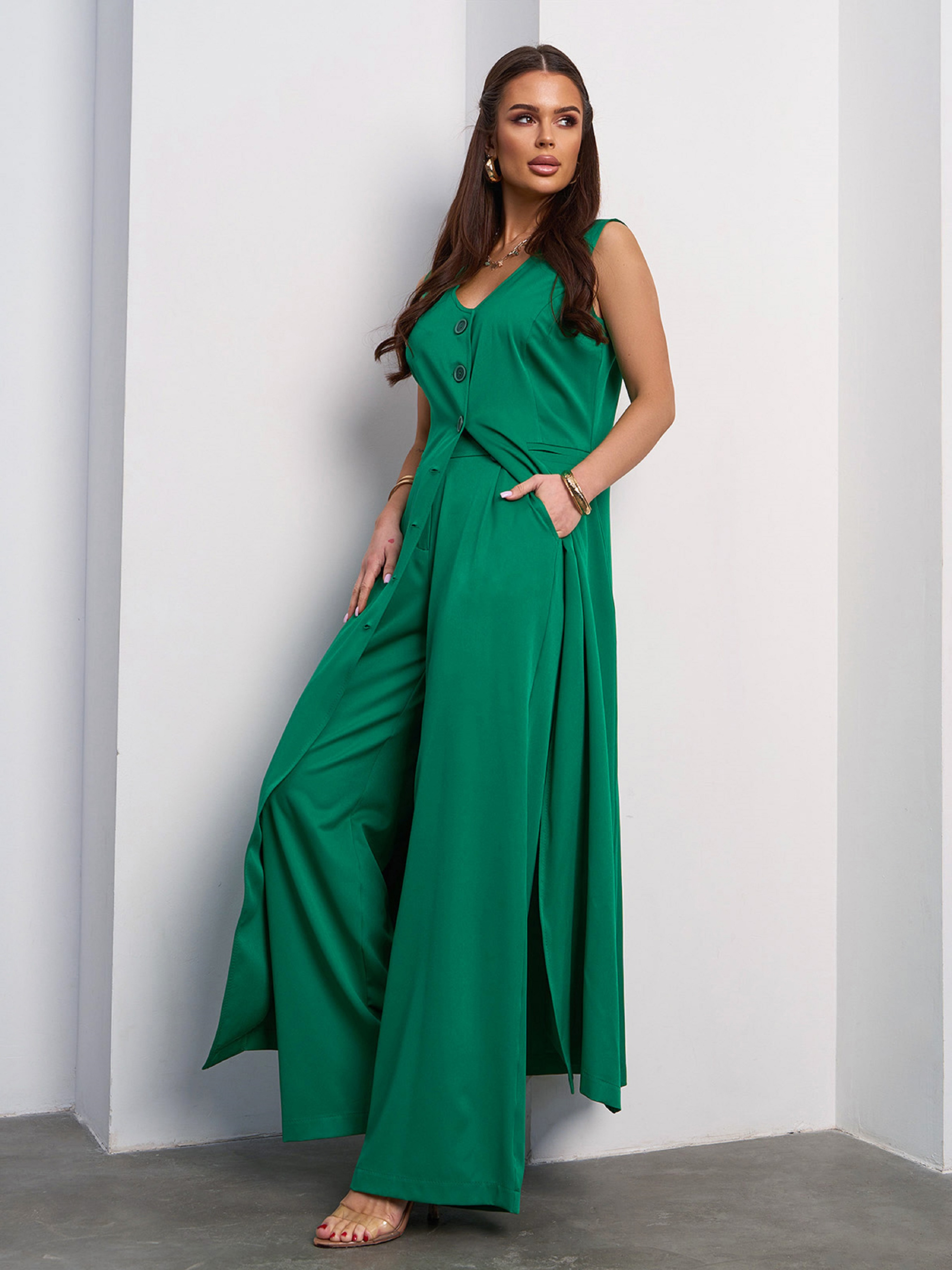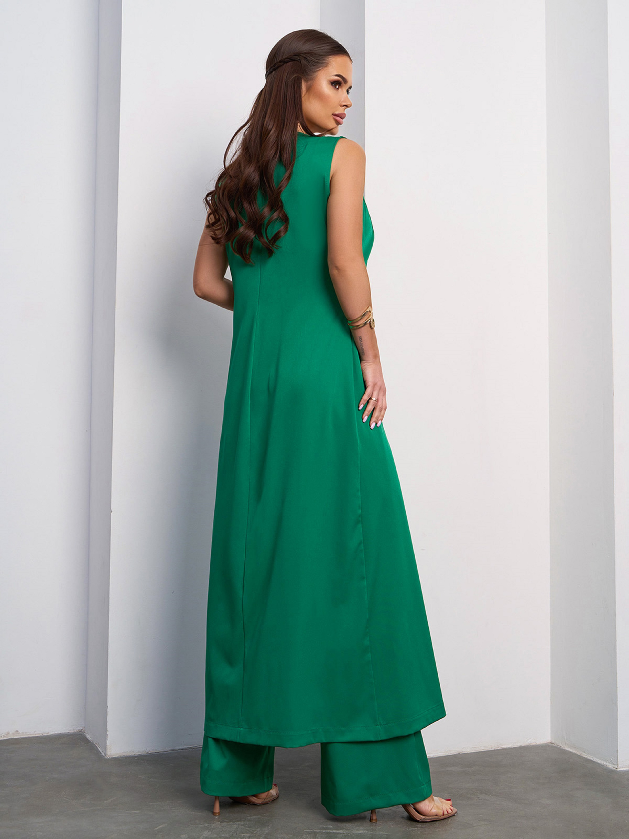 Зеленый брючный костюм с длинной туникой. Полуобхват: Туника: Грудь: S (48), M (50), L (52), XL (54), Талия: S (40), M (42), L (44), XL (46), Бедра: S (52), M (54), L (56), XL (58), Длина изделия - 128, Брюки: Талия: S (32), M (34), L (36), XL (38), Бедра: S (51), M (53), L (55), XL (57), Длина изделия - 103, Длина по внутреннему шву - 74, Состав: 59% полиэстер, 21% эластан, 20% хлопок