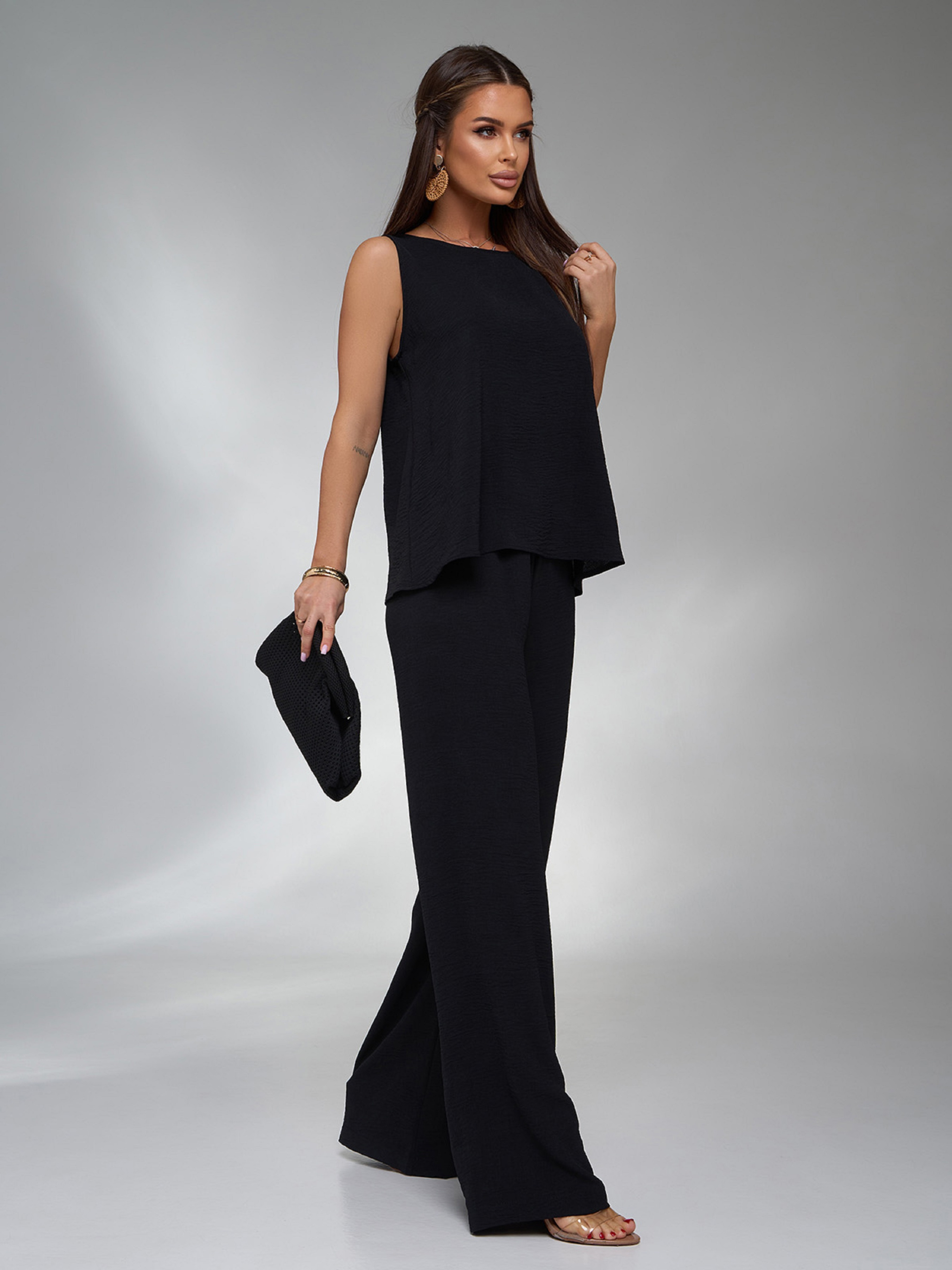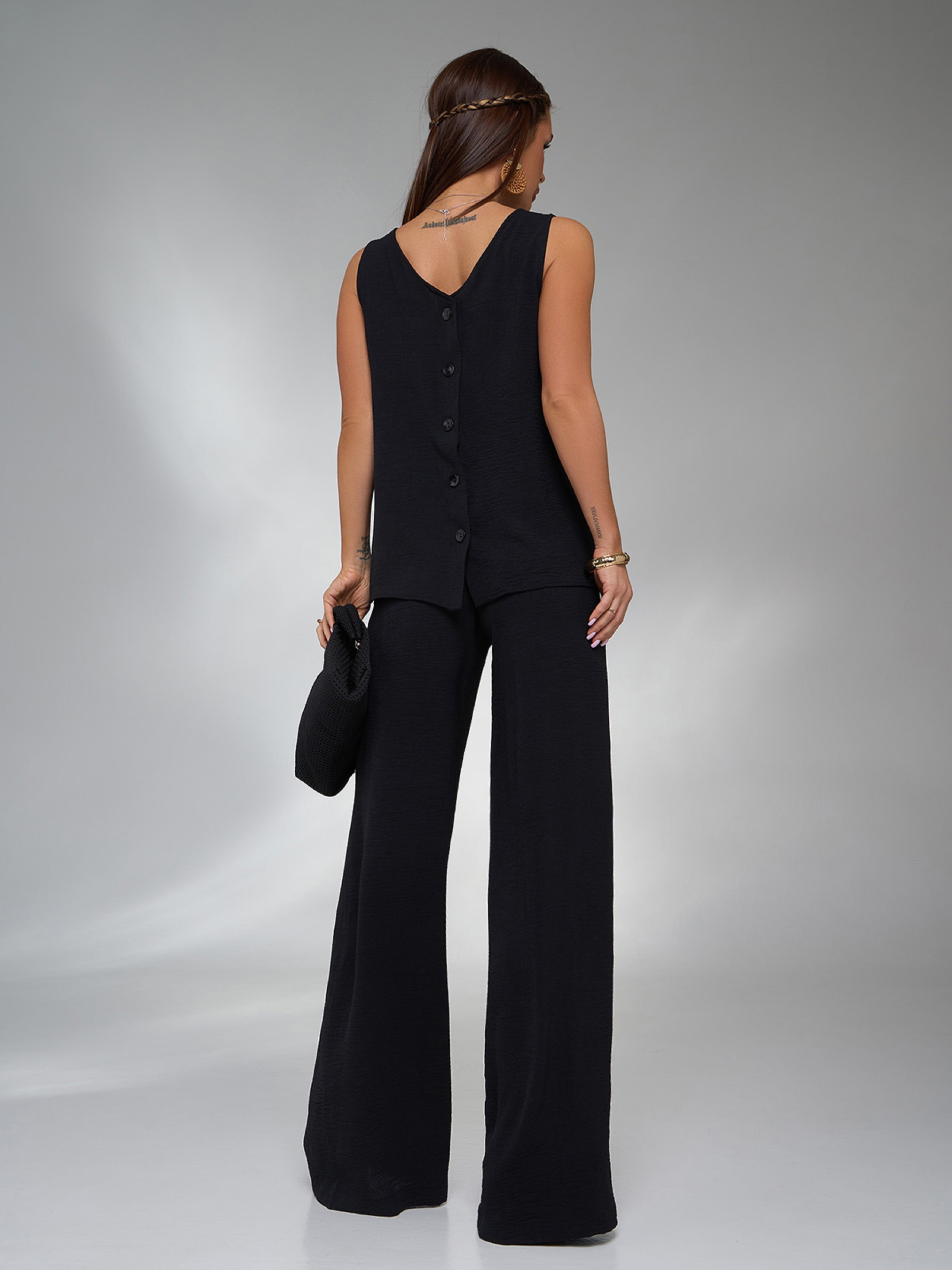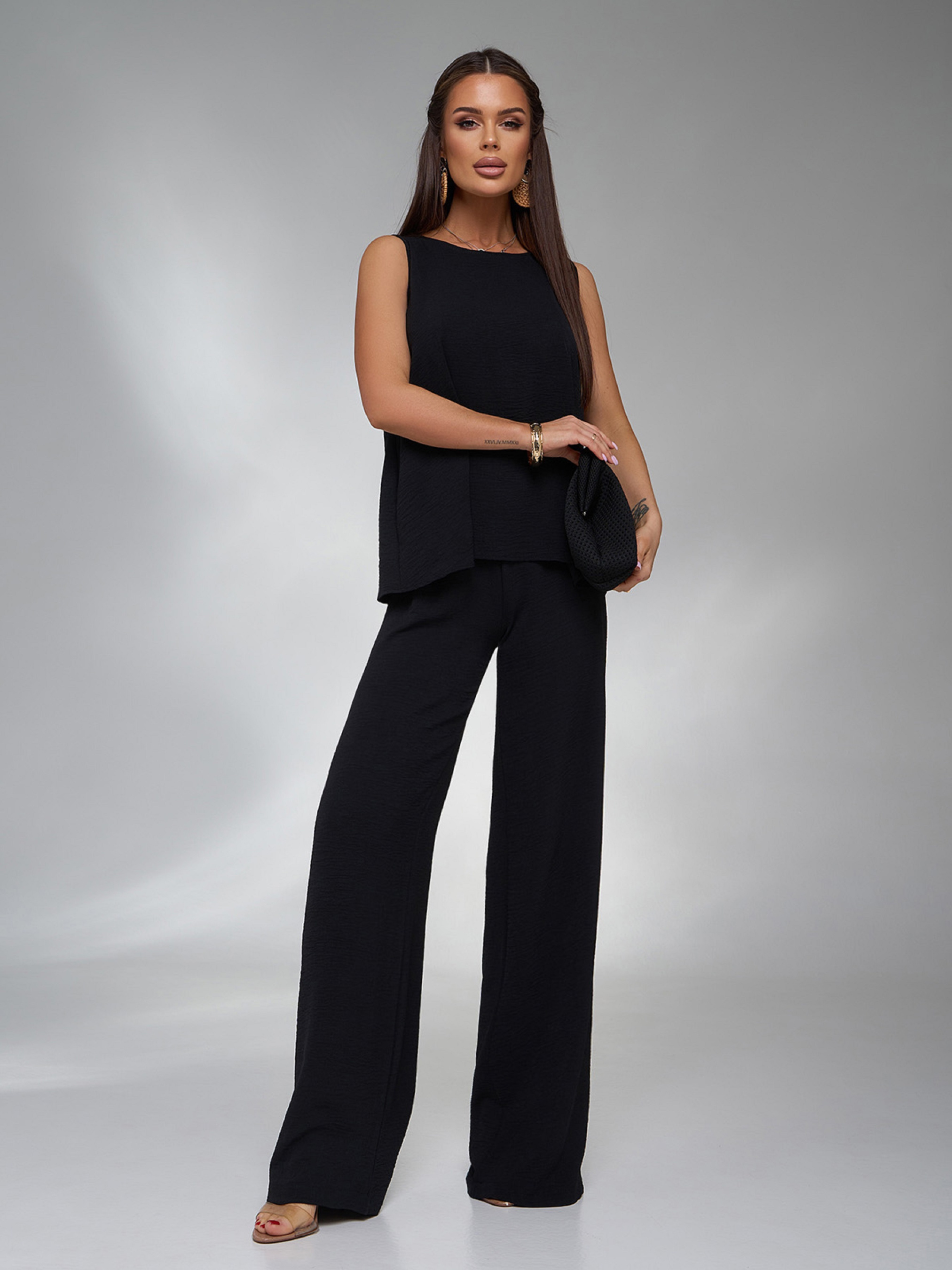 Черный брючный костюм со свободной блузой. Полуобхват: Блузка: Грудь: S (49), M (51), L (53), XL (55), Длина изделия - 57, Брюки: Талия: S (32-39), M (34-41), L (36-43), XL (38-45), Бедра: S (52), M (54), L (56), XL (58), Длина изделия - 110, Длина по внутреннему шву - 79, Ткань: Низкой эластичности. Состав: 59% полиэстер, 21% эластан, 20% хлопок
