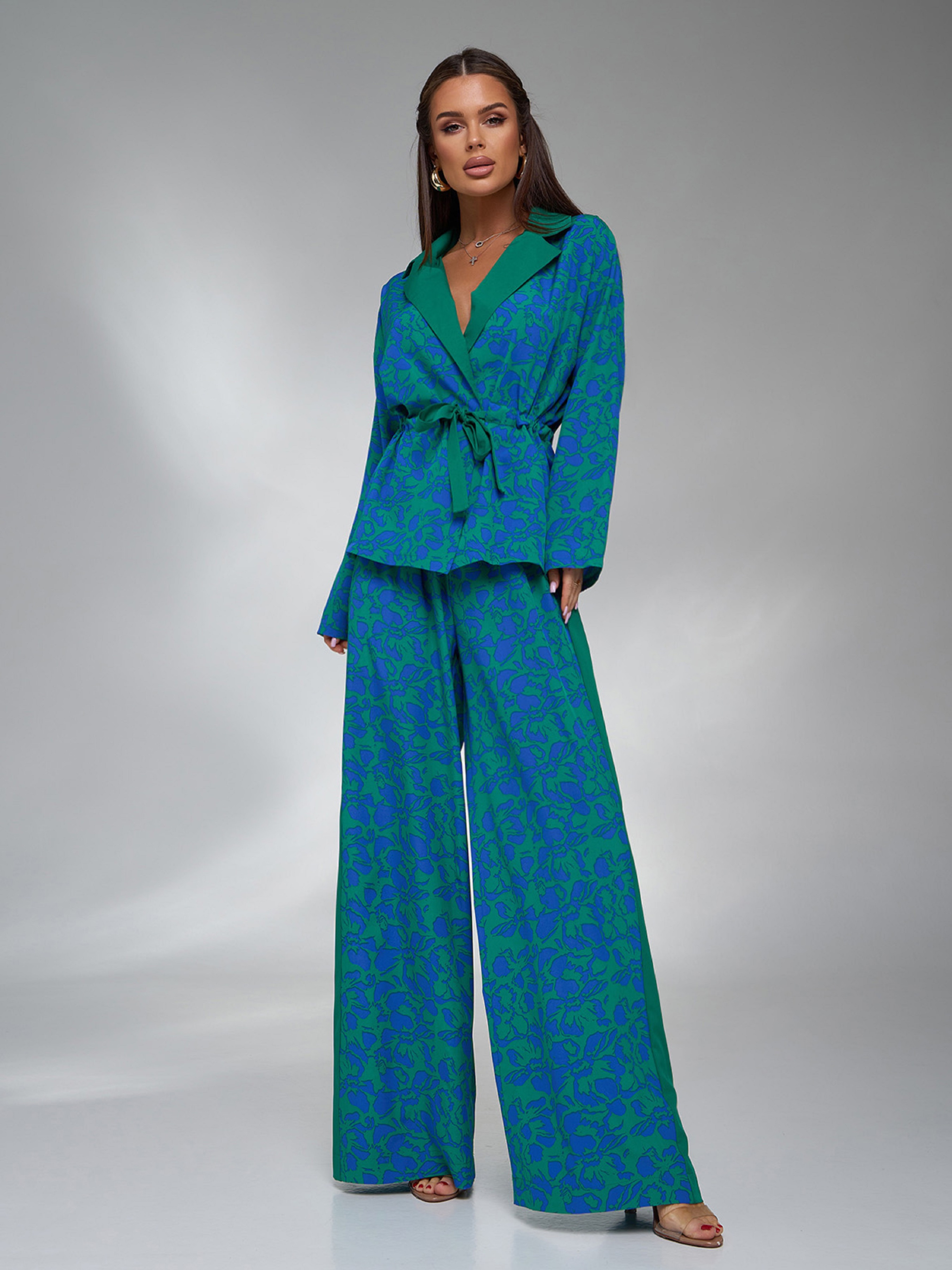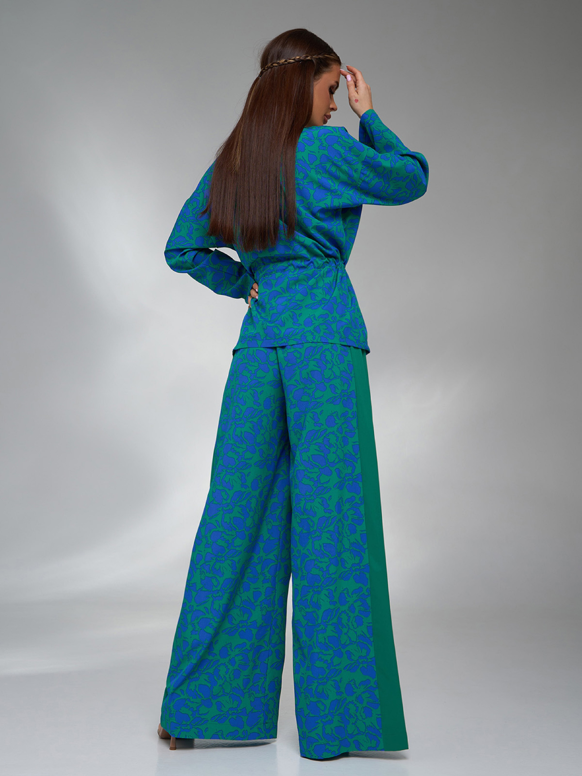 Зелено-синий костюм-кимоно с лампасами. Полуобхват: Кофта: Грудь: S (50), M (52), L (54), XL (56), Длина изделия - 65, Рукав - 50, Брюки: Талия: S (30-48), M (32-49), L (33-52), XL (37-53), Бедра: S (54), M (56), L (59), XL (61), Длина изделия - 107, Длина по внутреннему шву - 76, Ткань: Низкой эластичности. Состав: 59% полиэстер, 21% эластан, 20% хлопок
