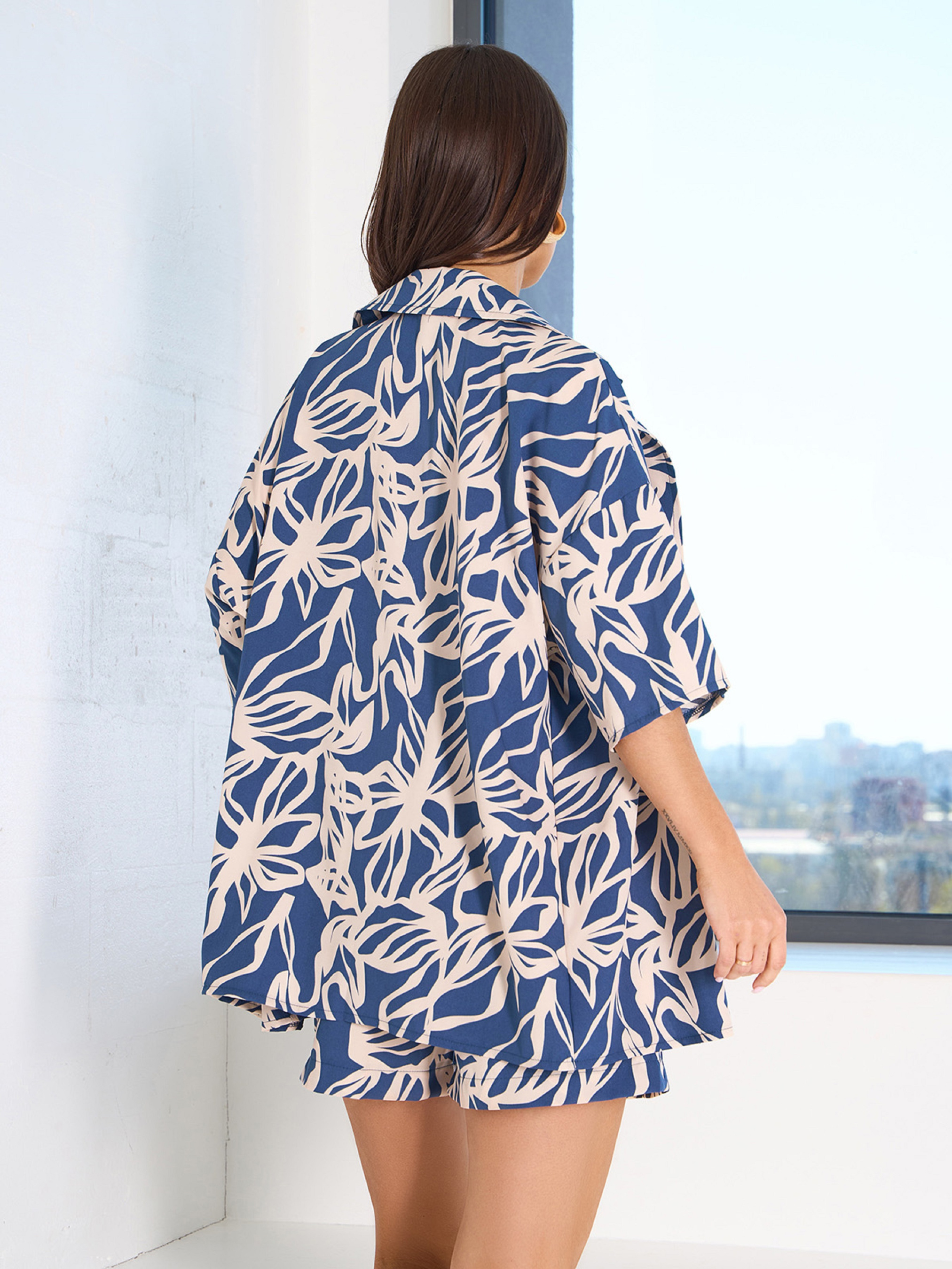 Сине-бежевый оверсайз костюм из принтованного софта с удлиненной свободной рубашкой. Рубашка на пуговицах с рукавами до локтей и английским воротником. Шорты высокой посадки с нашивкой на широкой поясной резинке. Шорты с карманами и декоративными пуговицами. Полуобхват: Рубашка: Грудь: S (62), M (64), L (66), XL (68), Длина изделия - 72, Рукав - 24, Шорты: Талия: S (32-42), M (34-44), L (36-46), XL (38-48), Бедра: S (56), M (58), L (60), XL (62), Длина изделия - 42, Ткань: Низкой эластичности. Состав: 59% полиэстер, 21% эластан, 20% хлопок