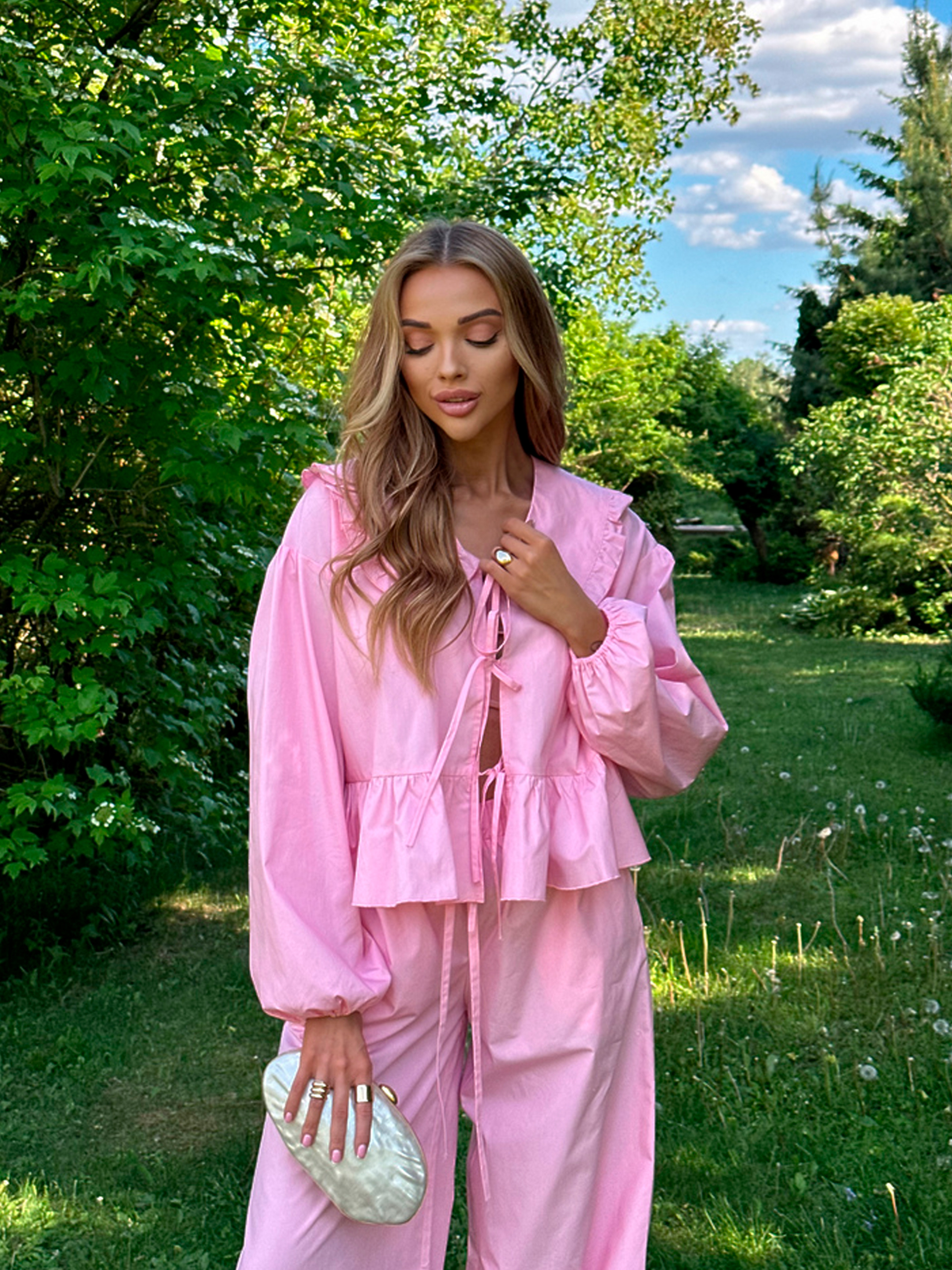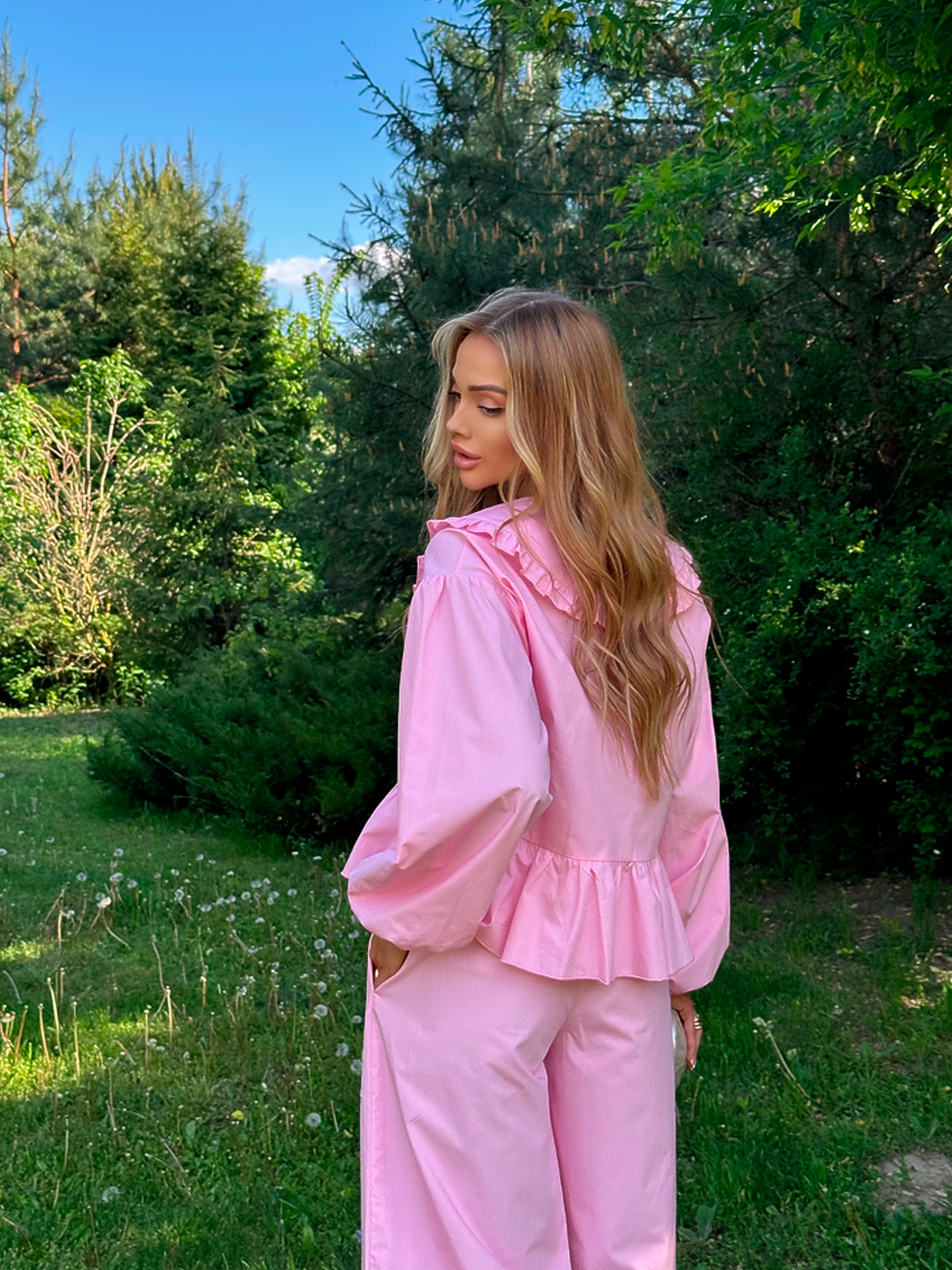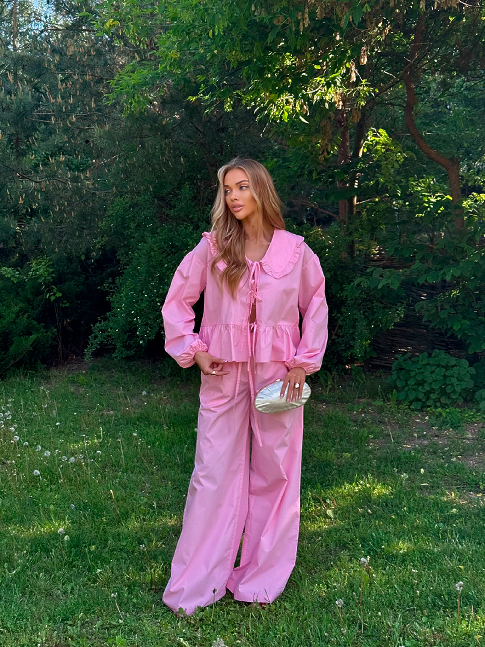 Характеристики: Тканина: 100% бавовна Розмір: one size (XS/M) Колір: молоко, чорний, масло, оливка, рожевий Особливості та характеристики: Вільний крій забезпечує свободу рухів і комфорт протягом усього дня; Легка та дихаюча бавовна ідеальна для спекотного літнього сезону; Блуза має класичний комірець і простий силует, що легко поєднується з брюками; Брюки з еластичною талією забезпечують зручність і не обмежують рухів; Костюм універсальний, легко комбінується з іншими елементами гардеробу; М’які натуральні матеріали підходять для чутливої шкіри. Догляд: ручне або делікатне машинне прання при температурі до 30 °C; прасування при середній температурі; відбілювання та хімічна чистка заборонені; сушити в розправленому вигляді, уникати прямого сонця. Літній костюм ASEL поєднує комфорт, елегантність і універсальність, роблячи його ідеальним варіантом для щоденного носіння та відпочинку. Зручний та стильний костюм ASEL стане універсальним вибором для дому, прогулянок або повсякденних образів. М’яка бавовняна тканина, вільний крій і елегантний комірець створюють комфорт та стиль одночасно.