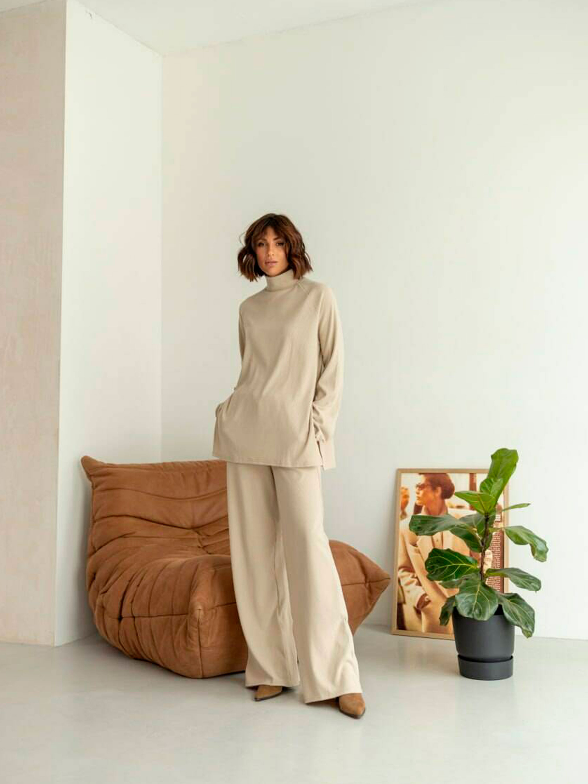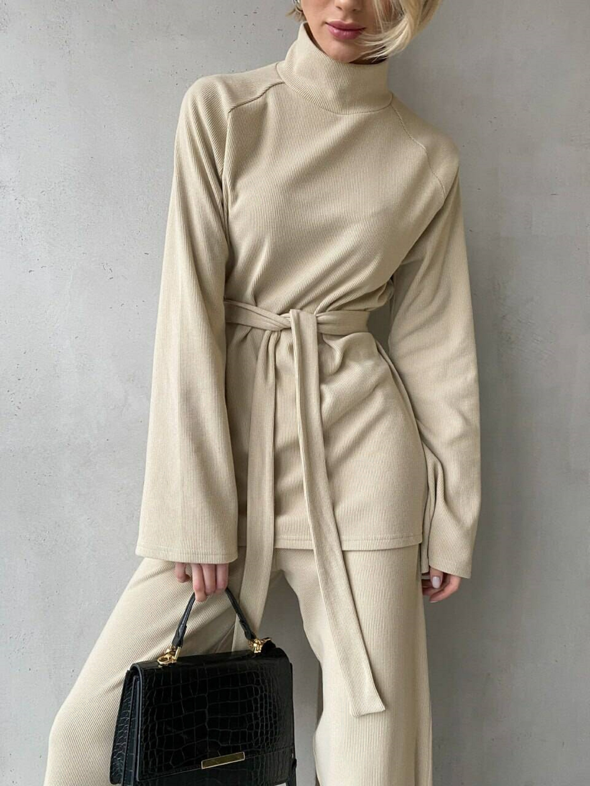 Характеристики: Тип виробу: костюм (кофта + брюки) Довжина рукава: довгий Посадка брюк: висока Крій: вільний, прямий Тканина: трикотаж ангора рубчик Склад тканини: 60% віскоза, 35% поліестер, 5% еластан Розміри: S (42–44), M (44–46) Кольори: капучино, кемел, малина, молоко, світлий беж, сірий, трава, чорний, бежевий Догляд: машинне прання при температурі до 30 °C у режимі “делікатне” не використовувати відбілювачі прасувати при середній температурі (до 150 °C) не викручувати, сушити в горизонтальному положенні не піддавати хімічній чистці Жіночий костюм Margo Особливості та характеристики: виготовлений із м’якої ангори рубчик — тканини, яка приємна до тіла, не колеться, добре зберігає тепло; кофта вільного крою з високим горлом забезпечує комфорт у прохолодну пору; з боків розташовані акуратні розрізи, що додають виробу легкості та стильності; штани високої посадки на еластичній гумці, мають прямий крій, що візуально подовжує силует; комплект доповнено поясом у тон, який підкреслює талію та створює гармонійний образ; тканина добре тягнеться, не деформується після прання, зберігає колір і форму; універсальний фасон дозволяє носити костюм як удома, так і для прогулянок чи подорожей. Костюм Margo — це поєднання затишку та стилю. Він виглядає елегантно, водночас забезпечуючи максимальний комфорт. Ідеальний вибір для тих, хто цінує м’якість, тепло та зручність у кожному русі.