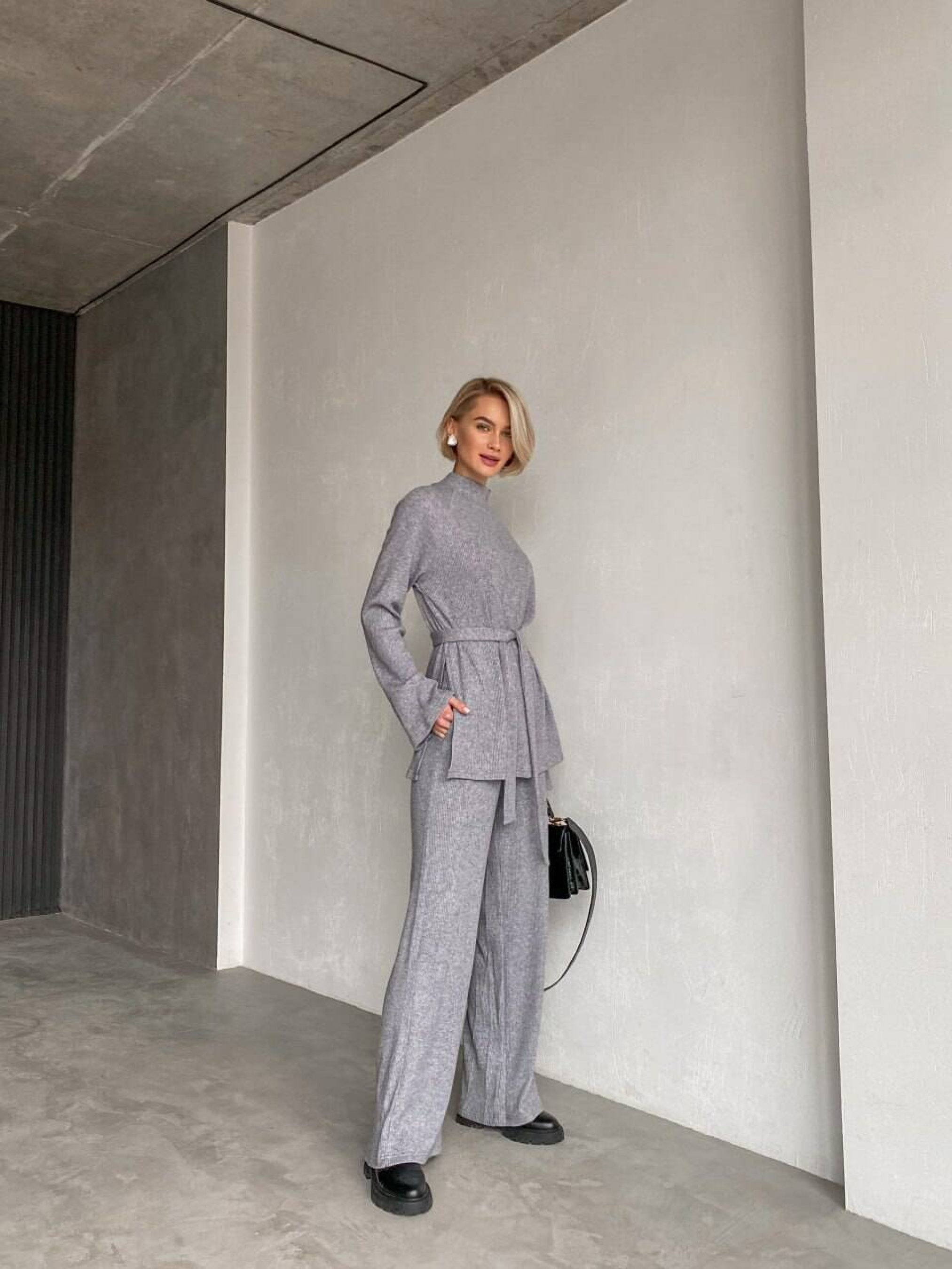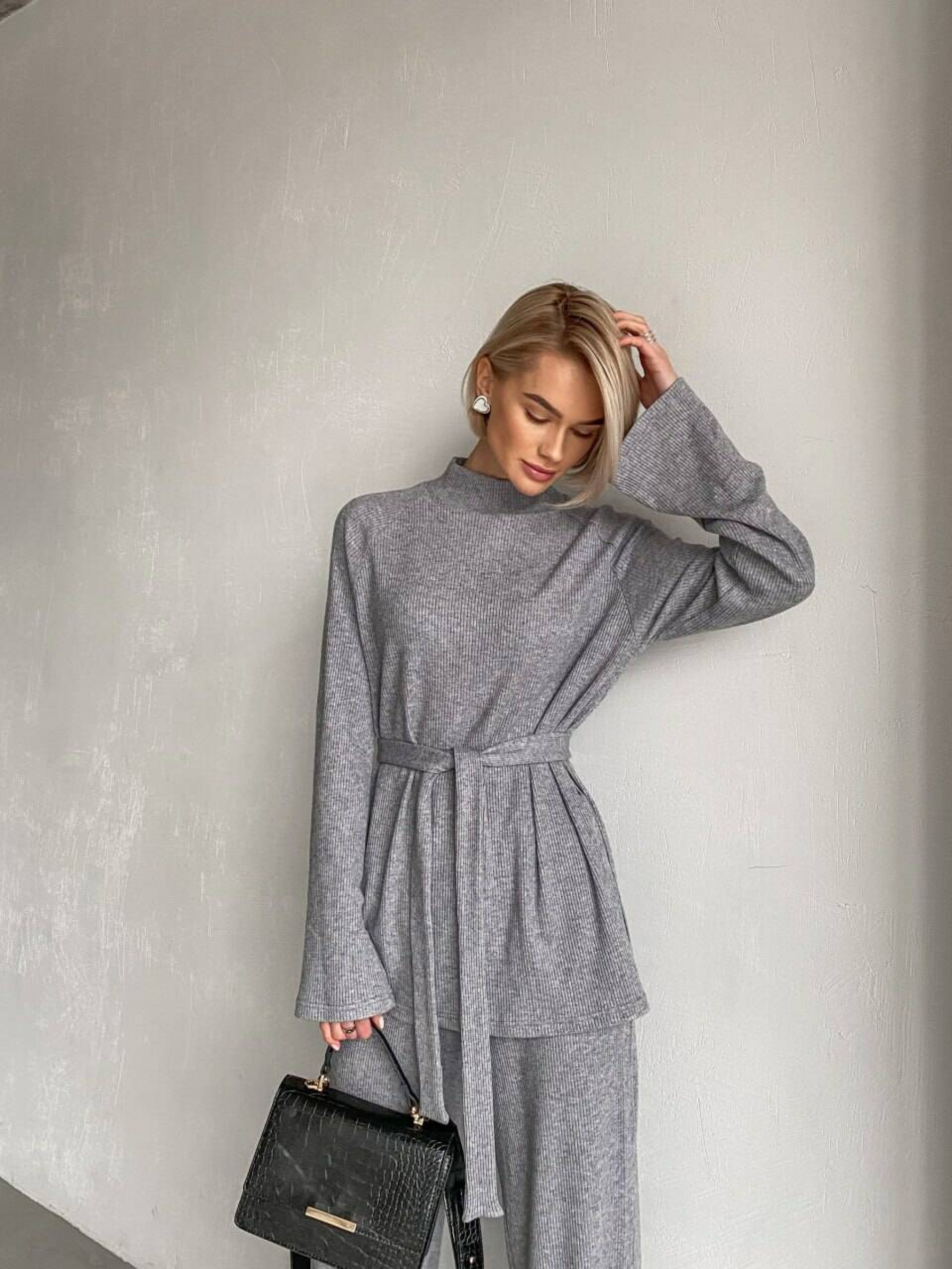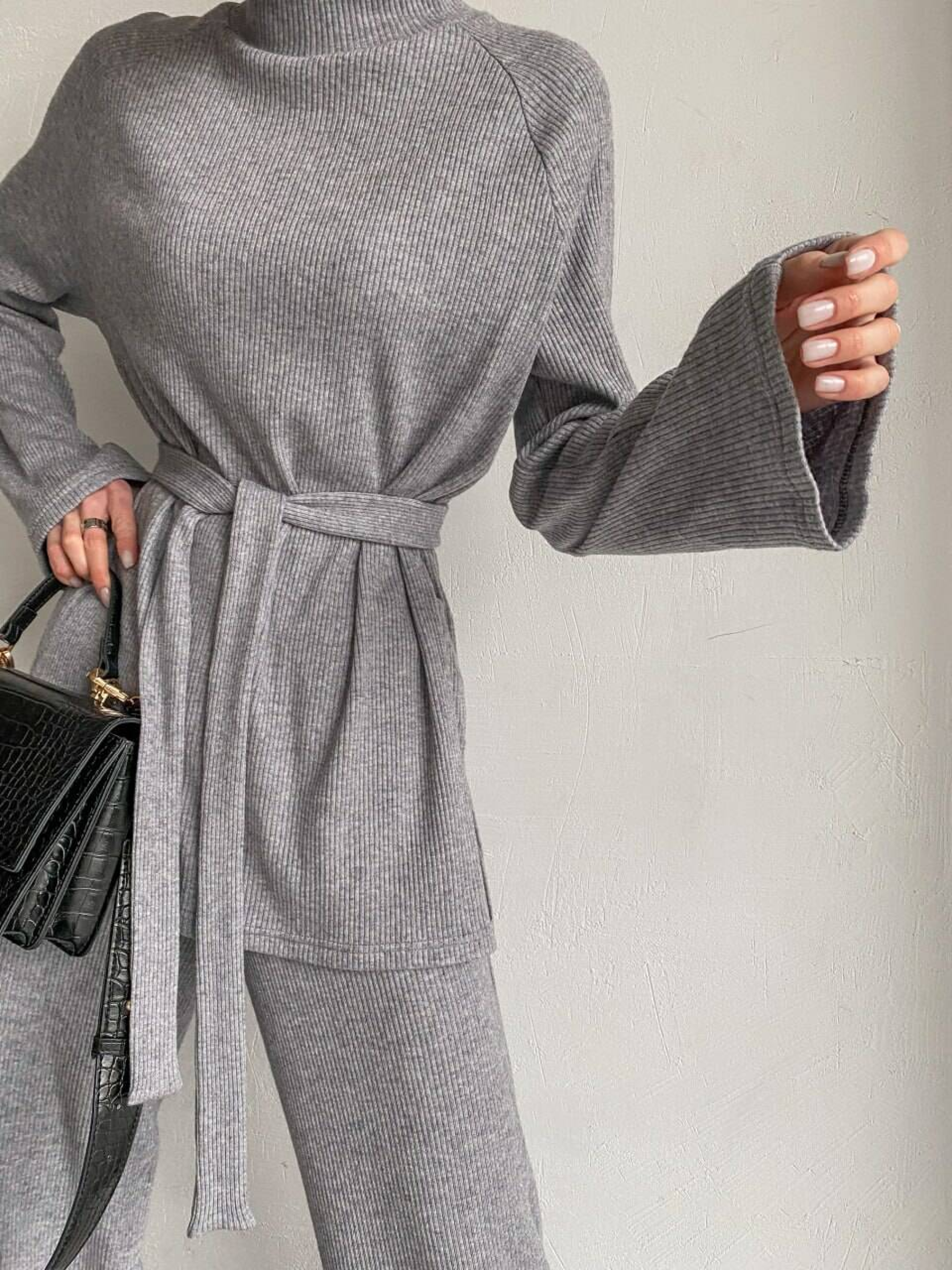 Характеристики: Тип виробу: костюм (кофта + брюки) Довжина рукава: довгий Посадка брюк: висока Крій: вільний, прямий Тканина: трикотаж ангора рубчик Склад тканини: 60% віскоза, 35% поліестер, 5% еластан Розміри: S (42–44), M (44–46) Кольори: капучино, кемел, малина, молоко, світлий беж, сірий, трава, чорний, бежевий Догляд: машинне прання при температурі до 30 °C у режимі “делікатне” не використовувати відбілювачі прасувати при середній температурі (до 150 °C) не викручувати, сушити в горизонтальному положенні не піддавати хімічній чистці Жіночий костюм Margo Особливості та характеристики: виготовлений із м’якої ангори рубчик — тканини, яка приємна до тіла, не колеться, добре зберігає тепло; кофта вільного крою з високим горлом забезпечує комфорт у прохолодну пору; з боків розташовані акуратні розрізи, що додають виробу легкості та стильності; штани високої посадки на еластичній гумці, мають прямий крій, що візуально подовжує силует; комплект доповнено поясом у тон, який підкреслює талію та створює гармонійний образ; тканина добре тягнеться, не деформується після прання, зберігає колір і форму; універсальний фасон дозволяє носити костюм як удома, так і для прогулянок чи подорожей. Костюм Margo — це поєднання затишку та стилю. Він виглядає елегантно, водночас забезпечуючи максимальний комфорт. Ідеальний вибір для тих, хто цінує м’якість, тепло та зручність у кожному русі.