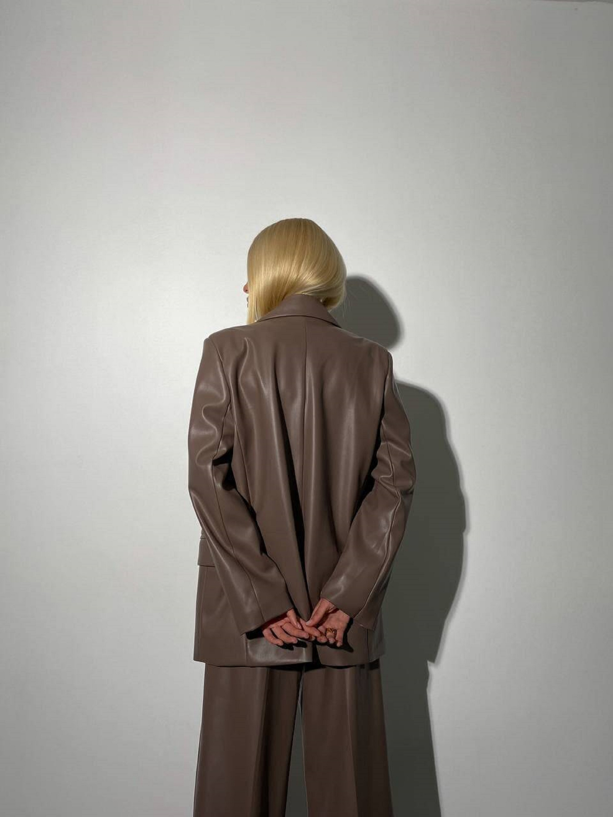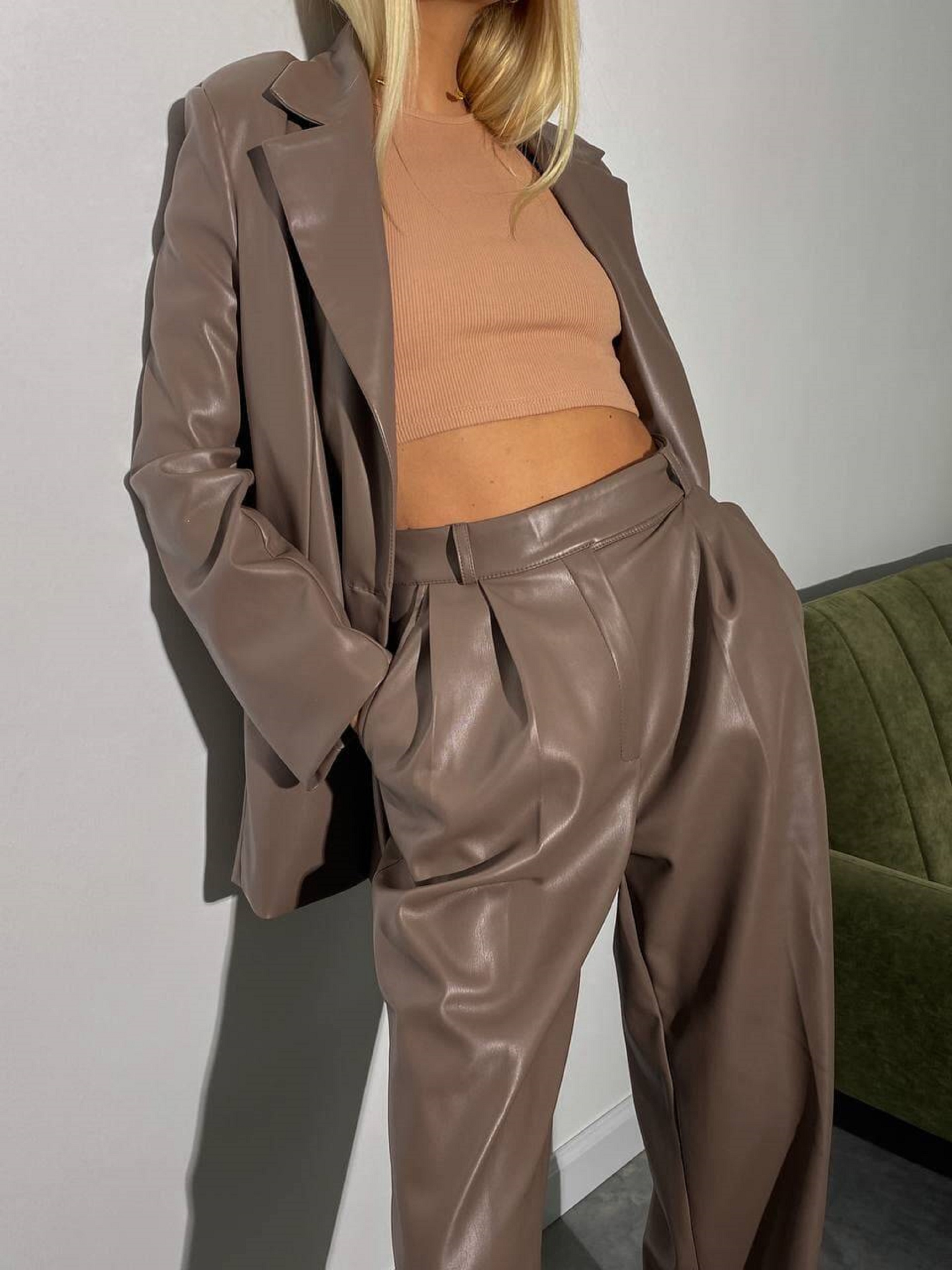 Характеристики: Тип: костюм (піджак + брюки) Силует: оверсайз Посадка брюк: висока Довжина брюк: до підлоги, підходять на зріст до 180 см Тканина: екошкіра на замшевій основі Підкладка: нейлон Розміри: S (42–44) M (44–46) Колір: капучино Догляд: ручне або машинне прання “делікатне” при температурі до 30 °C прасування з вивороту при низькій температурі (через тканину) хімічна чистка дозволена лише у спеціальних засобах для екошкіри не відбілювати не віджимати у центрифузі Особливості та переваги: Ультрамодний, стильний класичний костюм у вільному силуеті, що поєднує елегантність і сучасний тренд оверсайз. Об’ємний піджак “з чоловічого плеча” додає образу впевненості та шику. Брюки-палаццо з високою посадкою візуально подовжують ноги, підкреслюють талію та створюють гармонійну пропорцію фігури. Екошкіра на замшевій основі має приємну м’яку фактуру, добре тримає форму та не тріскається під час носіння. Тканина легко чиститься, не розтягується й не втрачає насиченість кольору. Підкладка з нейлону забезпечує комфорт і зручність у русі. Практичні деталі — дві функціональні кишені у штанах та класичні лацкани на піджаку. Костюм ALEX — це бездоганне поєднання жіночності, впевненості та стилю. Ідеально підходить для офісу, ділових зустрічей чи стильного вечірнього виходу. Легко комбінується з базовими топами, сорочками або гольфами, створюючи безліч модних образів.