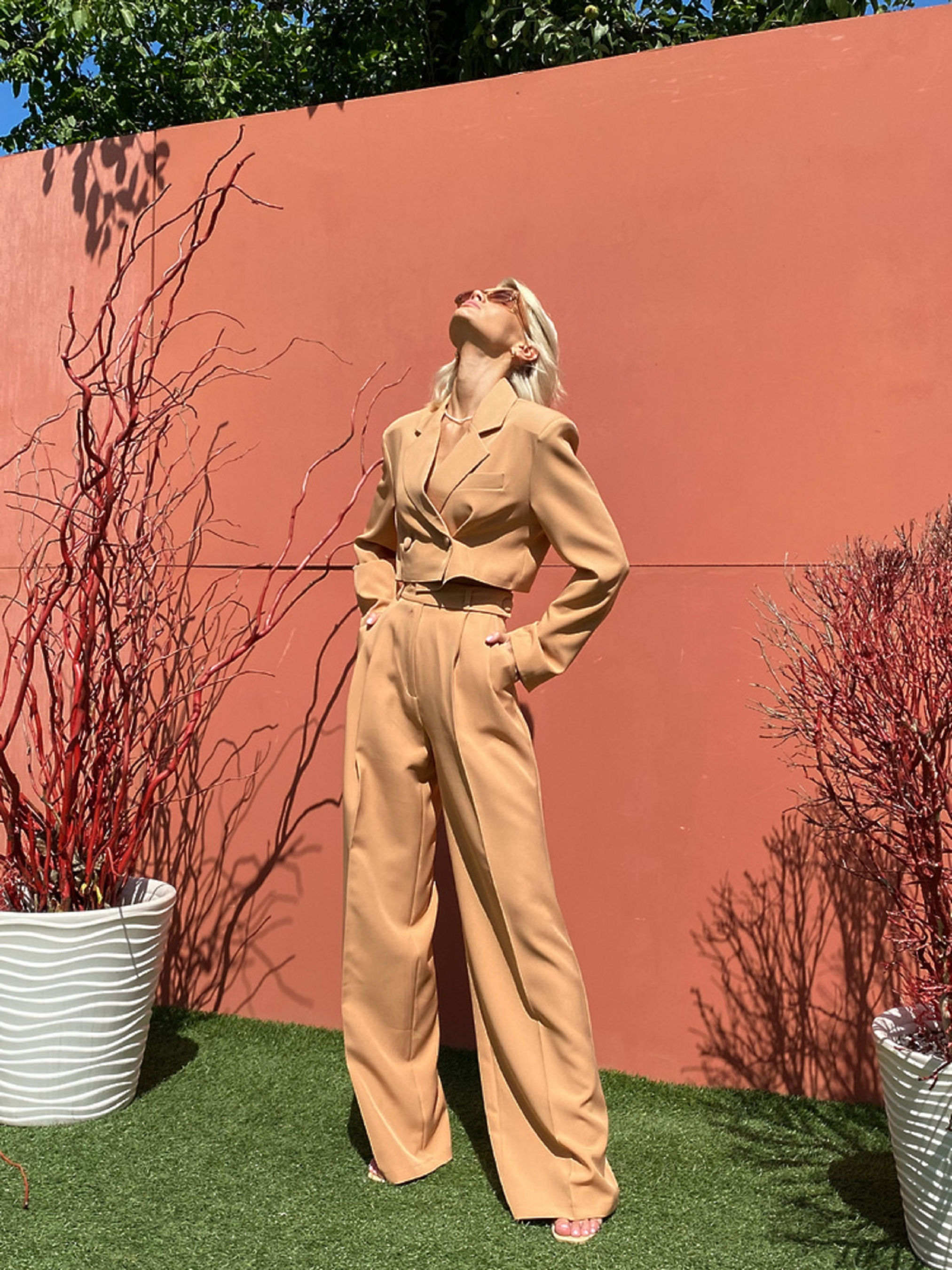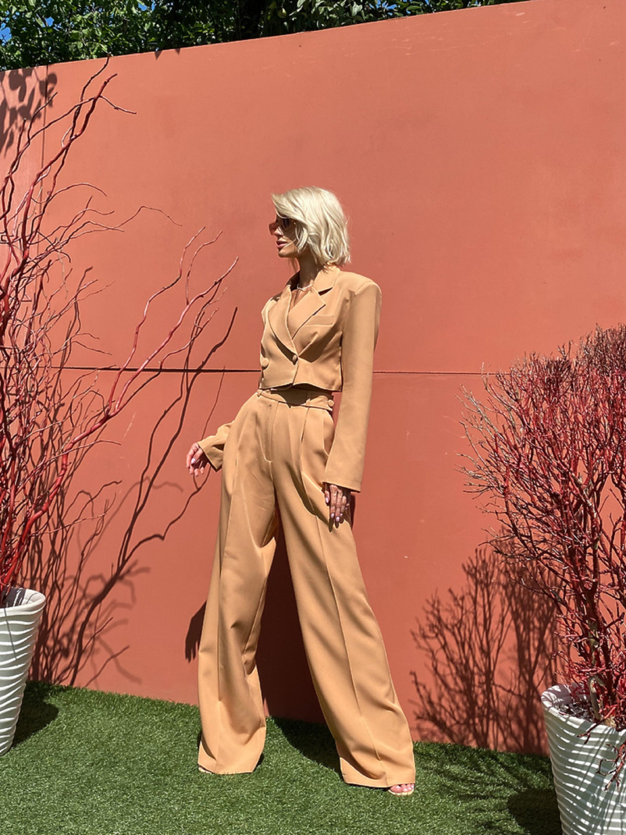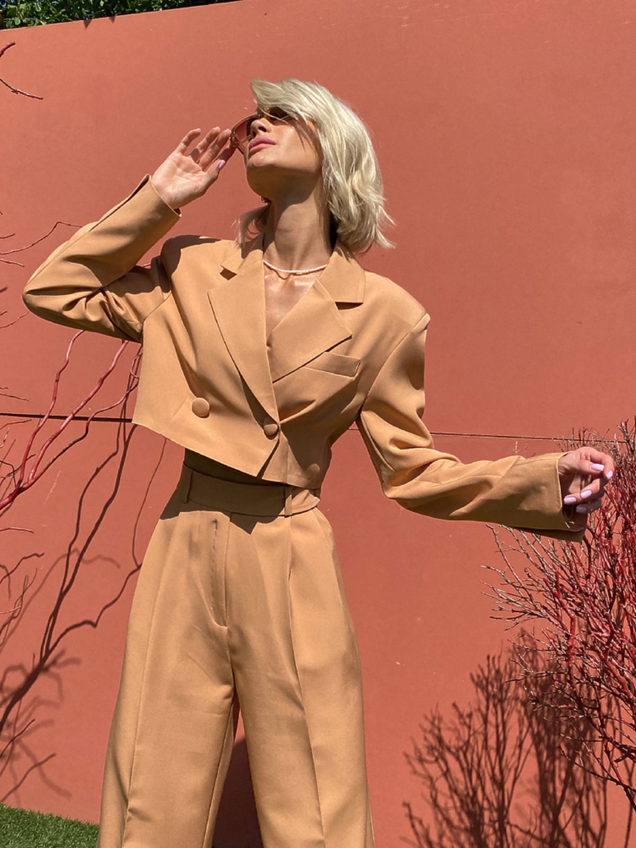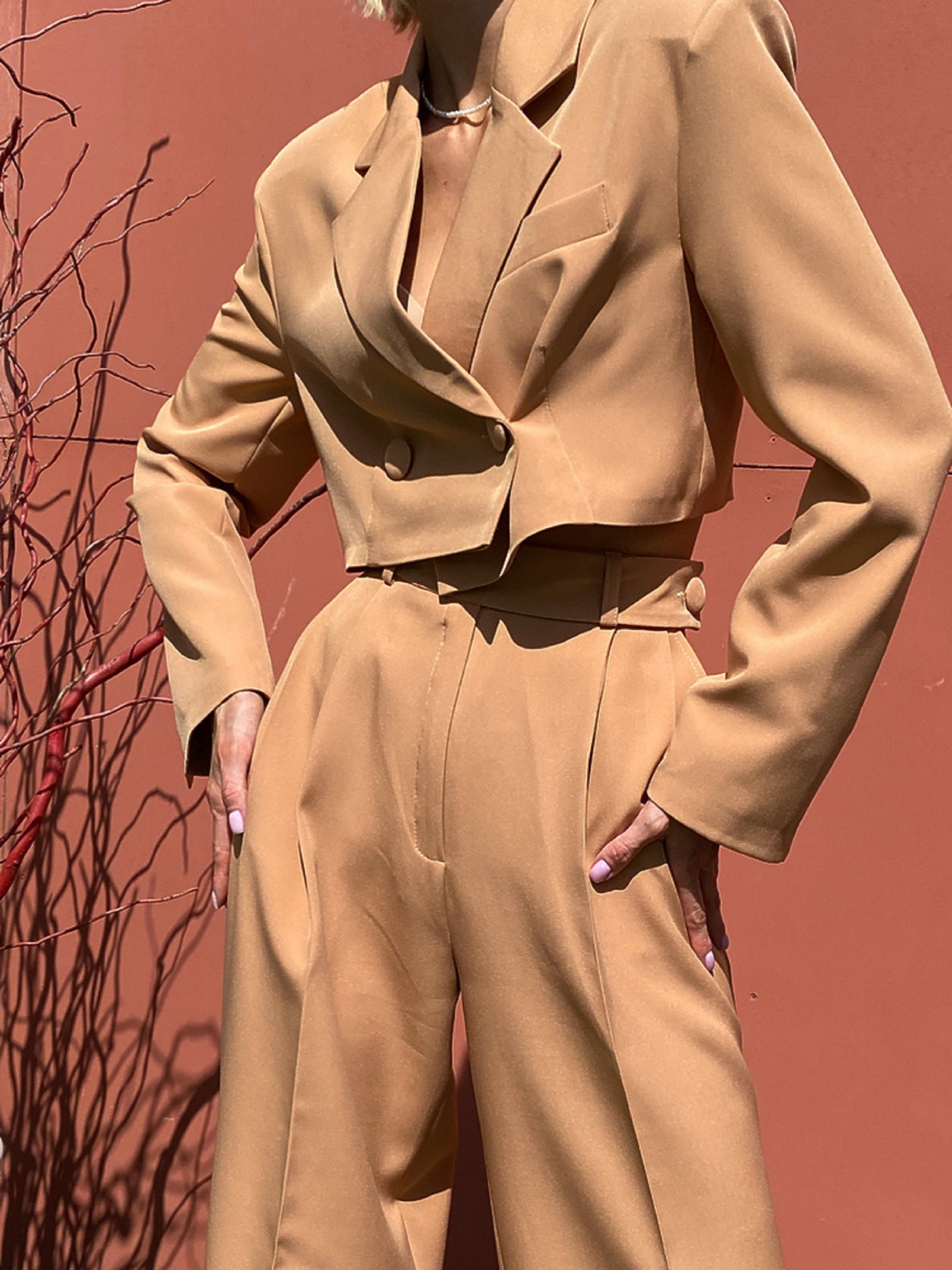 Характеристики: Склад: костюмка з підкладкою з бавовни Фасон: двобортний кроп-жакет + брюки палаццо Розмір: S, M Кольори: кемел Догляд: Ручне або машинне прання у делікатному режимі (до 30 °C) Прасування при середній температурі (до 150 °C) Не відбілювати Хімічна чистка дозволена Сушити на плечиках у розправленому вигляді Стильний та ефектний костюм MELANIA — вибір для впевнених жінок, які цінують елегантність у поєднанні з сучасними тенденціями. Комплект складається з укороченого двобортного жакета та широких брюк-палаццо, що разом створюють вишуканий, проте розслаблений силует. Кроп-жакет виконано в люксовому стилі — із чіткою лінією плеча, двома рядами ґудзиків та підкладкою з натуральної бавовни. Брюки мають високу посадку, пояс зі шльовками й елегантно драпіруються від стегон донизу, подовжуючи ноги. Костюм чудово поєднується як із класичними човниками чи босоніжками, так і з кедами — для більш кежуального образу. Ідеальний вибір для офісу, ділових зустрічей або урочистих подій.