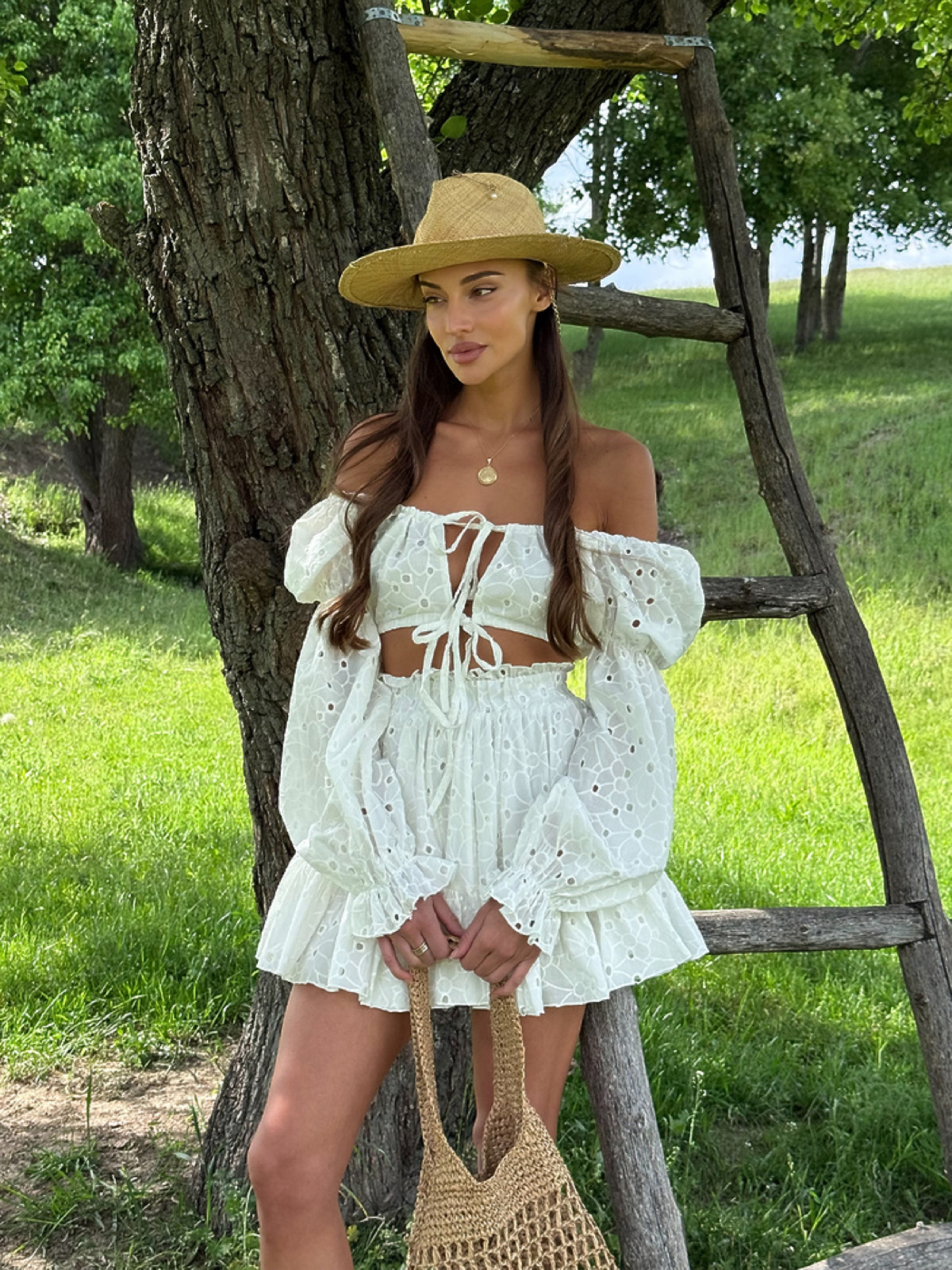 Характеристики: Тип костюма: Літній комплект (топ + спідниця) Довжина спідниці: Міні Фасон топу: На зав’язках, із об’ємними рукавами Матеріал: 100% бавовна (прошва) Підкладка: Є (по спідниці та топу, біла) Колір: чорний, білий Розмір: one size (M) Догляд: ручне або машинне прання “делікатне” при температурі до 30 °C не відбілювати прасування при температурі до 150 °C сушити природним способом, уникати прямого сонячного проміння хімічна чистка заборонена Жіночий костюм ROYAL Особливості та переваги: виконаний із натуральної бавовняної прошви — легкої, дихаючої та приємної до тіла тканини, ідеальної для літа; міні-спідниця має романтичну зборку по низу, що створює ніжний та грайливий силует; ліф-топ із зав’язками дозволяє регулювати посадку по фігурі, забезпечуючи комфорт і жіночність; об’ємні рукави надають образу легкості та трендовості; біла підкладка забезпечує комфорт і непрозорість виробу; костюм доступний у базових кольорах — чорному та білому, які легко комбінуються з аксесуарами. Літній костюм ROYAL — ідеальний вибір для спекотних днів, прогулянок, відпочинку біля моря чи стильних фото. Легкий, натуральний і трендовий, він підкреслить жіночність і додасть образу витонченого шарму.