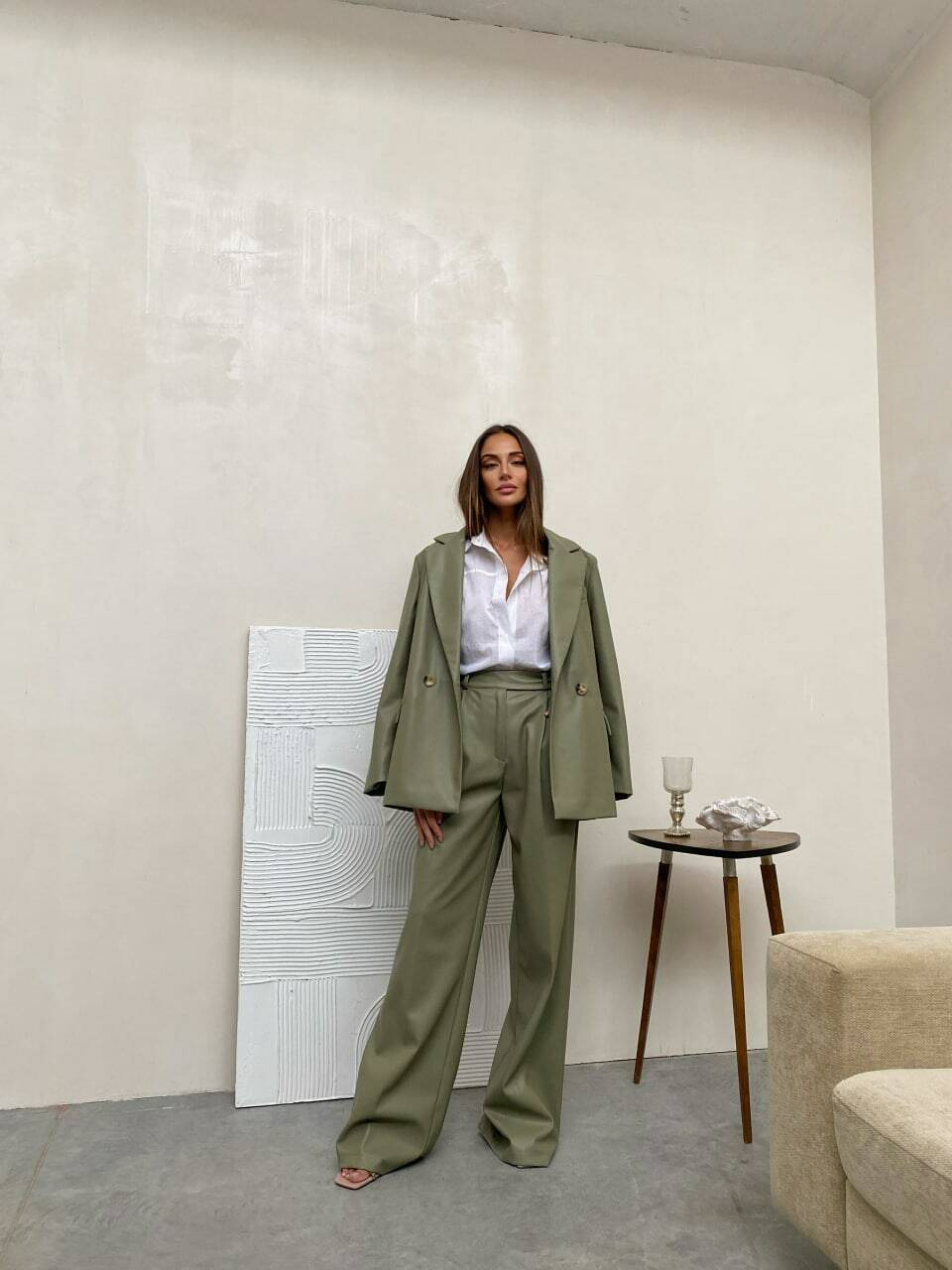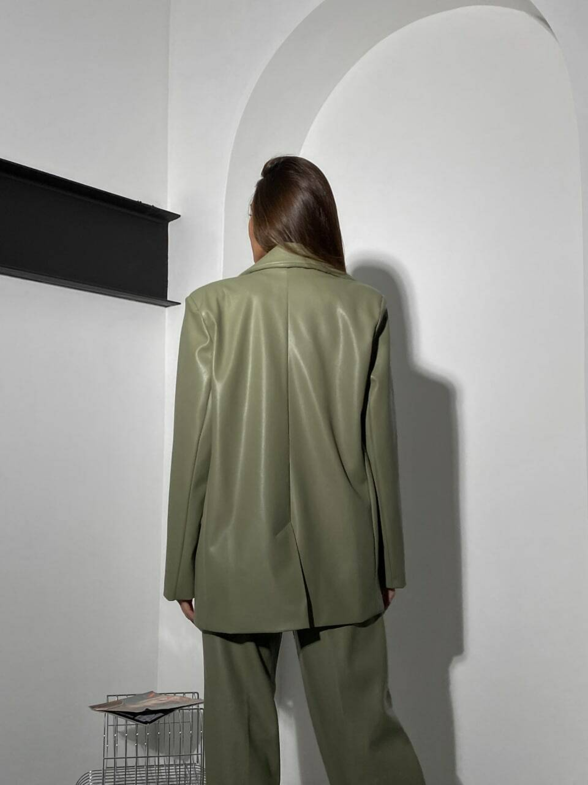 Характеристики: Тип: костюм (піджак + брюки) Силует: оверсайз Посадка брюк: висока Довжина брюк: до підлоги, підходять на зріст до 180 см Тканина: екошкіра на замшевій основі Підкладка: нейлон Розміри: S (42–44) M (44–46) Кольори в наявності: капучино, оливка, світлий беж, чорний Догляд: ручне або машинне прання “делікатне” при температурі до 30 °C прасування з вивороту при низькій температурі (через тканину) хімічна чистка дозволена лише у спеціальних засобах для екошкіри не відбілювати не віджимати у центрифузі Особливості та переваги: Ультрамодний, стильний класичний костюм у вільному силуеті, що поєднує елегантність і сучасний тренд оверсайз. Об’ємний піджак “з чоловічого плеча” додає образу впевненості та шику. Брюки-палаццо з високою посадкою візуально подовжують ноги, підкреслюють талію та створюють гармонійну пропорцію фігури. Екошкіра на замшевій основі має приємну м’яку фактуру, добре тримає форму та не тріскається під час носіння. Тканина легко чиститься, не розтягується й не втрачає насиченість кольору. Підкладка з нейлону забезпечує комфорт і зручність у русі. Практичні деталі — дві функціональні кишені у штанах та класичні лацкани на піджаку. Костюм ALEX — це бездоганне поєднання жіночності, впевненості та стилю. Ідеально підходить для офісу, ділових зустрічей чи стильного вечірнього виходу. Легко комбінується з базовими топами, сорочками або гольфами, створюючи безліч модних образів.