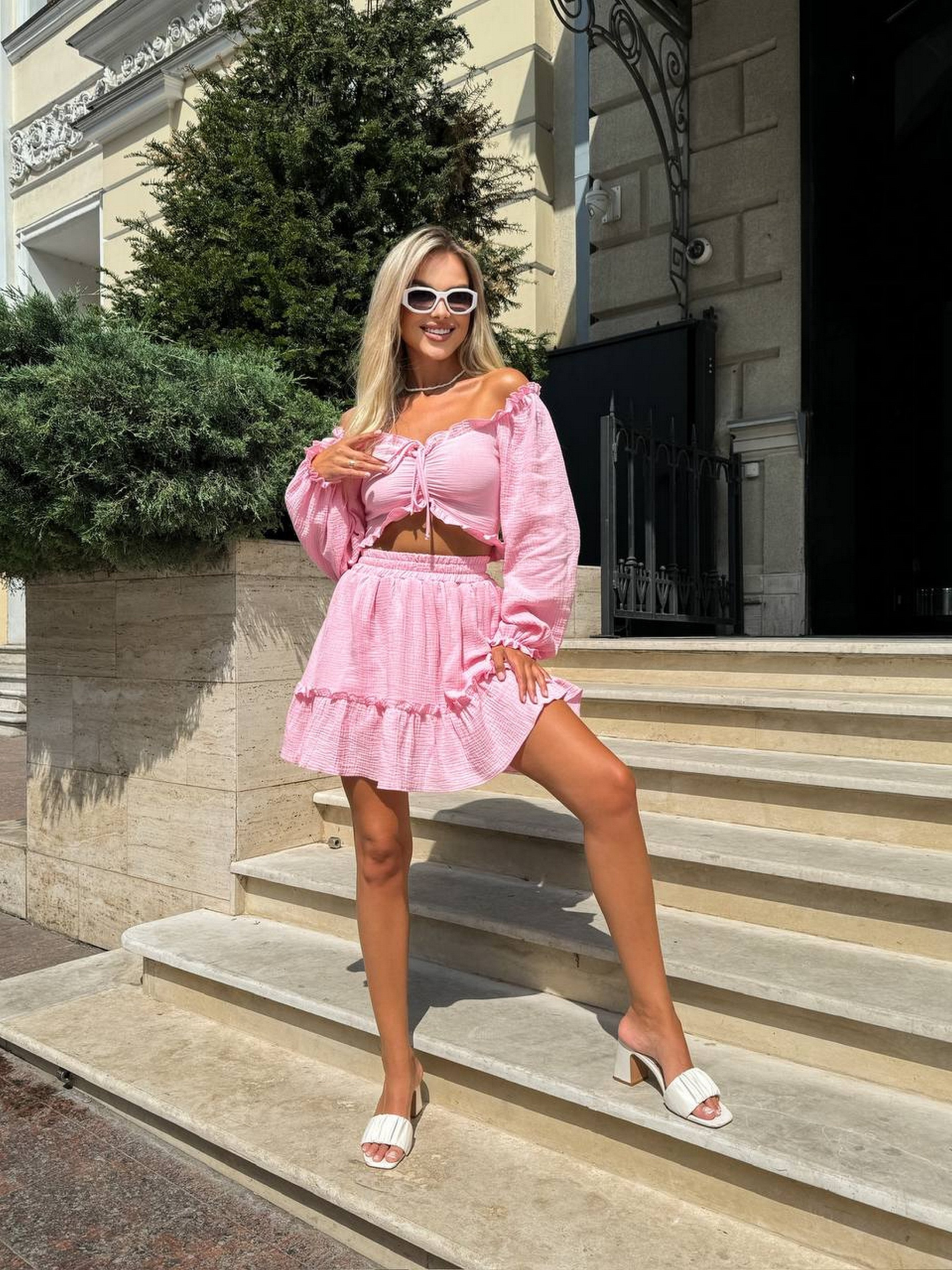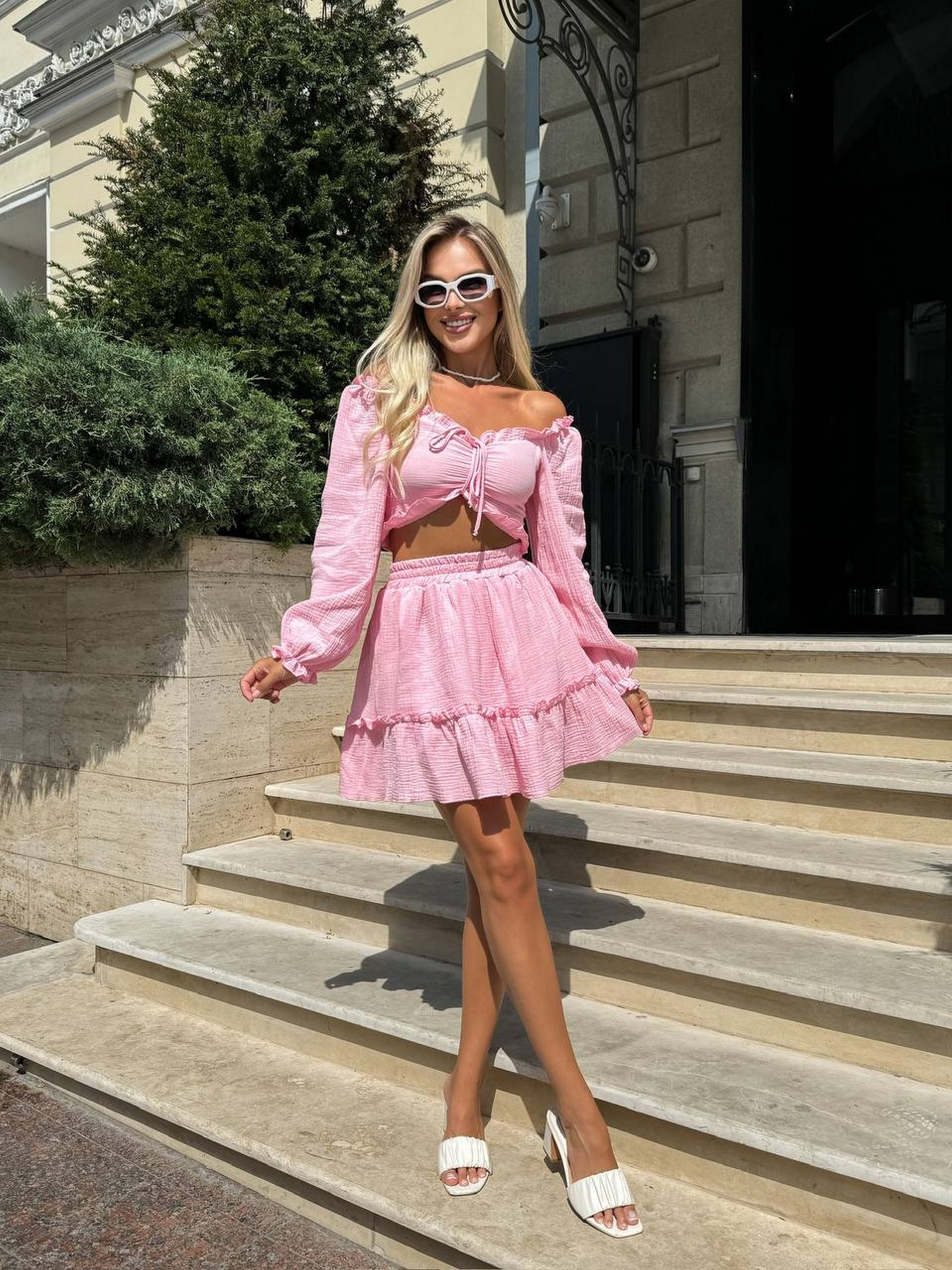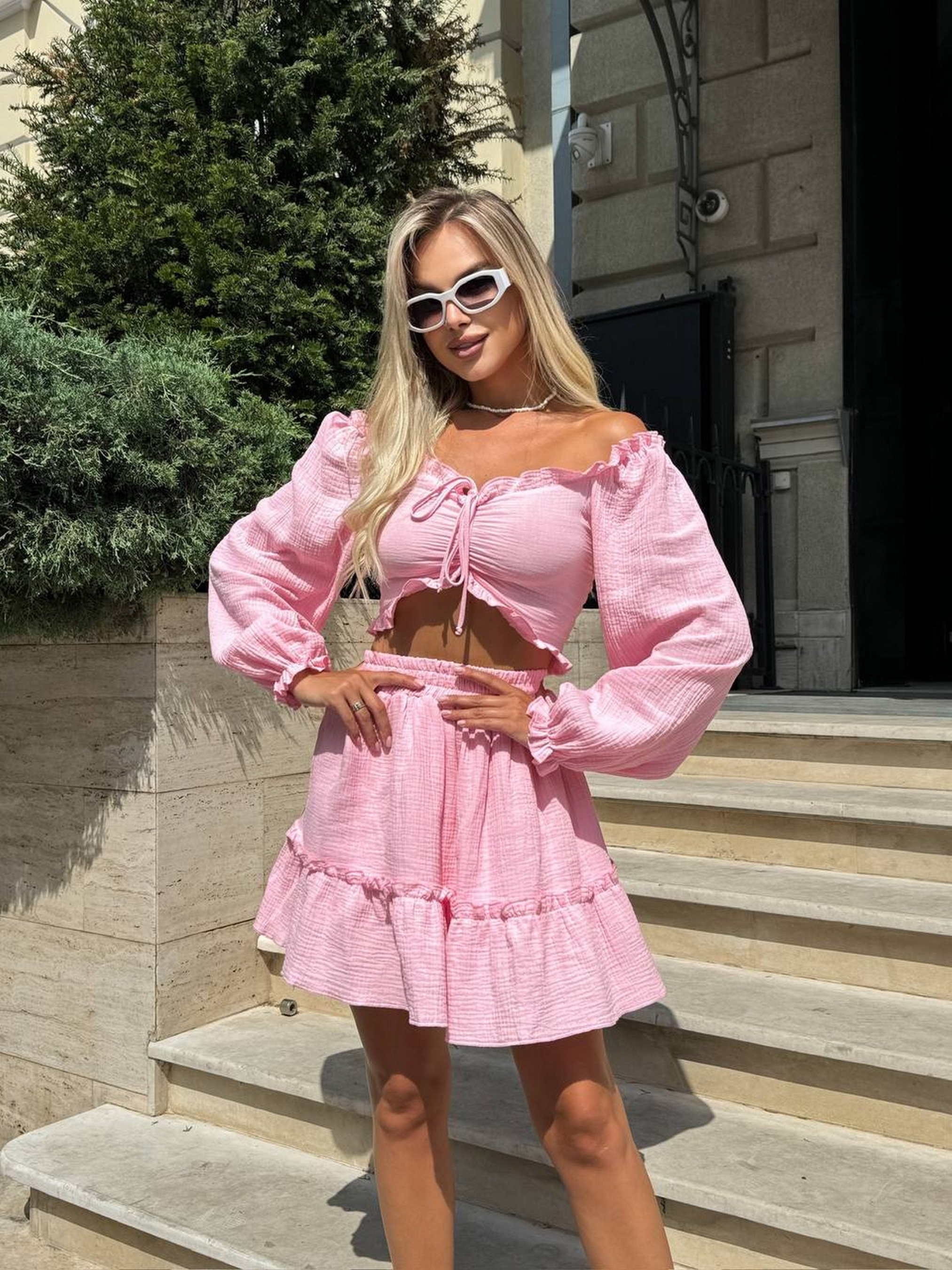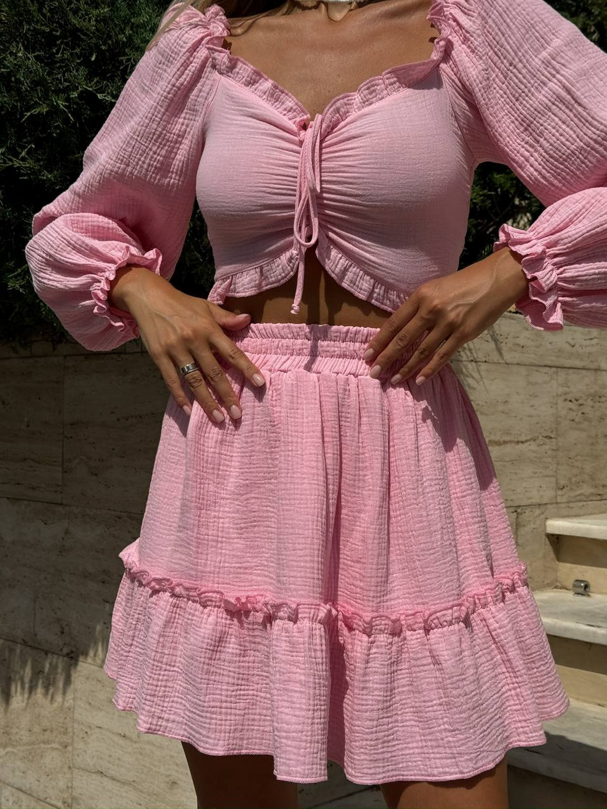 Муслиновый костюм – это воплощение элегантности и комфорта. Этот невероятно красивый комплект состоит из топа и юбочки. Он идеально подходит для теплого времени года и разнообразных событий. Топ имеет лаконичный крой, подчеркивающий женственность. Юбочка на подкладке обеспечивает непрозрачность и комфорт. Размерная сетка: XS-S: грудь 84-90 см, бедра 88-94 см M-L: грудь 90-95 см, бедра 94-99 см