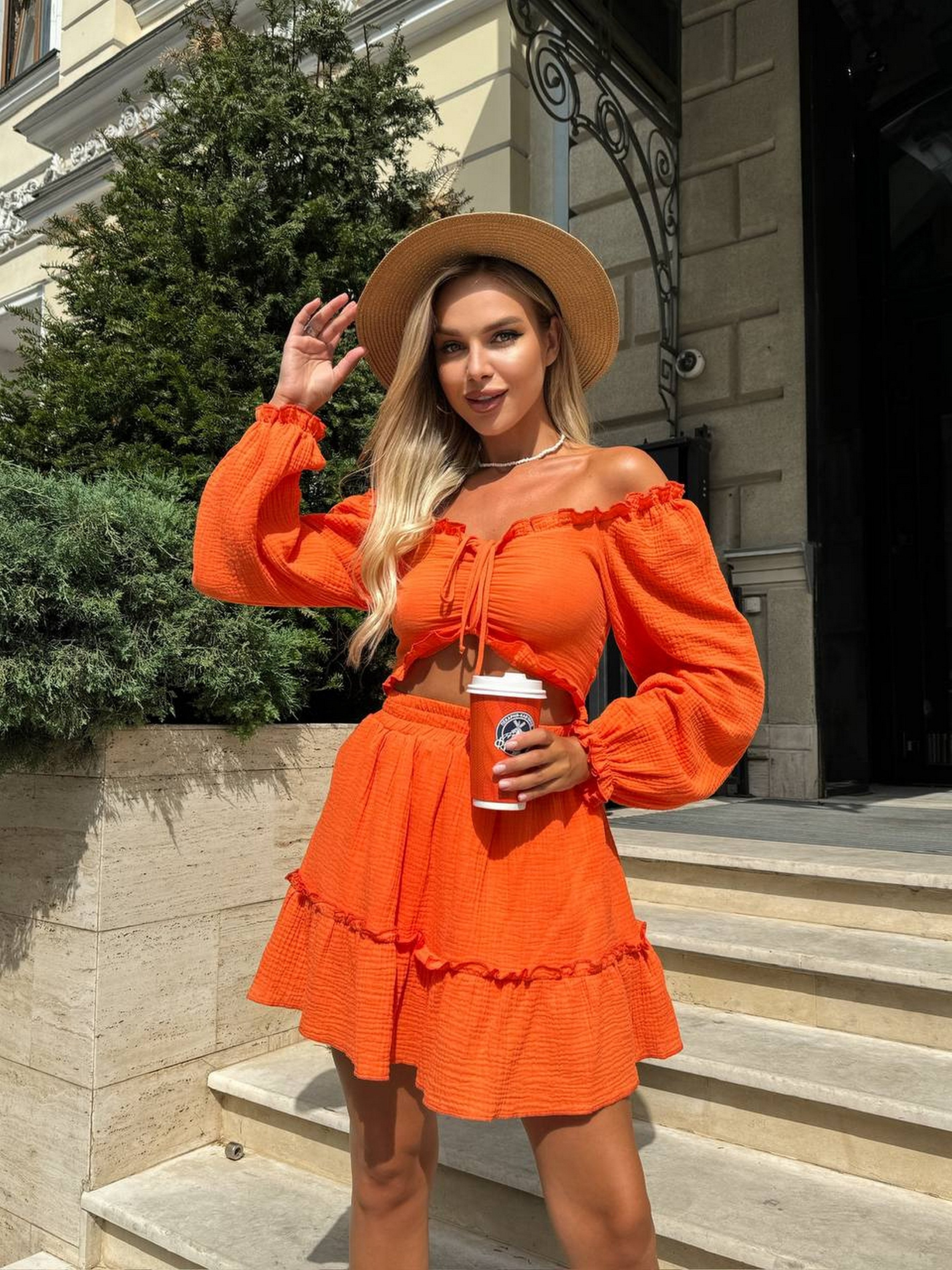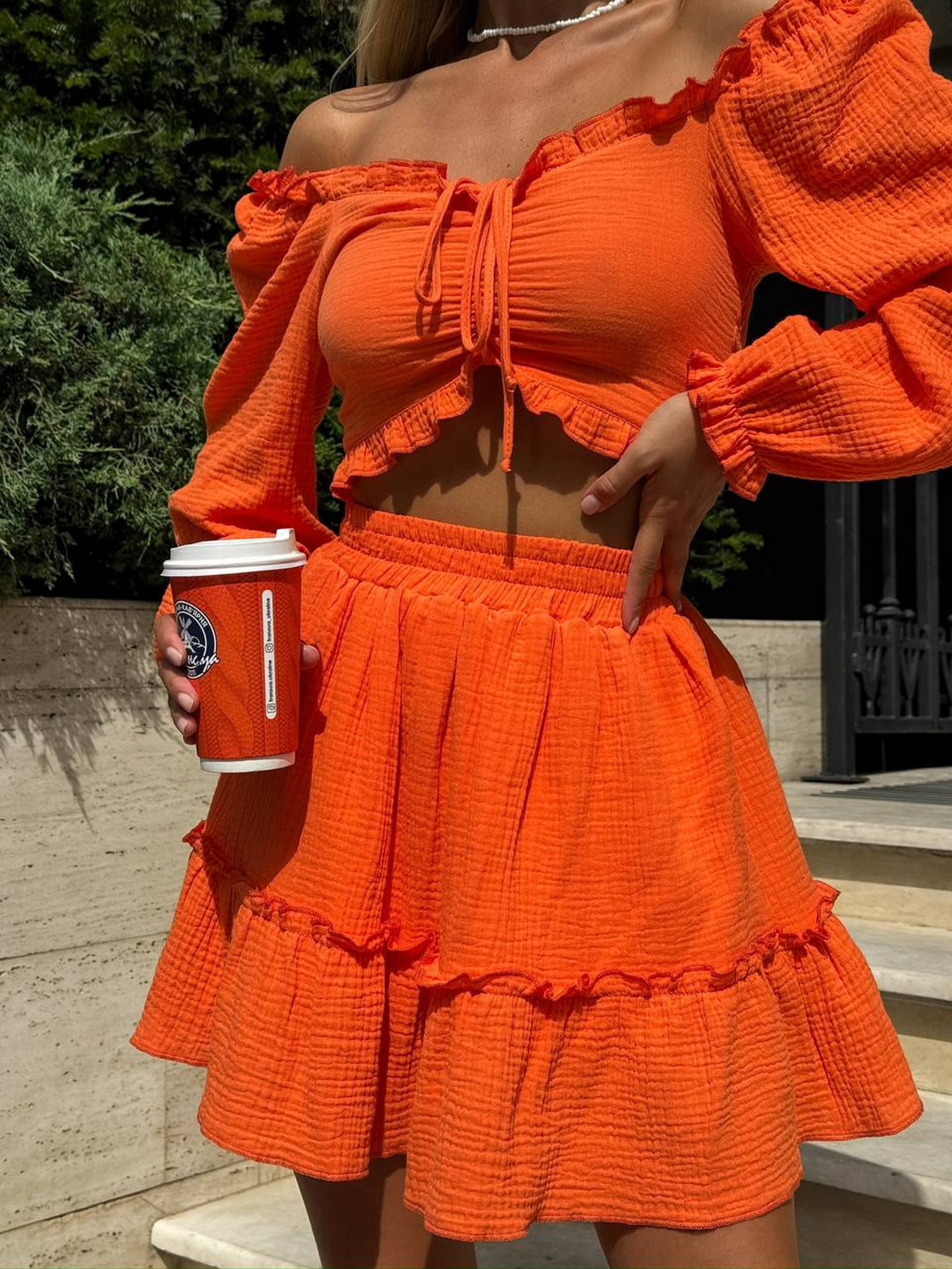 Муслиновый костюм – это воплощение элегантности и комфорта. Этот невероятно красивый комплект состоит из топа и юбочки. Он идеально подходит для теплого времени года и разнообразных событий. Топ имеет лаконичный крой, подчеркивающий женственность. Юбочка на подкладке обеспечивает непрозрачность и комфорт. Размерная сетка: XS-S: грудь 84-90 см, бедра 88-94 см M-L: грудь 90-95 см, бедра 94-99 см