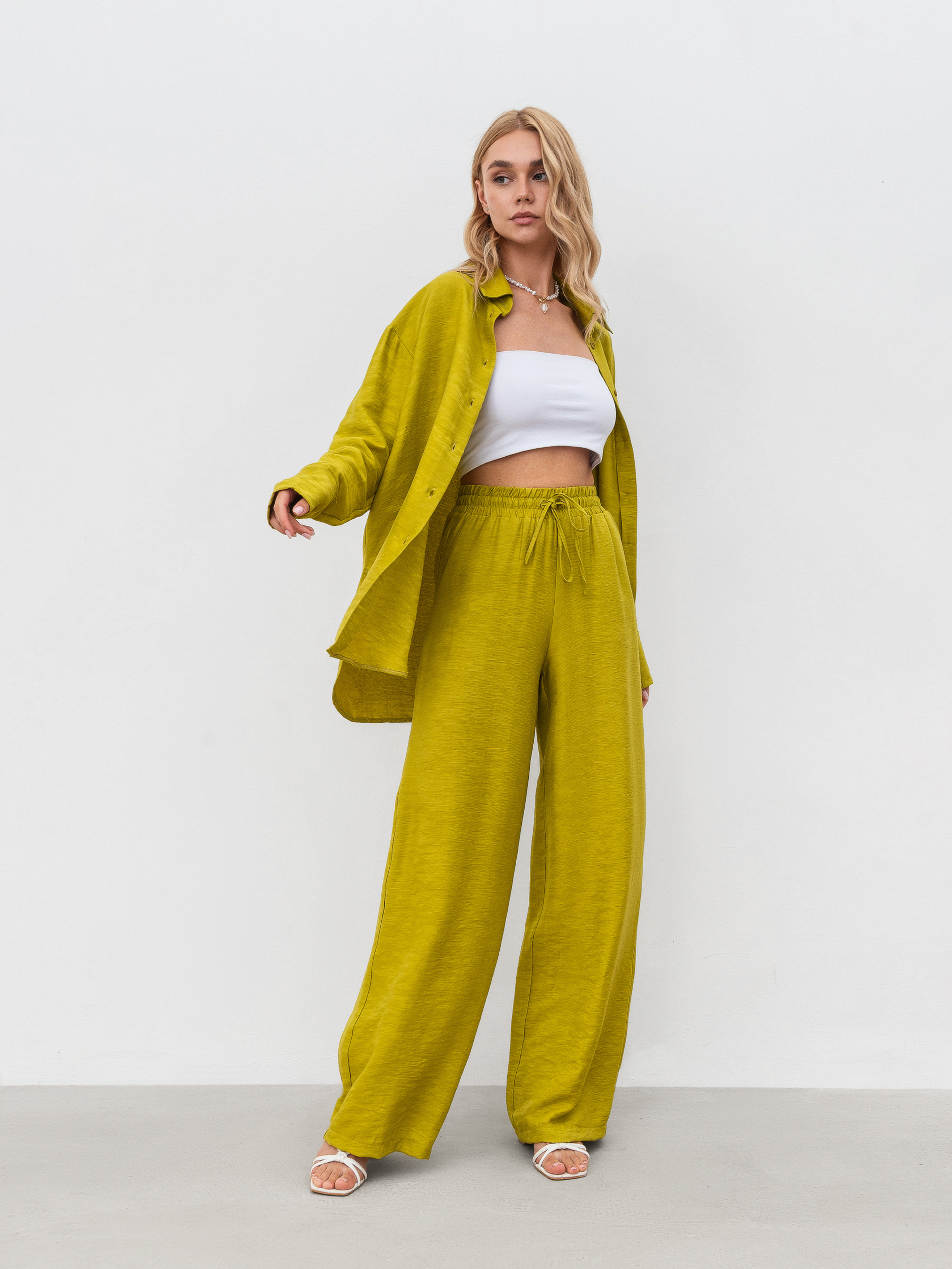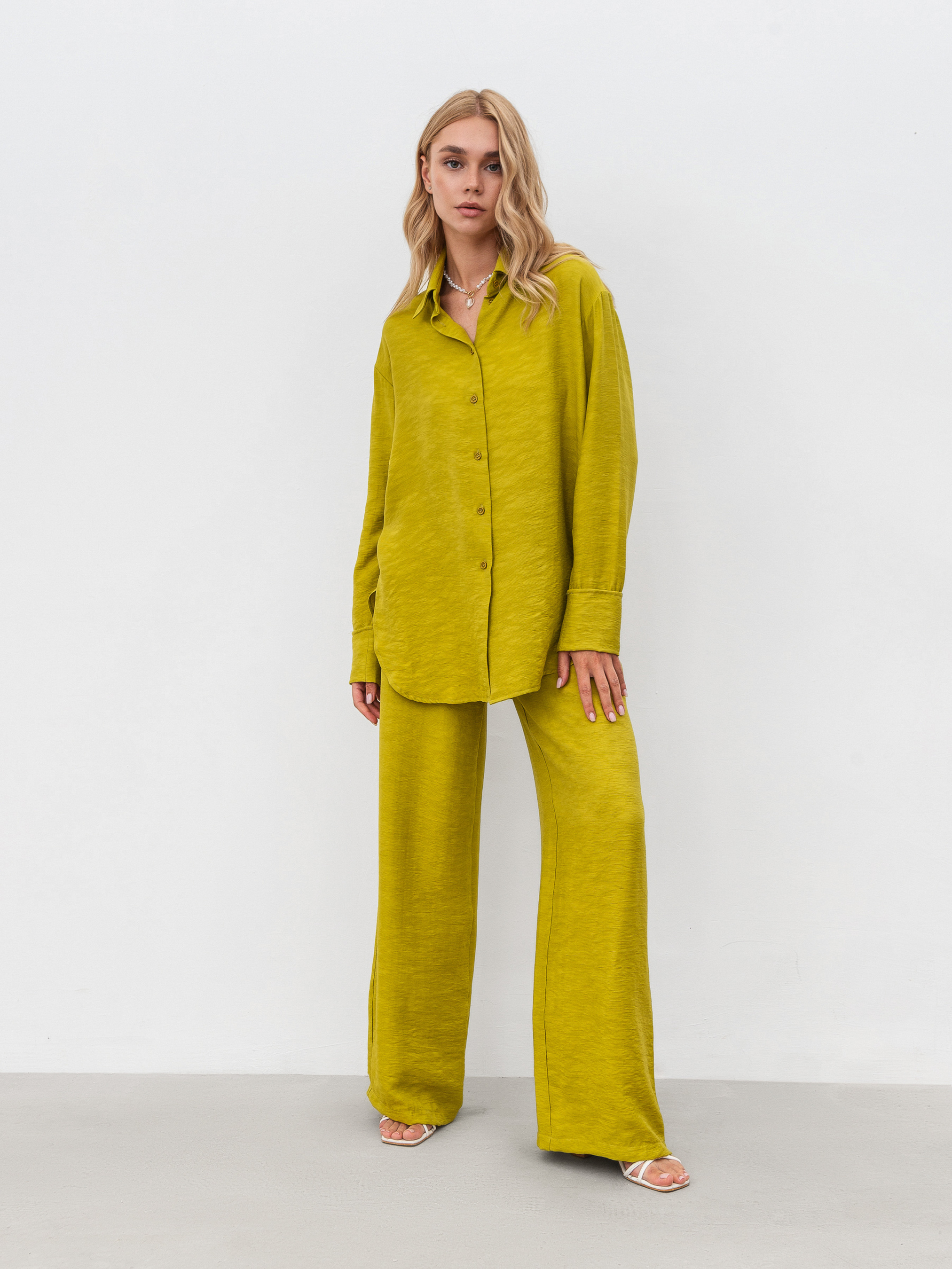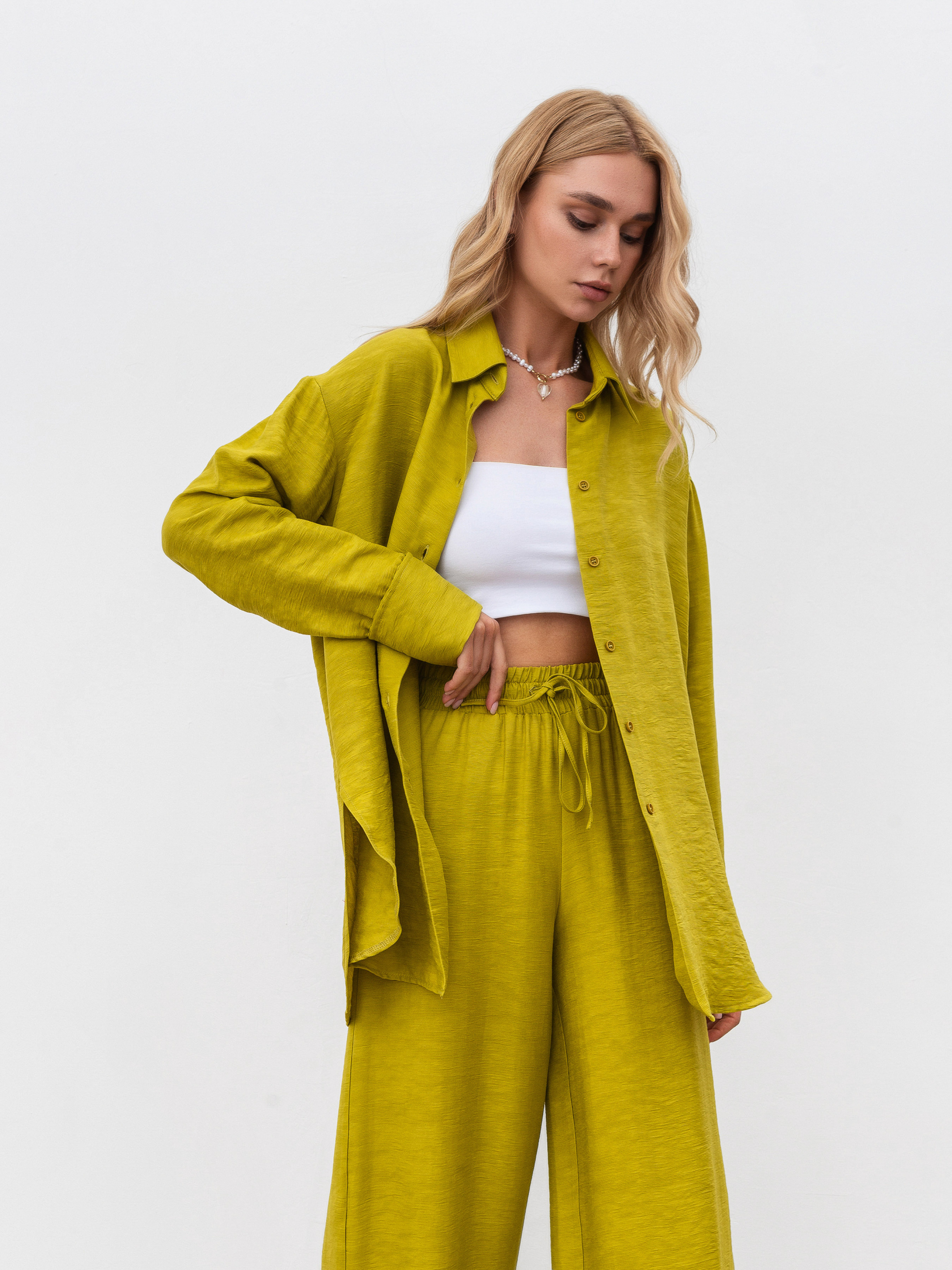 Комплект свободного фасона в мелкую фактуру-плиссе. Легкая струящейся ткань идеальна на лето. Брюки на резинке с высокой посадкой. Свободная рубашка по бокам с мягкими разрезами. XS-S Длина по внешнему шву : 107 см Длина по спине : 69 см Длина рукава : 56 см Полуобхват груди: 54 см Полуобхват бедер: 55 см Плечи : 48 см Посадка : 30 см Полуобхват талии : 55 см S-M Длина по внешнему шву: 107 см Длина по спине: 74 см Длина рукава: 58 см Полуобхват груди: 55 см Полуобхват бедер: 58 см Плечи : 50 см Посадка : 33 см Полуобхват талии : 56 см M-L Длина по внешнему шву: 107 см Длина по спине: 72 см Длина рукава : 56 см Полуобхват груди: 60 см Полуобхват бедер: 63 см Плечи : 51 см Посадка : 35 см Полуобхват талии : 57 см
