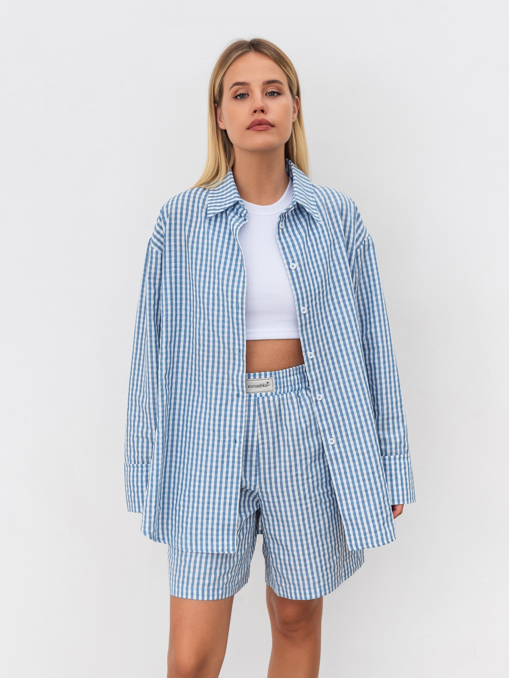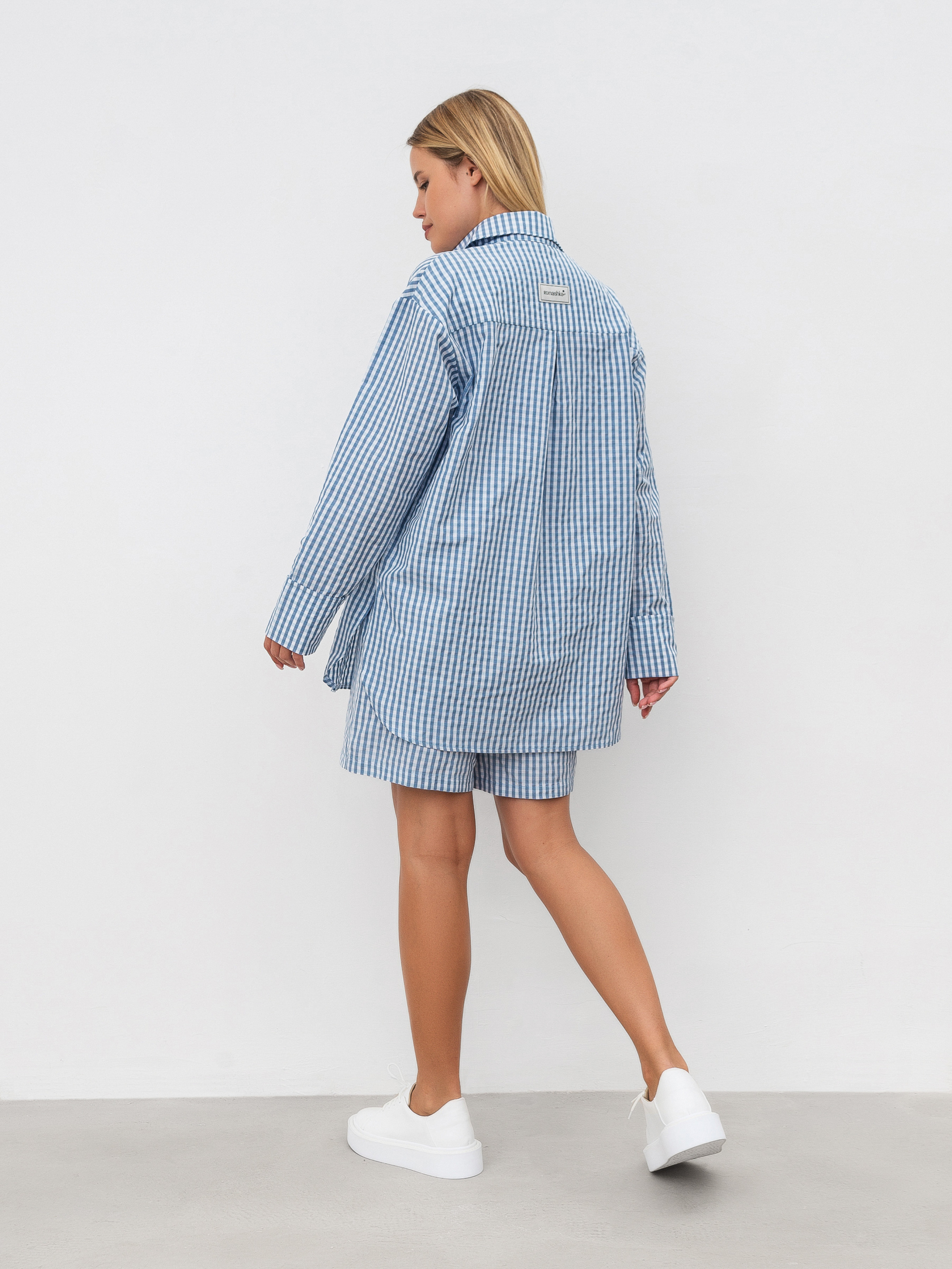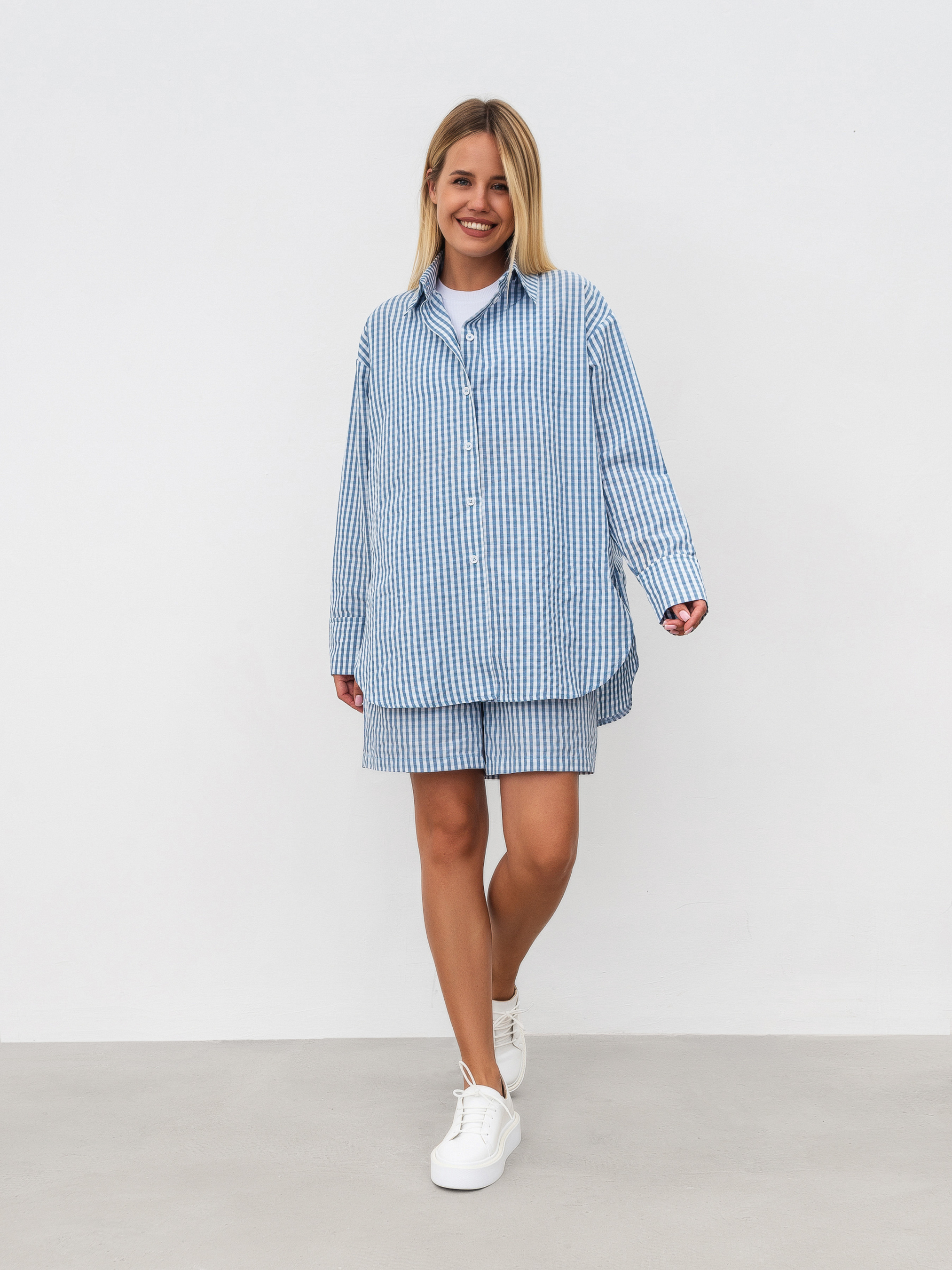 Комплект из удлиненных шорт и свободной рубашки. Принт мелкая клетка. Шорты свободного формата с кармашками, на талии резинка. Рубашка с мягкими разрезами по бокам, свободного фасона. Отлично можно носить как комплектом, так и отдельно. XS-S Длина по внешнему шву : 45 см Длина по спине : 76 см Длина рукава : 57 см Полуобхват груди: 55 см Полуобхват бедер: 50 см Плечи : 51 см Посадка : 29 см Полуобхват талии : 54 см S-M Длина по внешнему шву: 45 см Длина по спине: 76 см Длина рукава: 57 см Полуобхват груди: 59 см Полуобхват бедер: 52 см Плечи : 52 см Посадка : 32 см Полуобхват талии : 56 см M-L Длина по внешнему шву: 45 см Длина по спине: 76 см Длина рукава : 57 см Полуобхват груди: 60 см Полуобхват бедер: 54 см Плечи : 53 см Посадка : 33 см Полуобхват талии : 58 см