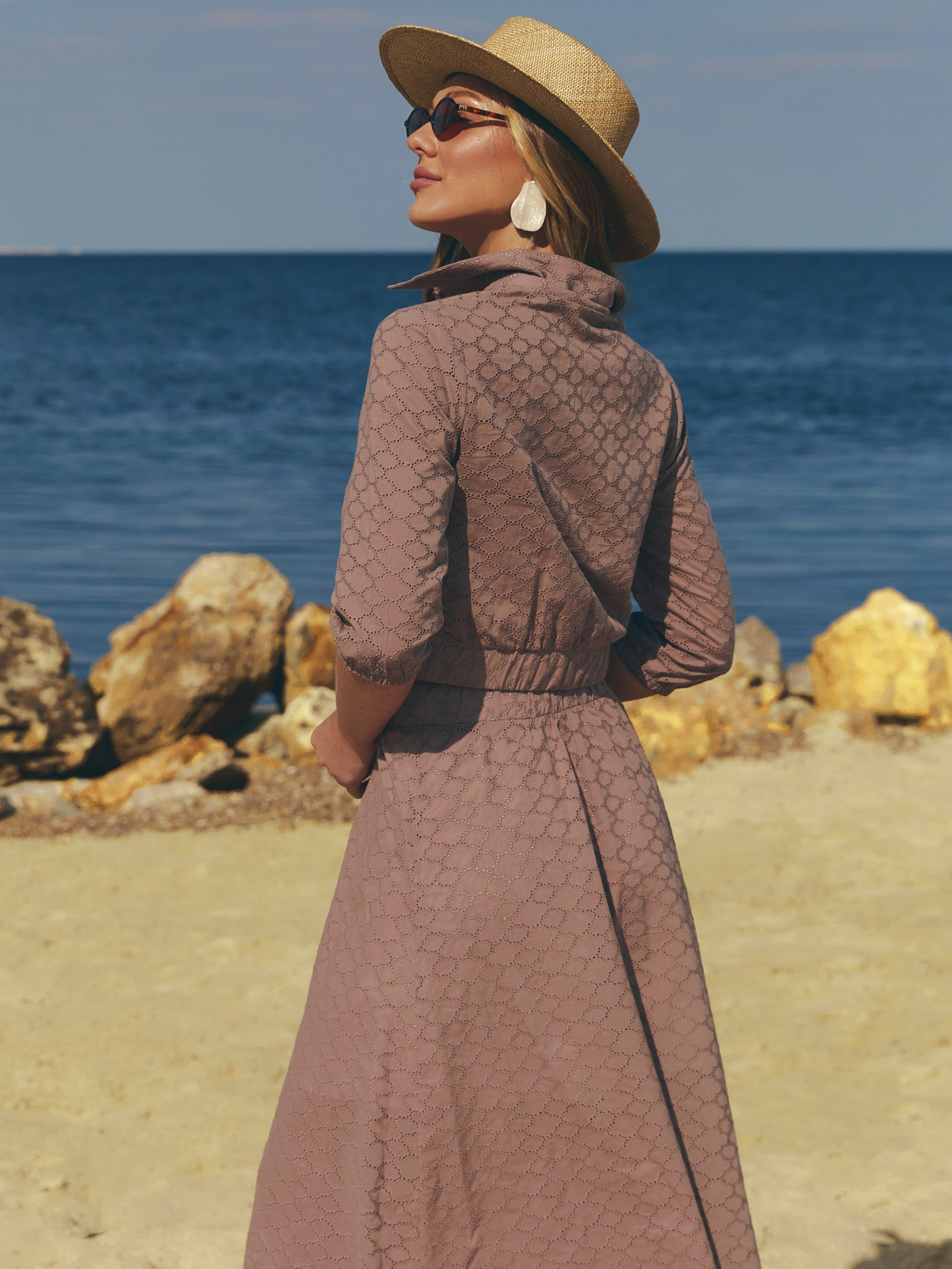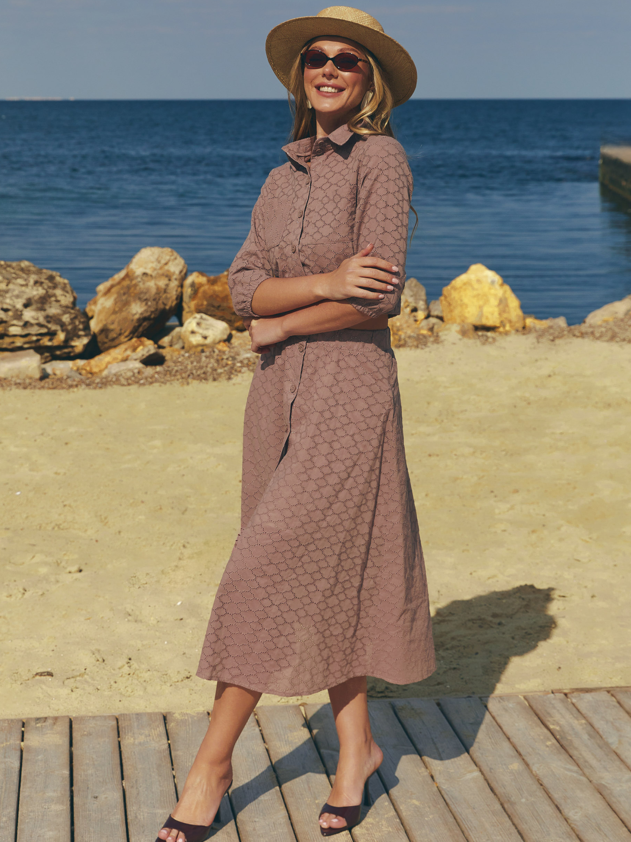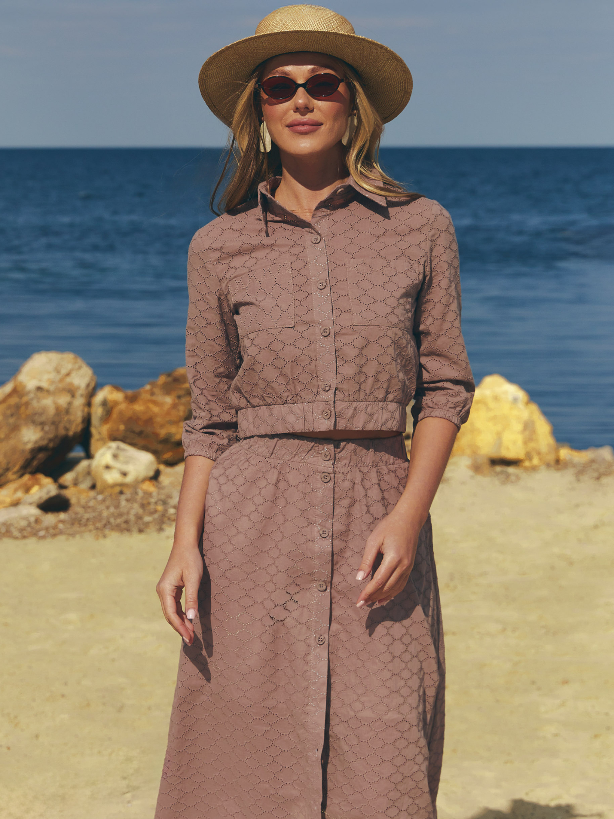 Летний костюм из прошвы Фасон Легкий, свободный силуэт — словно мечта о беззаботном лете. В образе — рубашечный воротник, накладные карманы и функциональные пуговицы, которые придают изящность и практичность. Эластичные резинки на рукавах, поясе и низу кофты нежно облегают, не сковывая движений, создавая эффект романтичного «летодраза» в каждом шаге. Комплект состоит из мягкой кофты и юбки — идеальный баланс женственности и комфорта. Материал Изготовлен из натуральной хлопковой прошвы, нежной к коже, охлаждающей в жару и приятной на ощупь. Легкая подкладка добавляет структуру, а ручная стирка при 30° гарантирует долгий срок службы ткани и сохранение цвета молочного ириса. Размерная сетка: S-M: Обхват груди — 84–88 см, обхват талии — 68–72 см, обхват бедер — 88–92 см. L-XL: Обхват груди — 92–96 см, обхват талии — 76–81 см, обхват бедер — 96–100 см. XXL-3XL: Обхват груди — 100–105 см, обхват талии — 86–91 см, обхват бедер — 105–110 см. Длина изделия: S-M = 47 см, L-XL = 48 см, XXL-3XL = 50 см Длина рукава: S-M = 44 см, L-XL = 45 см, XXL-3XL = 46 см Длина брюк: S-M = 78 см, L-XL = 78 см, XXL-3XL = 78 см Уход за изделием простой и удобный: рекомендуется бережная стирка при низкой температуре, чтобы сохранить форму и структуру ткани, а также избежать усадки. Глажка — умеренная, при необходимости.