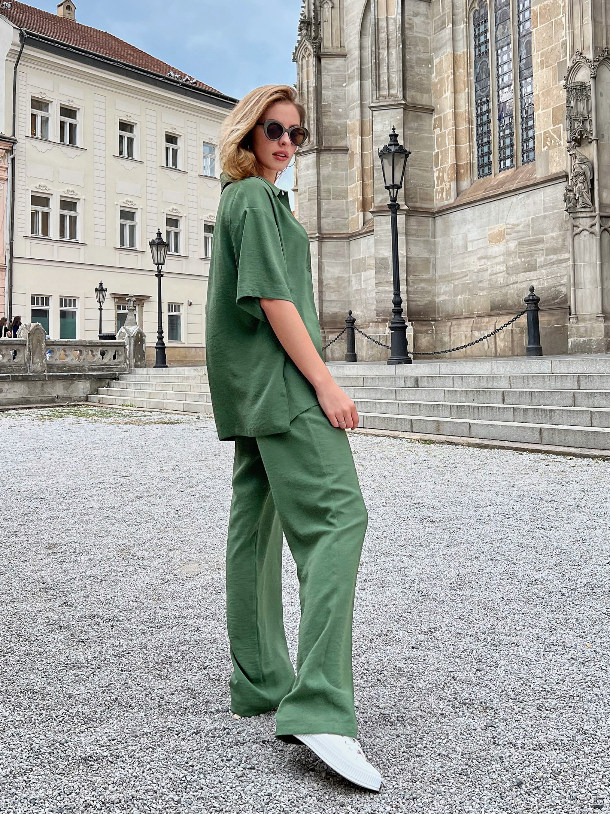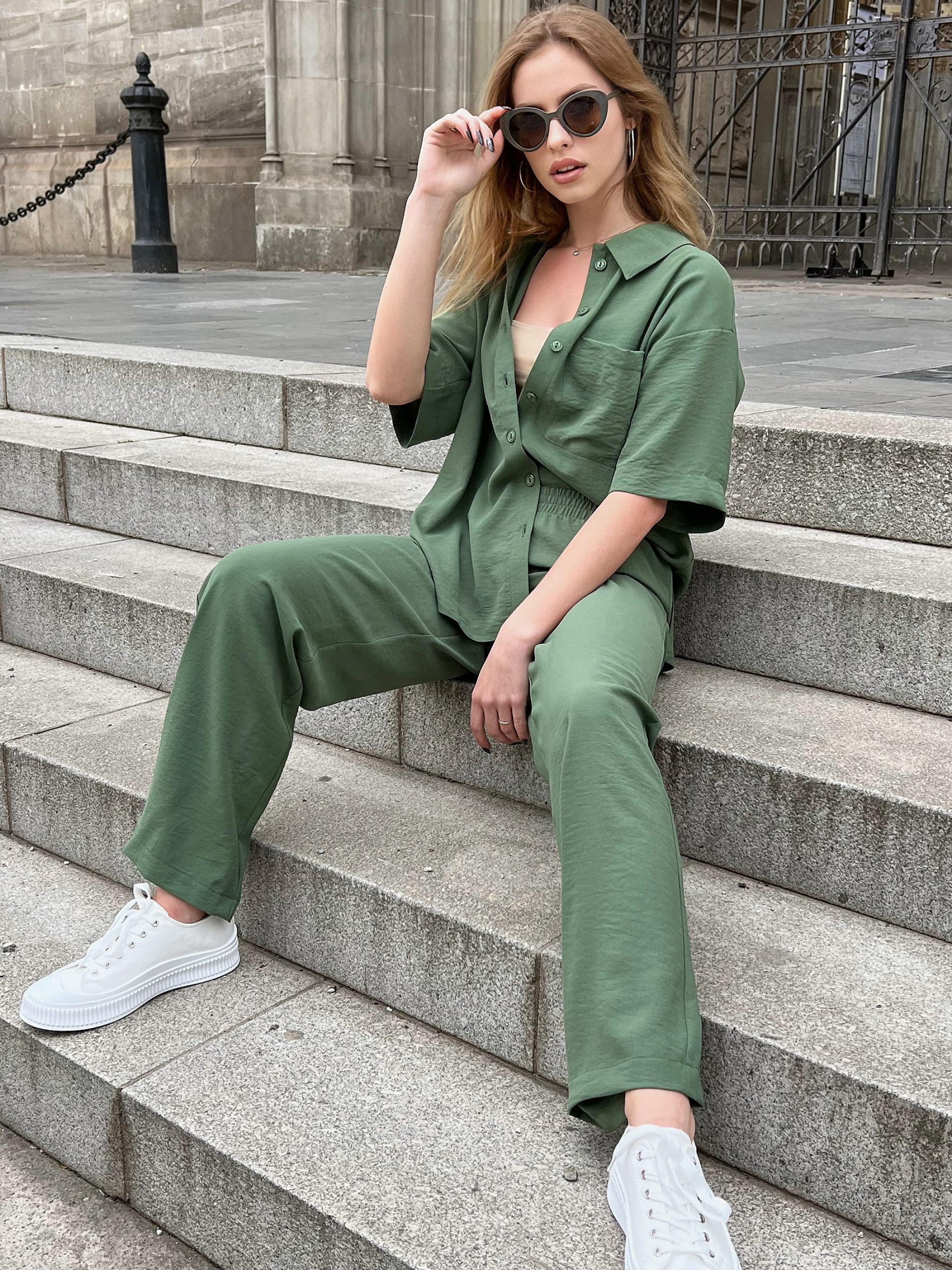 Костюм с высокой посадкой Состоит из удлинённой рубашки прямого кроя и брюк с высокой посадкой, которые гармонично подчёркивают фигуру и создают утончённый силуэт. Фасон рубашки: Удлинённый крой добавляет образу строгости и изысканности. Свободная посадка обеспечивает комфорт и свободу движений. Двубортная застёжка с декоративными пуговицами выглядит стильно и придаёт классический акцент. Лацканы и прямой низ подчёркивают геометричность силуэта. Фасон брюк: Высокая посадка акцентирует внимание на талии, делая фигуру стройнее. Прямой крой брючин добавляет лаконичности, что делает костюм универсальным. Эластичный пояс с застёжкой обеспечивает идеальную посадку и комфорт. Функциональные карманы добавляют практичности. Основные характеристики: Материал: эластичная костюмная ткань — мягкая, приятная к телу, хорошо держит форму. Посадка: высокая, акцентирует на талии. Крой: прямой, слегка зауженный к низу. Детали: пояс с декоративной фурнитурой, функциональные карманы. Сезон: демисезон. Уход: деликатная ручная стирка при температуре до 30°C. Размерная сетка: S-M: Обхват груди: 84–88 см; Талия: 68–72 см; Бёдра: 92–96 см; Длина изделия: 70,5 см; Длина брюк: 105 см. L-XL: Обхват груди: 92–96 см; Талия: 76–81 см; Бёдра: 100–105 см; Длина изделия: 72 см; Длина брюк: 106 см.