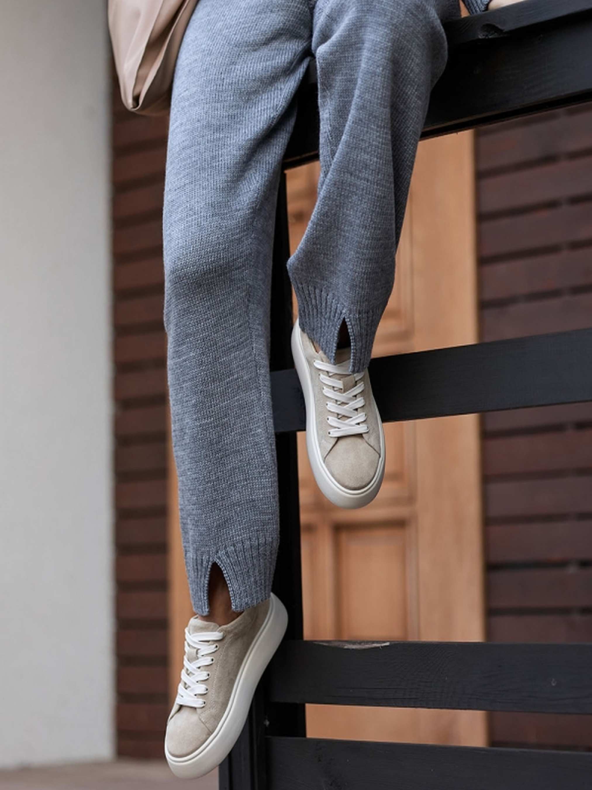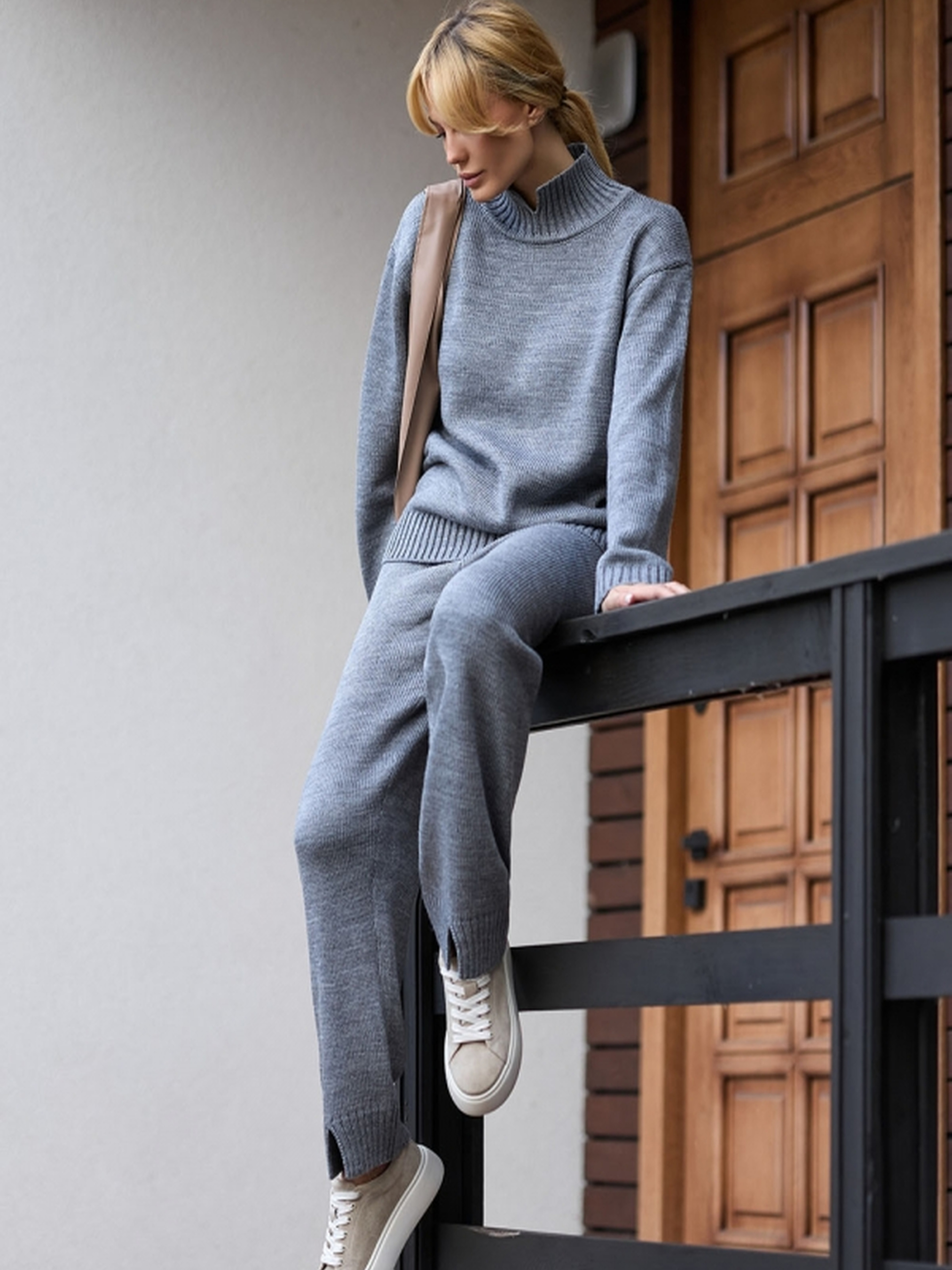 Цей стильний комплект, виконаний з м'якої напіввовняної пряжі, ідеально підійде для створення комфортних та теплих образів у прохолодну погоду. Виготовлений з увагою до деталей, він поєднує в собі стиль та функціональність. Джемпер:• Прямий силует з горловиною-стійкою, що додає елегантності.• Горловина доповнена акуратним розрізом, що надає виробу особливого шарму.• Завдяки м'якій та теплій напіввовняній пряжі джемпер забезпечує комфорт протягом всього дня.• Розміри джемпера: Довжина по спинці: 64-66 см (+-2 см) Ширина під проймою та у талії в спокійному нерозтягнутому стані: 51-56 см В розтягнутому стані: 57-62 см Ширина по низу: 44-47 см Довжина рукава: 52-51 см Ширина плеча: 14-17 см Висота коміру: 9 см Штани:• Прямий силует з природною посадкою на талії.• Манжети з розрізом на низу штанів додають оригінальності та підкреслюють стиль.• Легко комбінується з іншими елементами гардеробу, що робить його універсальним для різних образів.• Розміри штанів: Довжина по бічному шву: 105 см Довжина крокового шву: 74-73 см Висота посадки: 34-36 см Ширина у талії в спокійному нерозтягнутому стані: 24-27 см В розтягнутому стані: 39-42 см Ширина у стегнах: 31-33 см Ширина штанини по низу: 20-22 см Розріз: 6 см Цей комплект підходить для будь-якої ситуації, від комфортного відпочинку до стильного виходу на вулицю, додаючи затишку та елегантності вашому вигляду.
