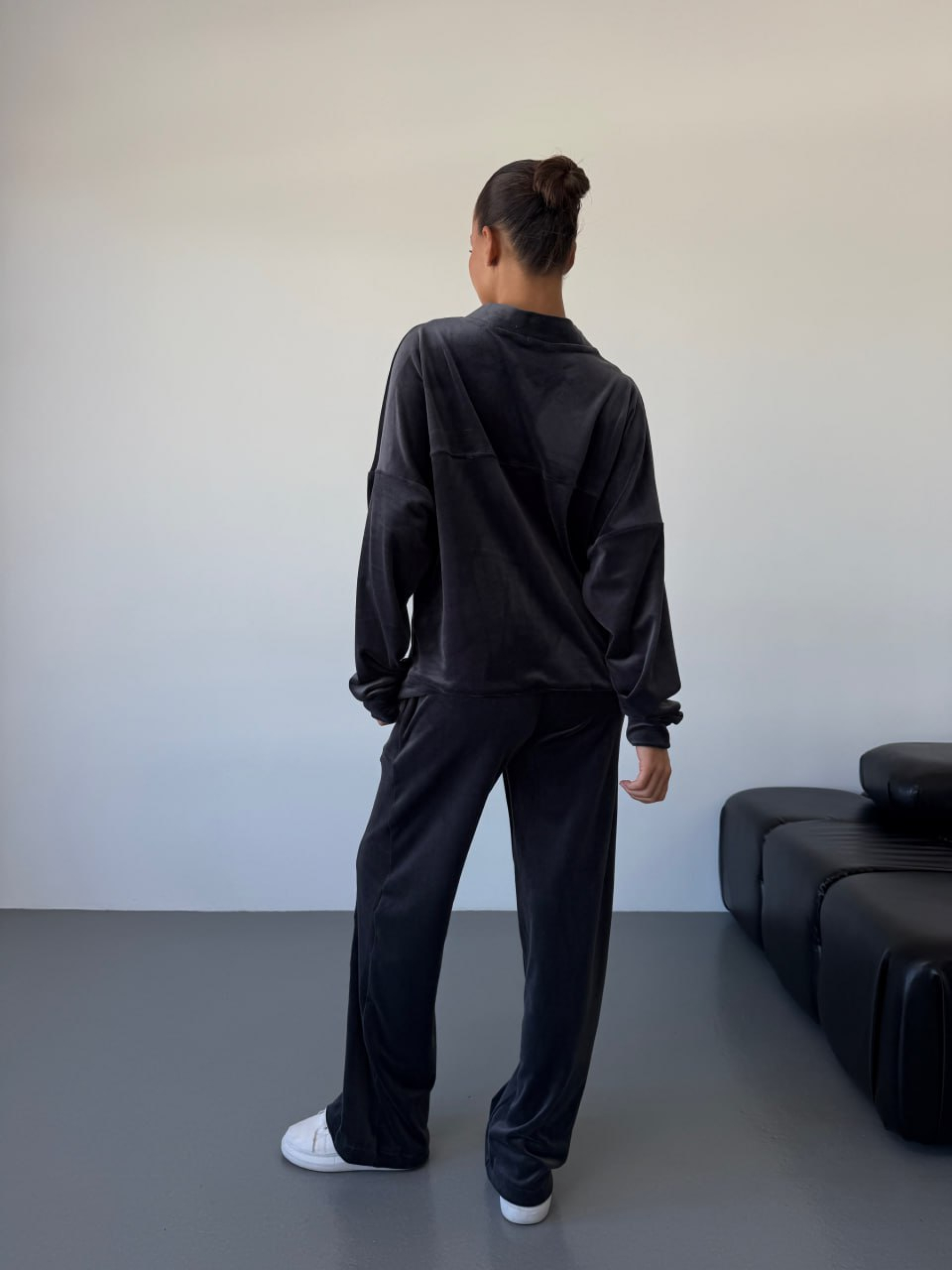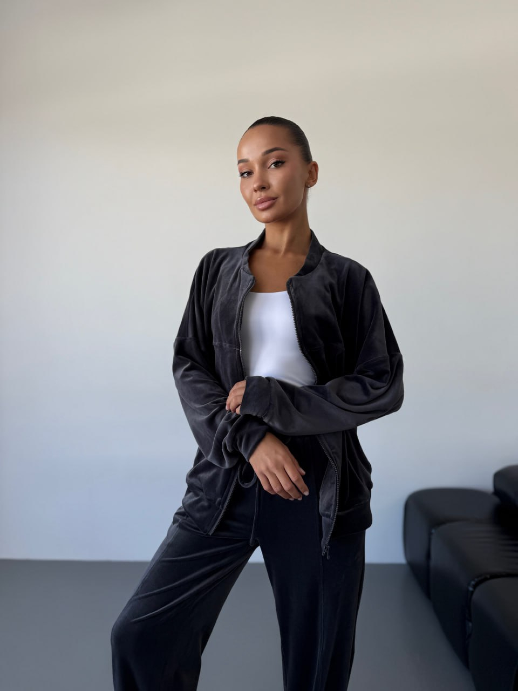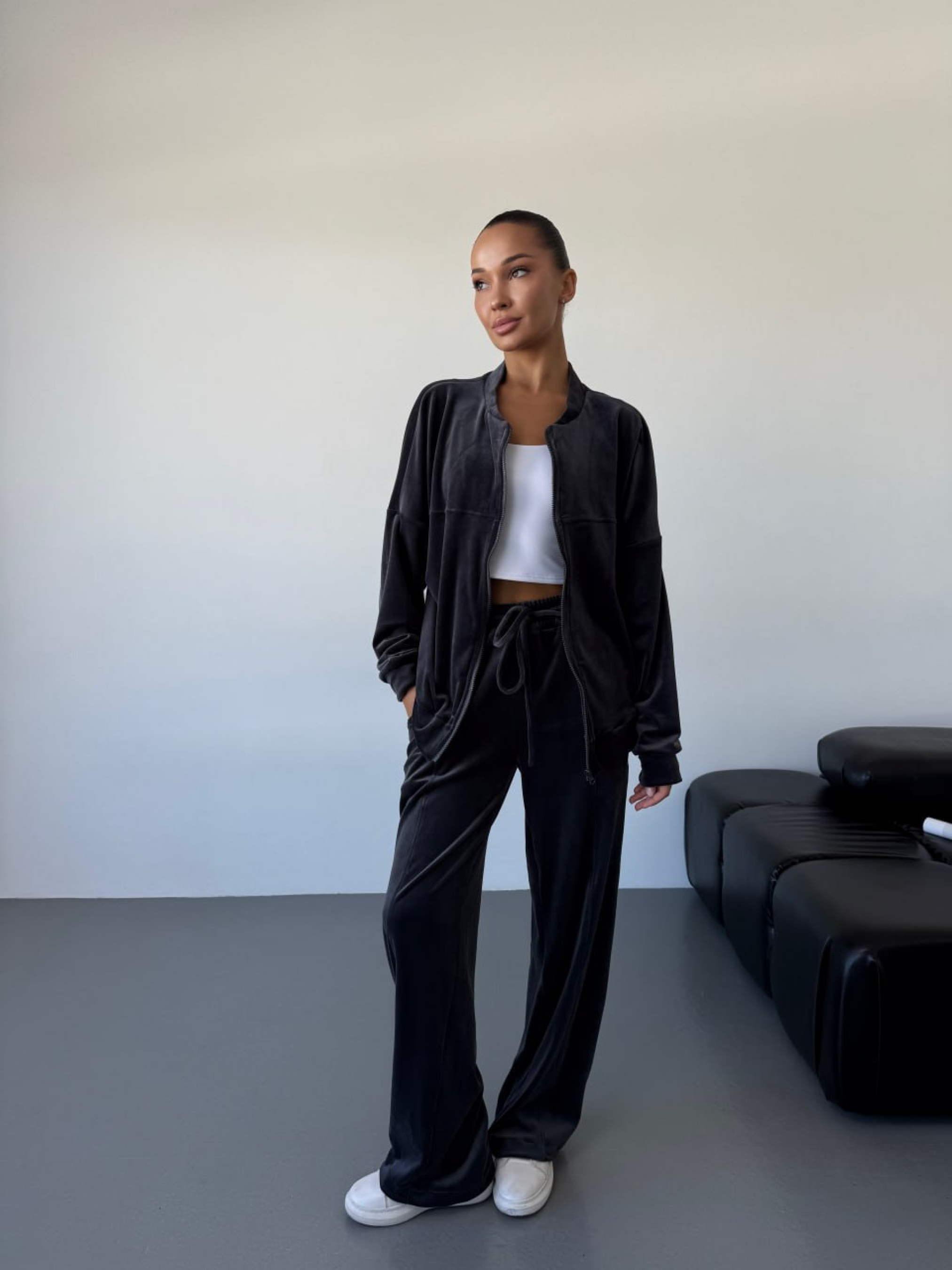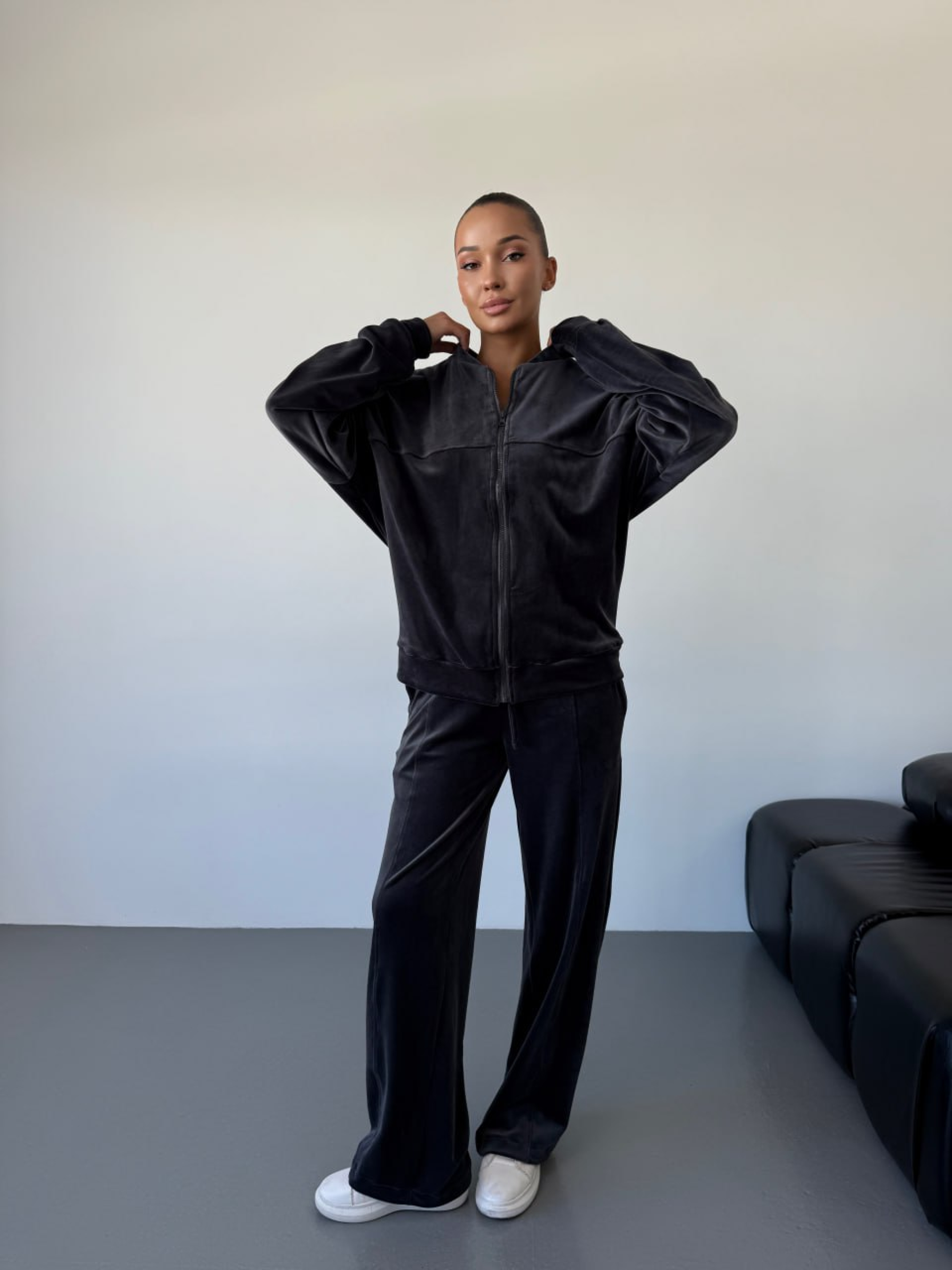 Жіночий велюровий костюм на блискавці (кофта + штани) у глибокому чорному та графітовому кольорах — це безпрограшна класика для вашого повсякденного гардероба. Комплект поєднує в собі стриману елегантність та максимальний комфорт, що робить його універсальним рішенням для прогулянок, подорожей або активного відпочинку. Чому цей чорний велюровий костюм стане вашою улюбленою базою? Функціональна кофта: Застібка на змійці дозволяє легко регулювати рівень тепла та зручно одягати виріб. Довгий рукав забезпечує додатковий захист від вітру. Зручні штани: Продуманий крій не обмежує рухів, а непомітні кишені у бічних швах додають практичності, дозволяючи мати під рукою необхідні дрібниці. Універсальні кольори: Однотонний чорний чи графітовий комплект візуально стрункішає і легко поєднується з будь-яким взуттям — від спортивних кросівок до повсякденних черевиків. Українське виробництво: Ми гарантуємо високу якість кожного шва та надійність фурнітури, створюючи одяг, у якому ви почуватиметеся впевнено. Характеристики: Комплектація: Кофта + штани Колір: Чорний, графітовий Матеріал: Велюр Склад: 80% Бавовна, 20% Поліестер Довжина рукава: Довгий Застібка: На змійці (блискавка) Тип кишень: У шві Стиль: Повсякденний (Casual) Сезон: Демісезон Країна виробник: Україна Рекомендації з догляду: Для збереження бездоганного вигляду велюру: Прання: Використовуйте делікатний режим при температурі не вище 30°C. Перед пранням обов'язково вивертайте костюм навиворіт. Засоби: Рекомендовано застосовувати рідкі гелі, щоб уникнути розводів на темній ворсистій тканині. Сушіння: Сушіть у розправленому вигляді природним шляхом, уникаючи прямих сонячних променів. Прасування: Прасуйте виключно з вивороту на низькій температурі або використовуйте вертикальне відпарювання. Костюм створений з урахуванням анатомії тіла, що гарантує ідеальну посадку на будь-яку фігуру. Висока якість велюру та майстерне пошиття забезпечують виробу довговічність та стійкість до зношування, дозволяючи вам насолоджуватися улюбленим комплектом протягом багатьох сезонів.