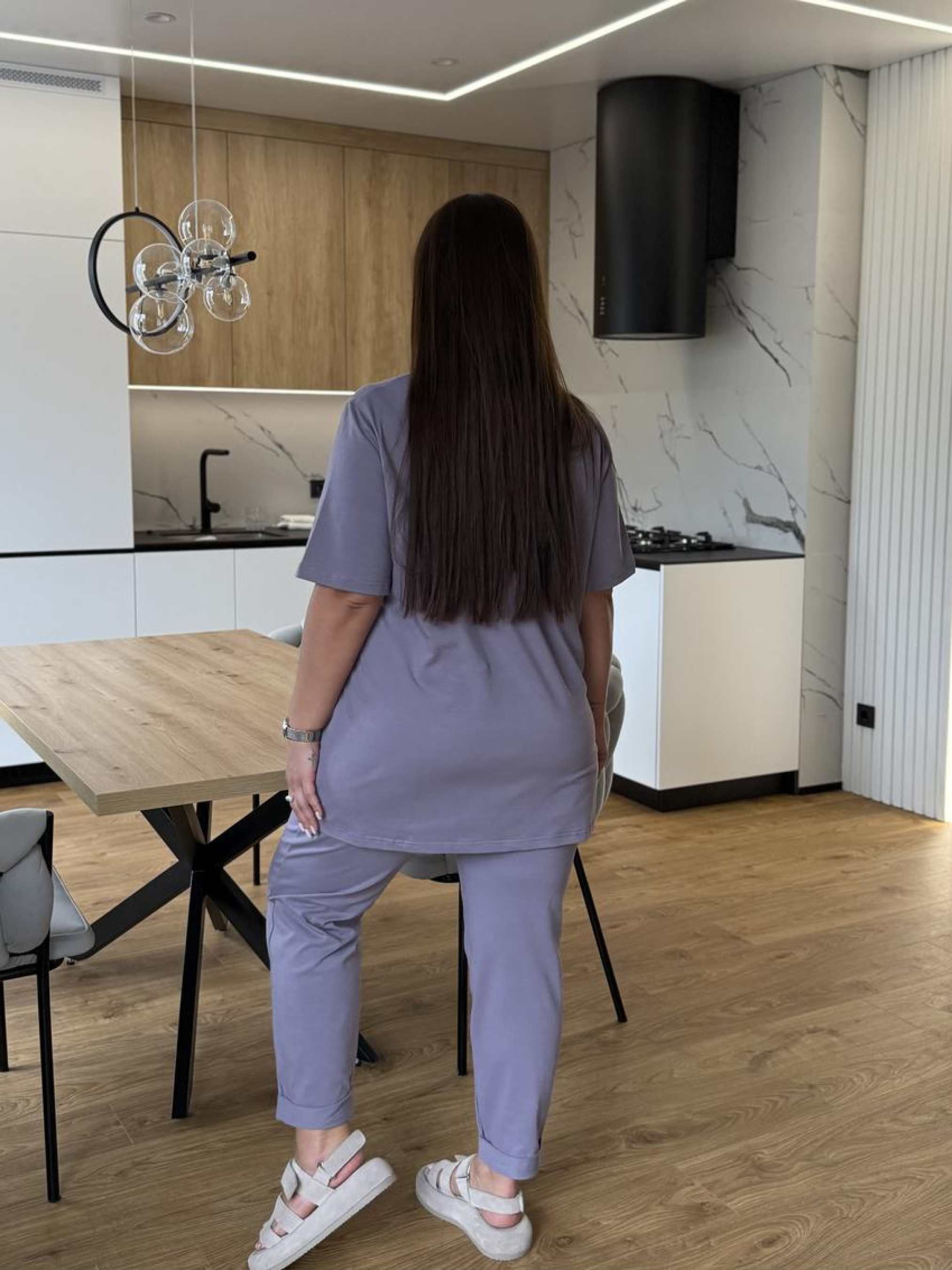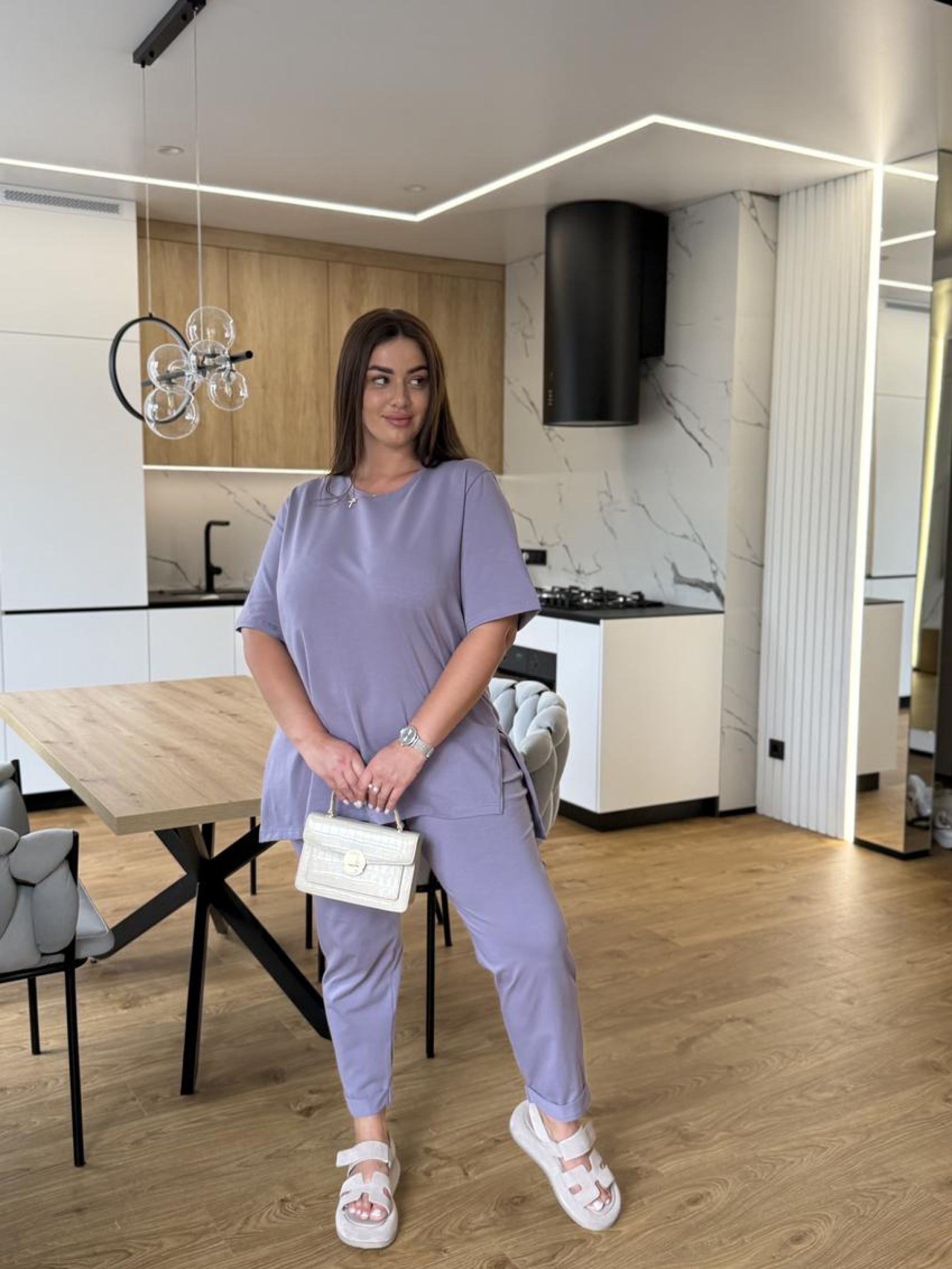 Женский летний костюм: брюки с карманами и футболка с разрезами и асимметрией Легкий и удобный женский летний костюм, который сочетает комфорт и современный стиль. Изготовлен из дышащих материалов, обеспечивает прохладу даже в жаркую погоду. Идеален для прогулок, отдыха и повседневной носки. Особенности модели Брюки: прямого кроя, удобные карманы, комфортная посадка. Футболка: оригинальная асимметрия спереди, стильные боковые разрезы, свободный фасон. Материал: легкий летний трикотаж, приятный к телу. Преимущества Универсальный образ: подходит для города, отдыха и путешествий. Комфорт в жаркие дни благодаря легкой ткани. Стильный акцент: асимметрия и боковые разрезы придают оригинальност