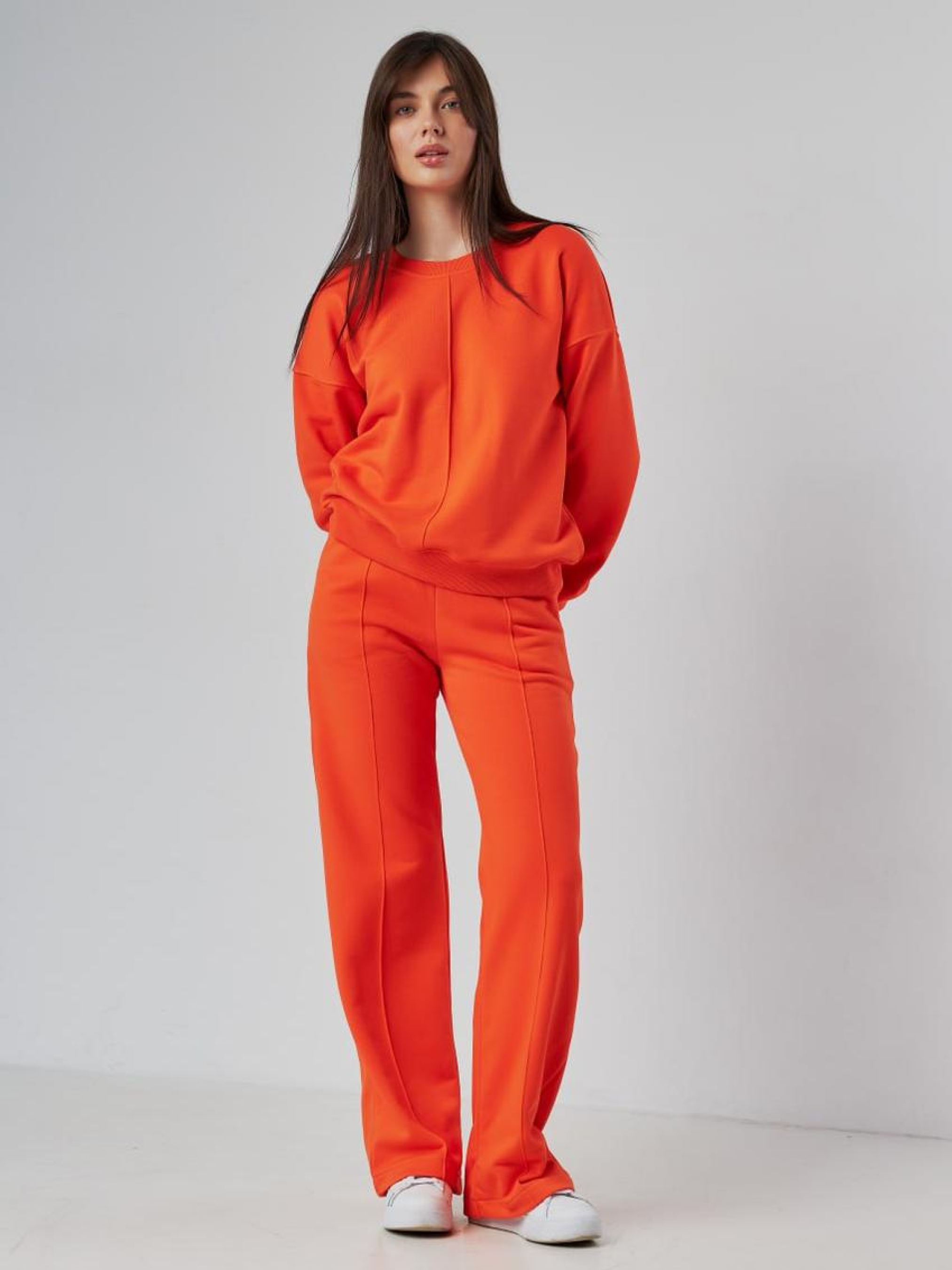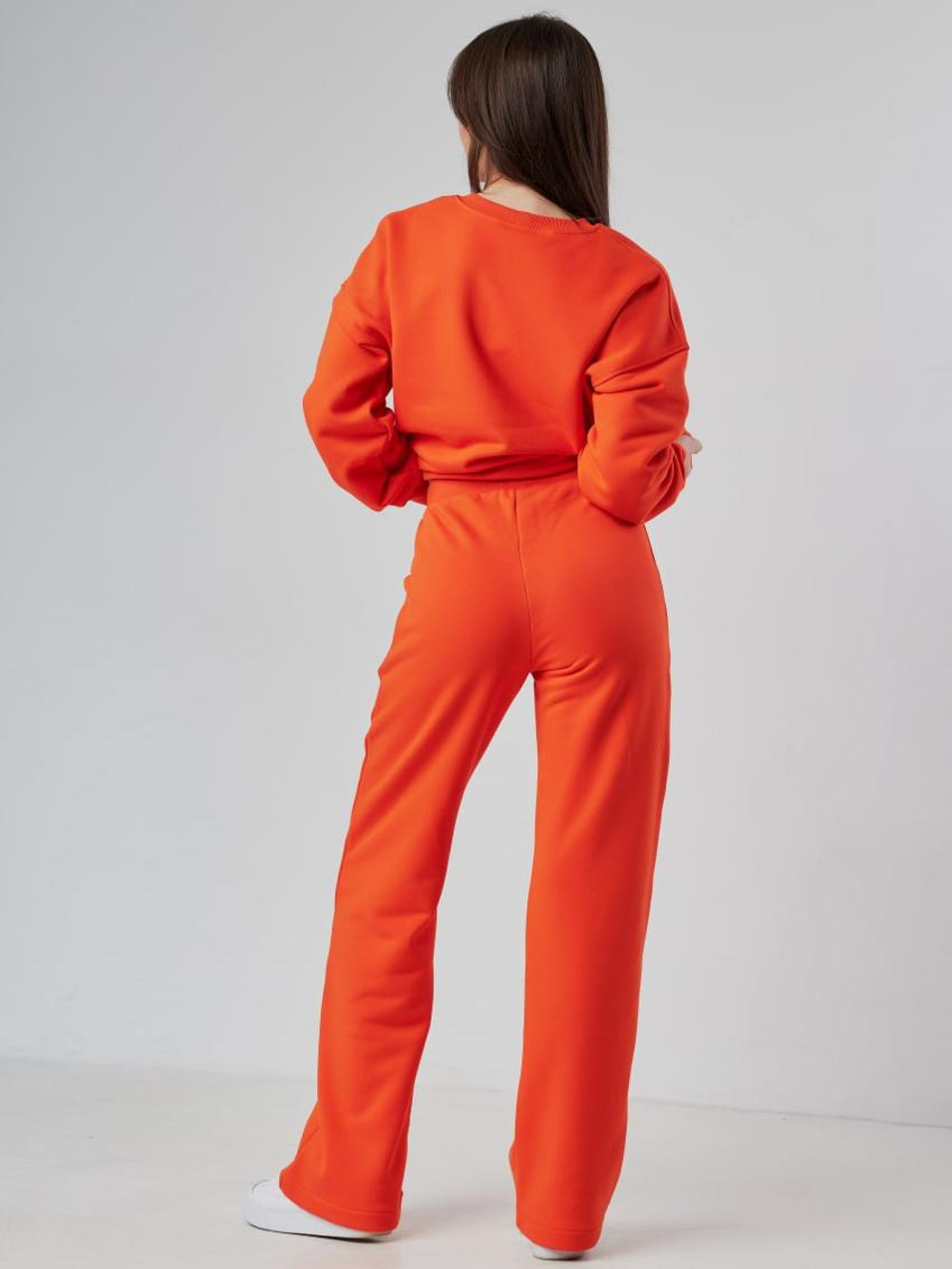 Женский спортивный костюм со свитшотом и брюками палаццо — элегантность в спортивном исполнении Стильный женский костюм, сочетающий свободный свитшот и брюки палаццо, создаёт образ, который одновременно дарит комфорт и подчёркивает женственность. Такой комплект идеально подойдёт для прогулок, домашней работы, путешествий или активного отдыха в городе. Свитшот имеет удобный крой, мягкую фактуру и эластичные вставки по краям, не сковывает движений и отлично сочетается с широкими брюками. Брюки палаццо — фасон с прямыми расклешёнными штанинами, который красиво ложится по фигуре. Они визуально удлиняют ноги и придают силуэту утончённости. Эластичный пояс обеспечивает комфорт в течение всего дня. Преимущества: Оригинальное сочетание спорта и женственности Свитшот свободного кроя — удобство и лёгкость Брюки палаццо — модная альтернатива классическим джоггерам Подходит для разных типов фигуры Идеален для повседневной носки Женский костюм со свитшотом и палаццо — это комфорт в сочетании с effortless стилем!