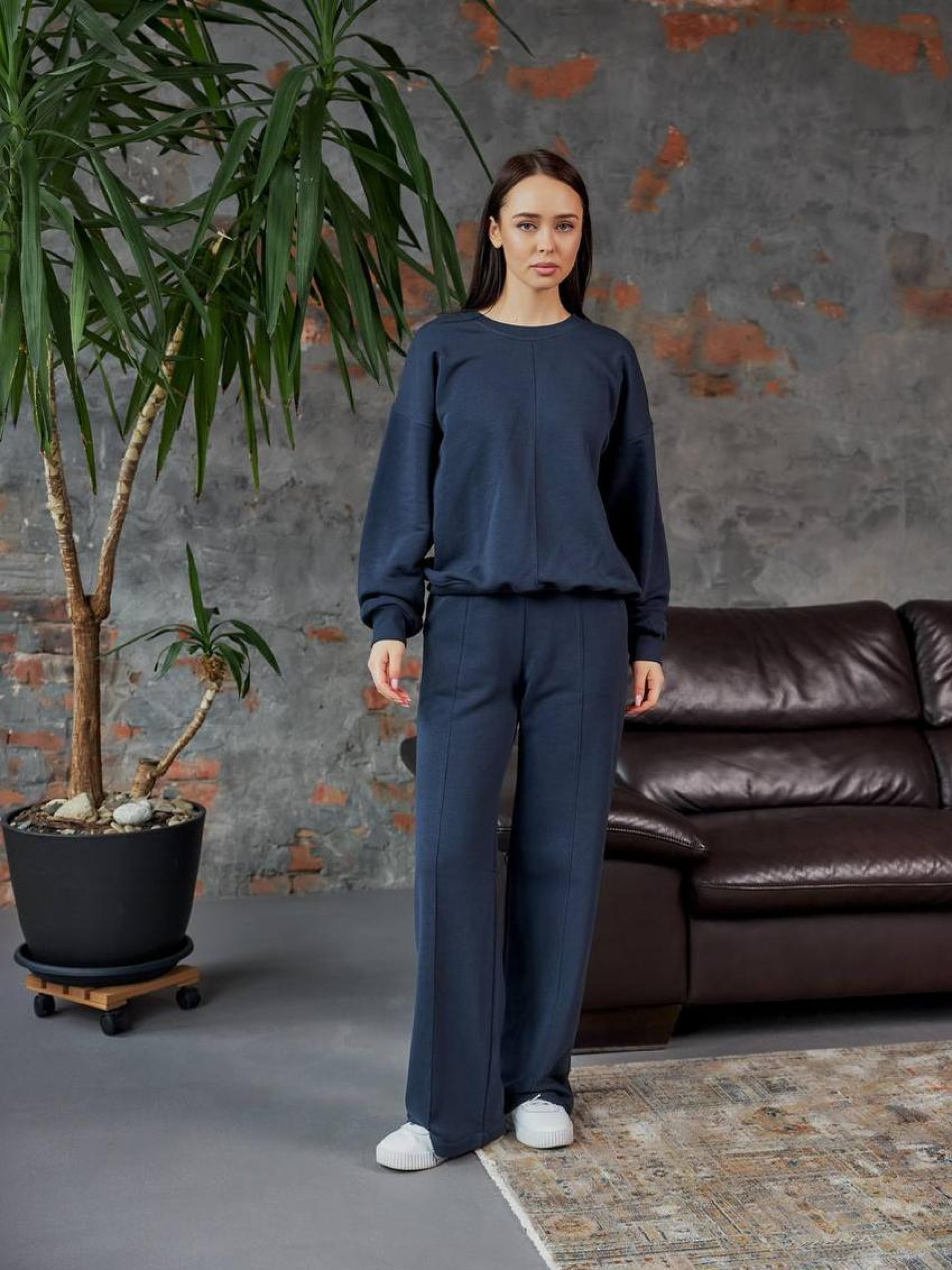 Женский спортивный костюм со свитшотом и брюками палаццо — элегантность в спортивном исполнении Стильный женский костюм, сочетающий свободный свитшот и брюки палаццо, создаёт образ, который одновременно дарит комфорт и подчёркивает женственность. Такой комплект идеально подойдёт для прогулок, домашней работы, путешествий или активного отдыха в городе. Свитшот имеет удобный крой, мягкую фактуру и эластичные вставки по краям, не сковывает движений и отлично сочетается с широкими брюками. Брюки палаццо — фасон с прямыми расклешёнными штанинами, который красиво ложится по фигуре. Они визуально удлиняют ноги и придают силуэту утончённости. Эластичный пояс обеспечивает комфорт в течение всего дня. Преимущества: Оригинальное сочетание спорта и женственности Свитшот свободного кроя — удобство и лёгкость Брюки палаццо — модная альтернатива классическим джоггерам Подходит для разных типов фигуры Идеален для повседневной носки Женский костюм со свитшотом и палаццо — это комфорт в сочетании с effortless стилем!