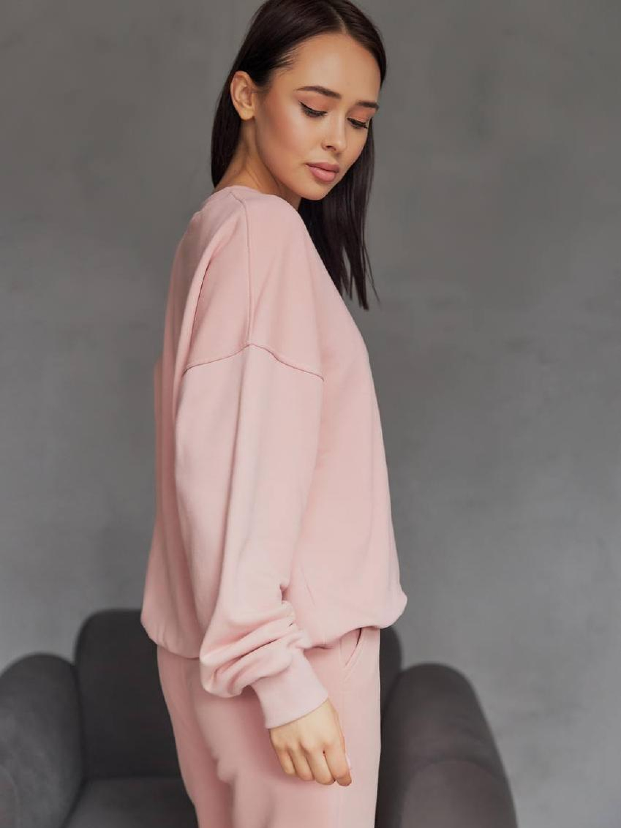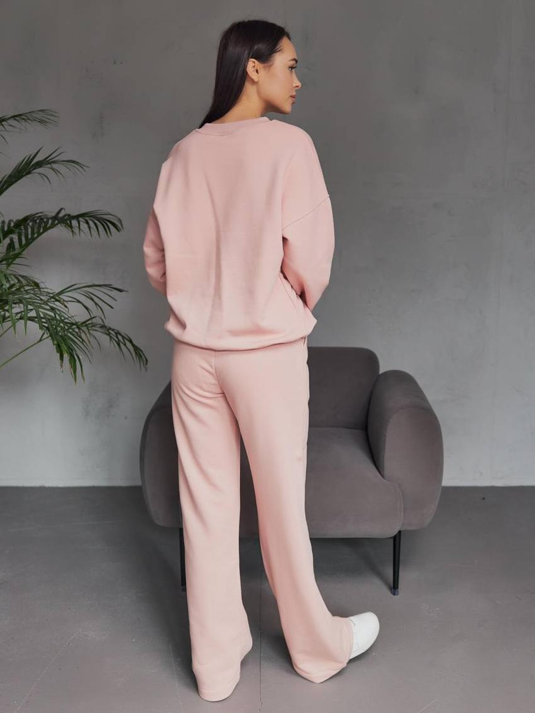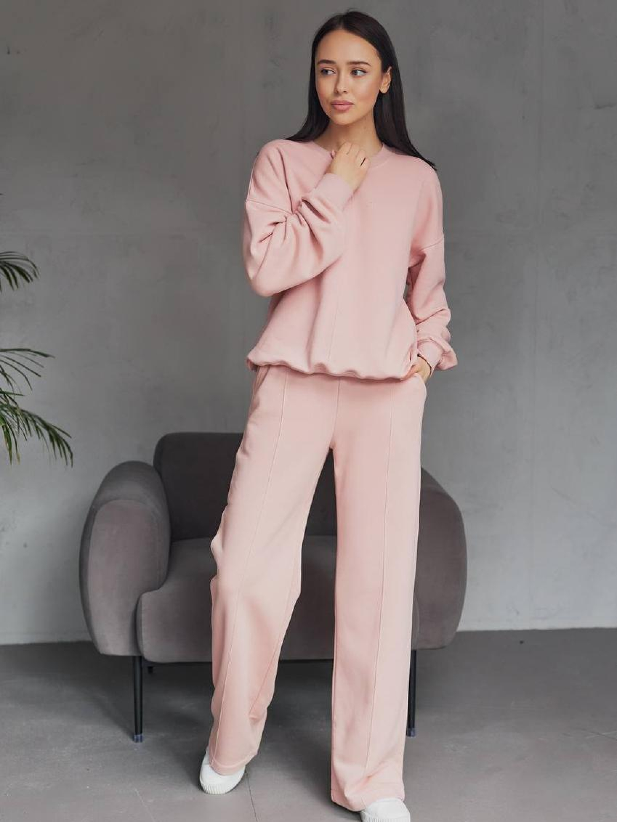 Женский спортивный костюм со свитшотом и брюками палаццо — элегантность в спортивном исполнении Стильный женский костюм, сочетающий свободный свитшот и брюки палаццо, создаёт образ, который одновременно дарит комфорт и подчёркивает женственность. Такой комплект идеально подойдёт для прогулок, домашней работы, путешествий или активного отдыха в городе. Свитшот имеет удобный крой, мягкую фактуру и эластичные вставки по краям, не сковывает движений и отлично сочетается с широкими брюками. Брюки палаццо — фасон с прямыми расклешёнными штанинами, который красиво ложится по фигуре. Они визуально удлиняют ноги и придают силуэту утончённости. Эластичный пояс обеспечивает комфорт в течение всего дня. Преимущества: Оригинальное сочетание спорта и женственности Свитшот свободного кроя — удобство и лёгкость Брюки палаццо — модная альтернатива классическим джоггерам Подходит для разных типов фигуры Идеален для повседневной носки Женский костюм со свитшотом и палаццо — это комфорт в сочетании с effortless стилем!