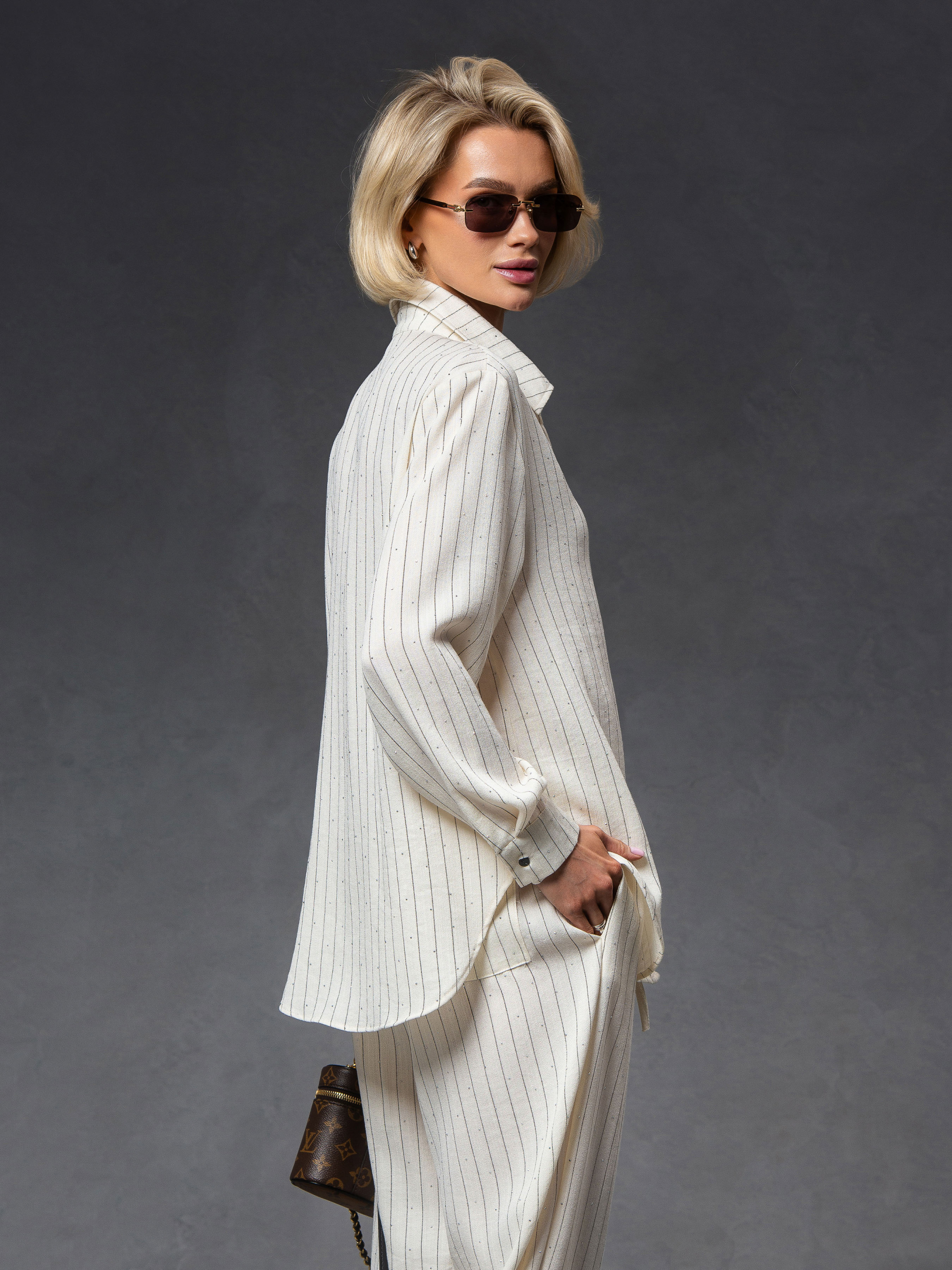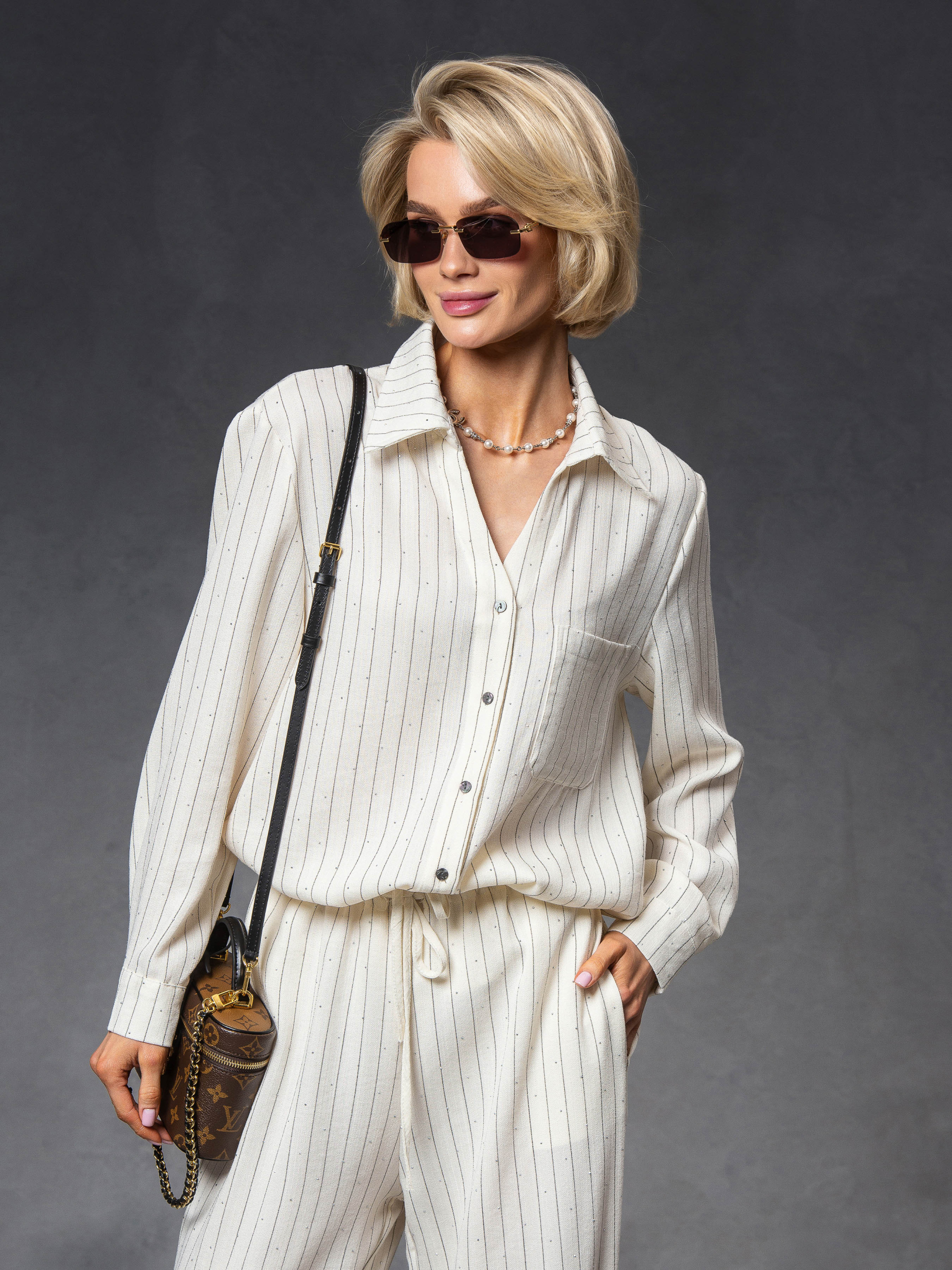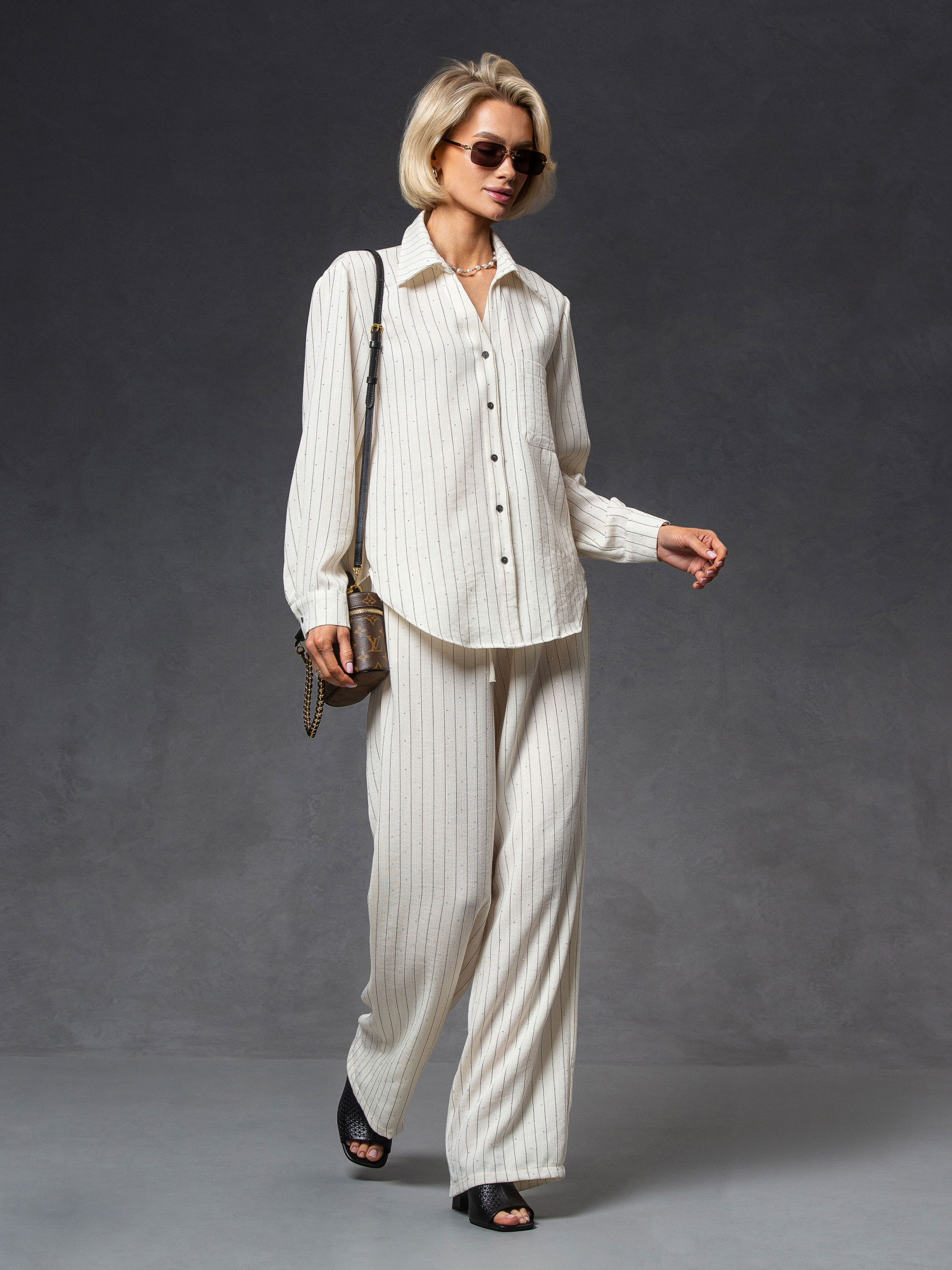 Женский костюм в полоску с мерцающими камешками – элегантность в каждом движении. Стильный комплект из натуральной ткани — идеальный выбор для тех, кто ценит комфорт и изысканные детали. Особенность этого костюма — мелкие камешки, расположенные по всей поверхности ткани. Состав ткани: 70% лен, 30% полиэстер – натуральная текстура льна в сочетании с полиэстером обеспечивает комфорт, легкость и износостойкость. Отделка: Стразы, которые надежно закреплены с помощью термоклеевой технологии – не отпадают, сохраняя безупречный вид даже после многократной стирки. Особенности модели: • Свободный крой рубашки • Просторные штаны – максимальный комфорт в движении • Декор в виде мерцающих в свете микрокамешков. • Идеальный вариант для путешествий, прогулок или smart-casual образов Этот костюм выглядит сдержанно, но при более близком рассмотрении поражает продуманными деталями. В размерной сети указаны объемы тела, на которые подходит изделие, а не замеры самого изделия. Рост модели на фото 171 см.