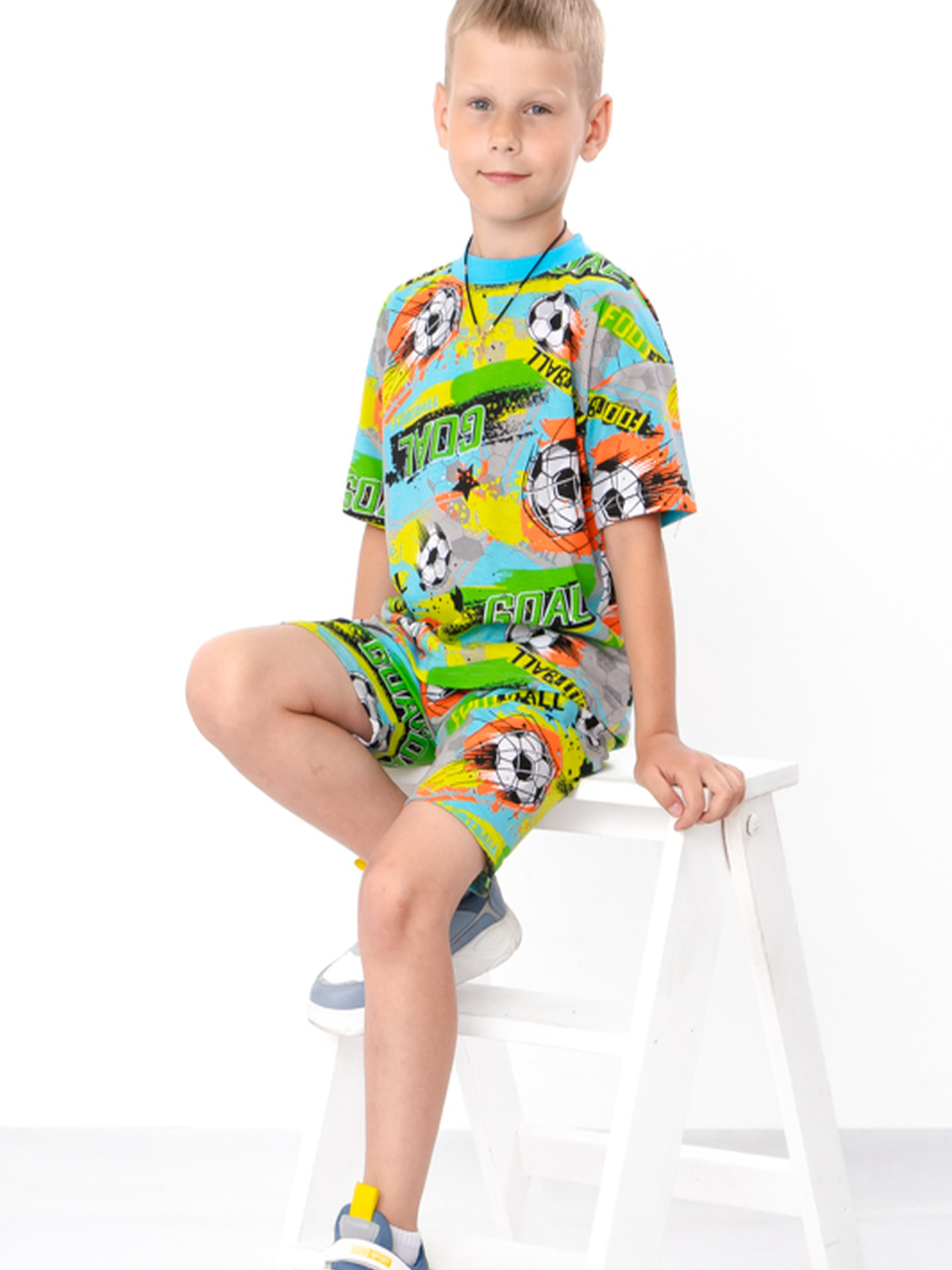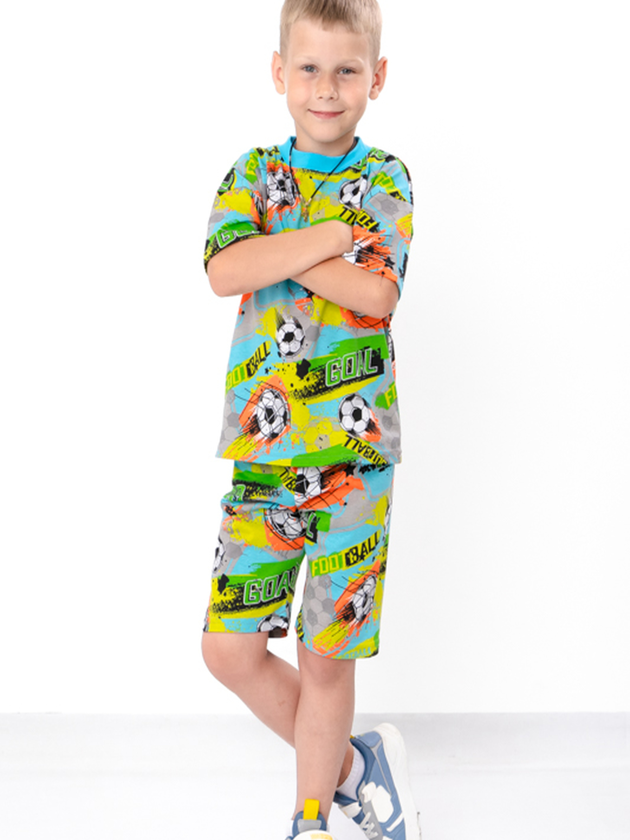 Полотно: кулір принтований Склад полотна: 100% бавовна Зріст: 104–134 см Комплект для хлопчика (футболка + шорти), зріст 104–134 см — це зручний та стильний літній варіант для активних дітей. Виготовлений із дихаючого трикотажу, він забезпечує комфорт у спекотну погоду. Футболка з коротким рукавом та яскравим принтом, шорти — з еластичним поясом і вільним кроєм. Ідеально підходить для прогулянок, ігор та відпочинку.