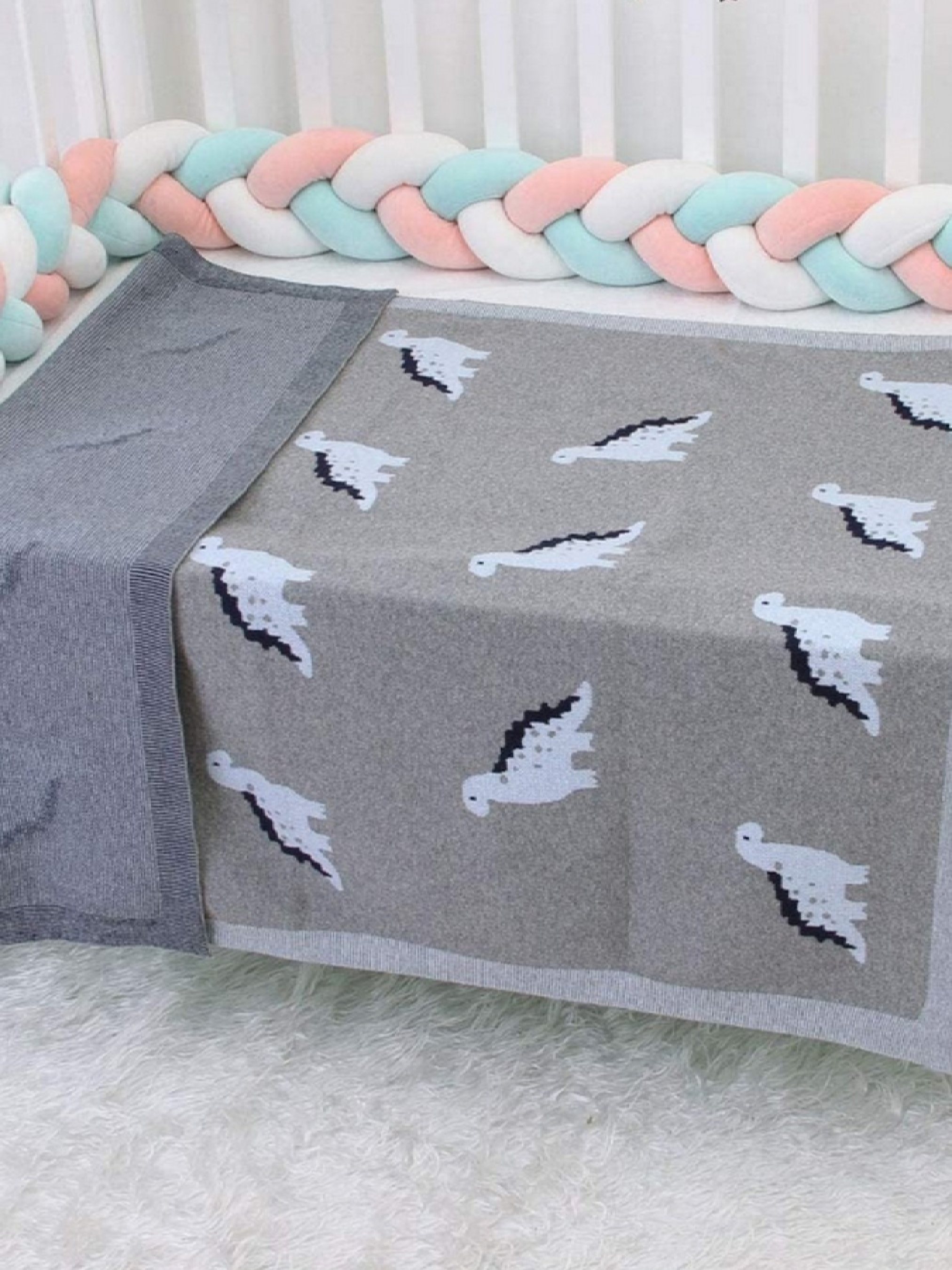 Lovely Svi Плед Детский Хлопок Вязаный Серый Динозаврики