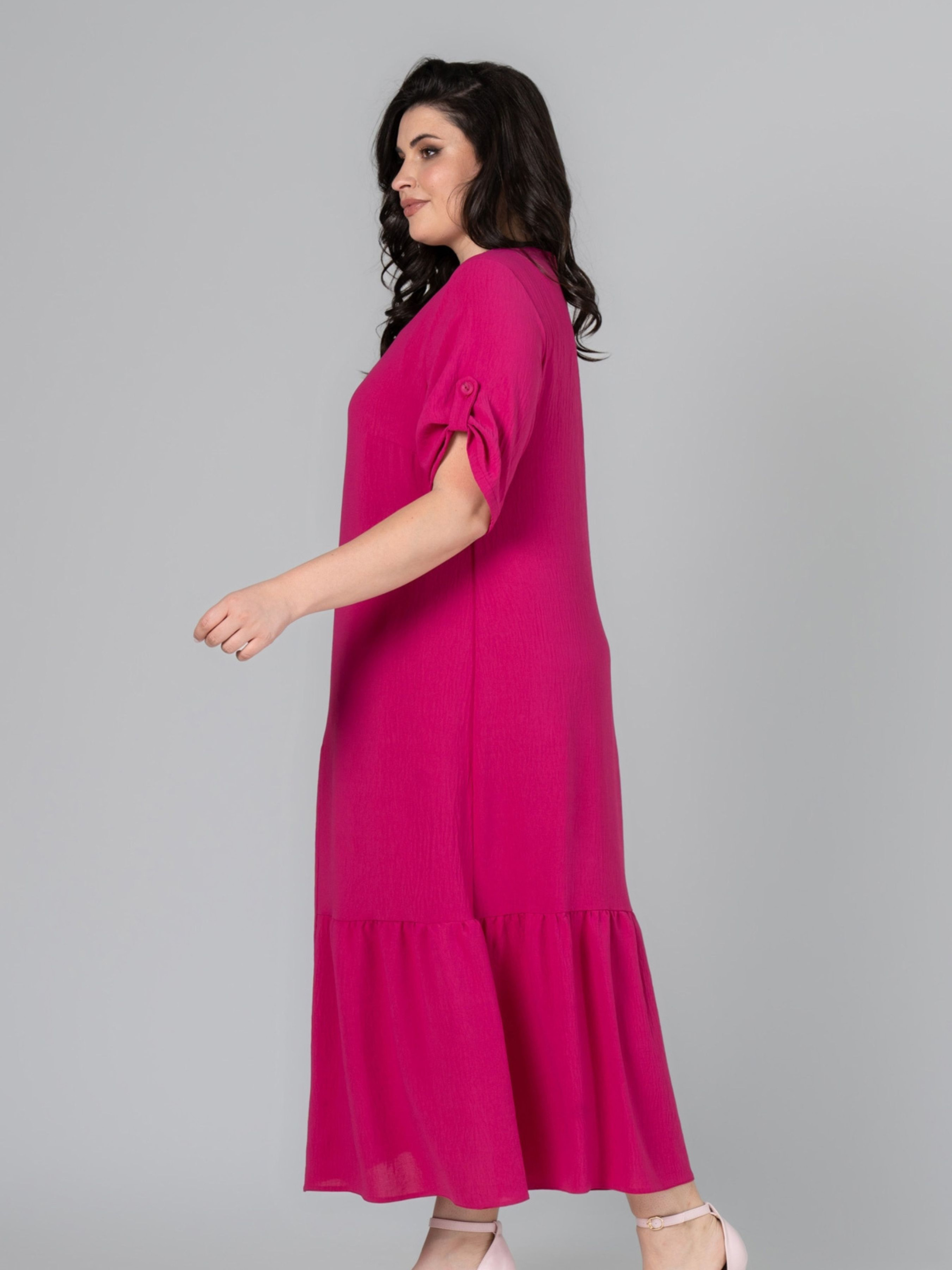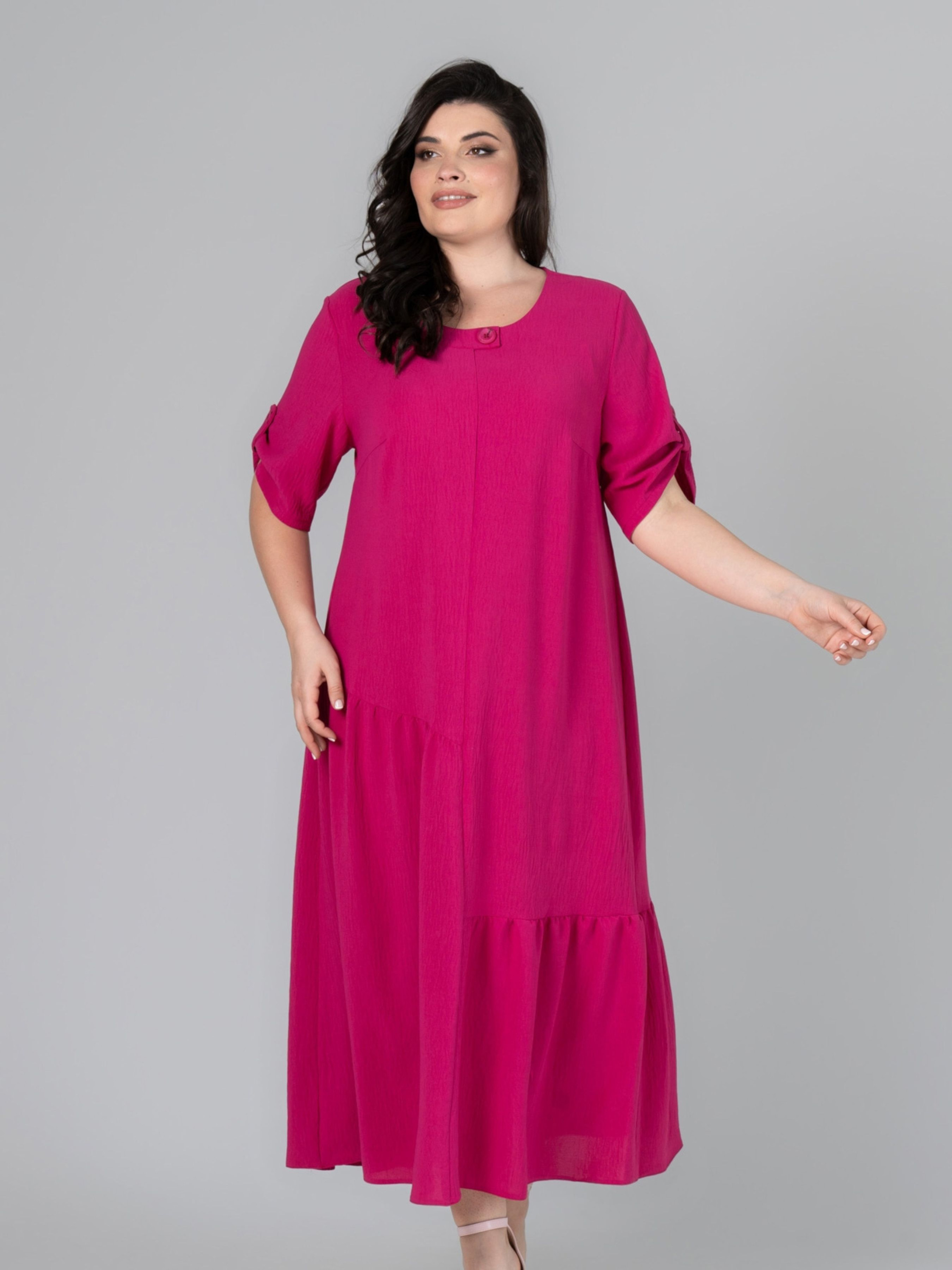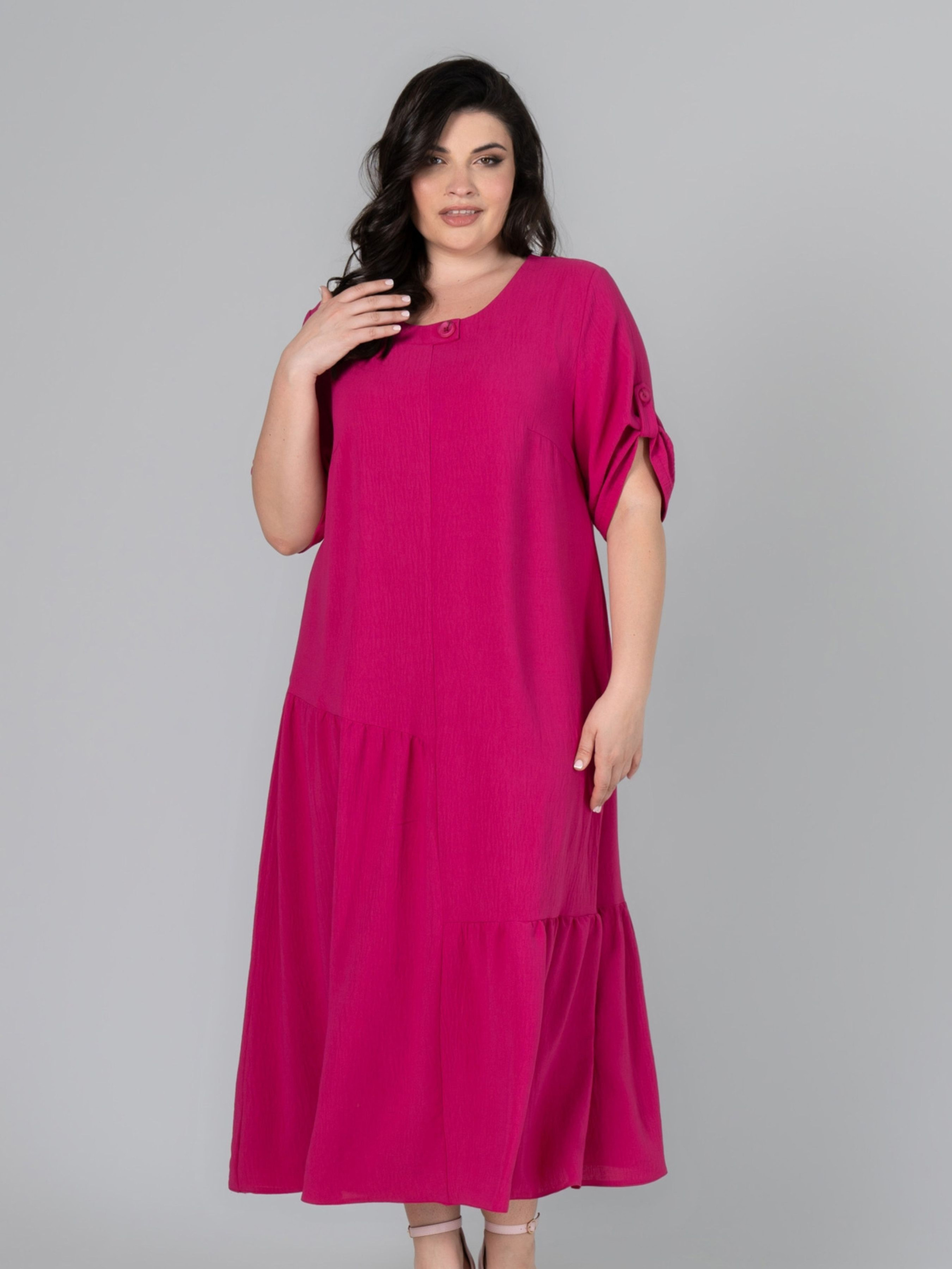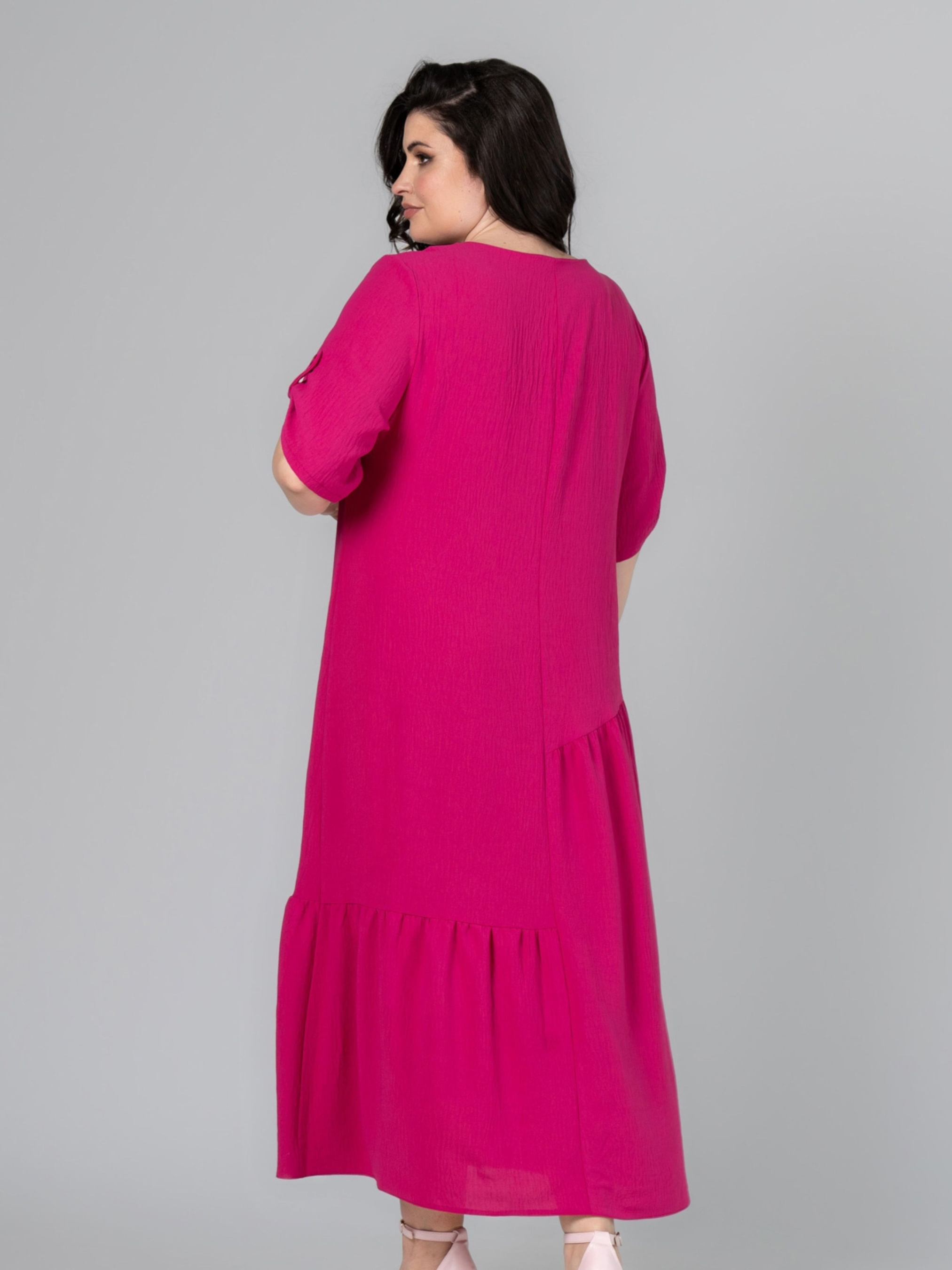 Сукня прямого силуету, виготовлена з тканини - американський креп. Тканина злегка стисла, не мнеться і не просвічується, має зернисту, шорстку структуру, розтяжність низька. Рукав втачний, одношовний, довжина регулюється за допомогою пата на ґудзик. По нижній частині полички та спинки виконані асиметричні підрізи зі збиранням. Горловина декорована ґудзиком. Підійде для святкових та повсякденних образів у літню пору року. Доступні розміри: 52-66. Характеристики: Тип тканини: американський креп - злегка стисла, не мнеться і не просвічується, має зернисту, шорстку структуру, розтяжність низька. Склад тканини: поліестер 85% віскоза 15%. Довжина рукава: 32 см. Довжина виробу по спинці: 130 см. Орієнтовні заміри готового виробу: р.56: ОГ - 120см, ОТ - 124см, ОБ - 136см; ширина рукава - 23см; ширина спинки - 44см; р.58: ОГ - 124см, ОТ - 128см, ОБ - 140см; ширина рукава - 24см; ширина спинки - 45см; р.60: ОГ - 128см, ОТ - 132см, ОБ - 146см; ширина рукава - 24,5см; ширина спинки - 46см; р.62: ОГ - 132см, ОТ - 138см, ОБ - 150см; ширина рукава - 25см; ширина спинки - 47см; р.64: ОГ - 140см, ОТ - 144см, ОБ - 154см; ширина рукава - 25,5см; ширина спинки - 49см; р.66: ОГ - 144см, ОТ - 150см, ОБ - 158см; ширина рукава - 26см; ширина спинки - 50см.