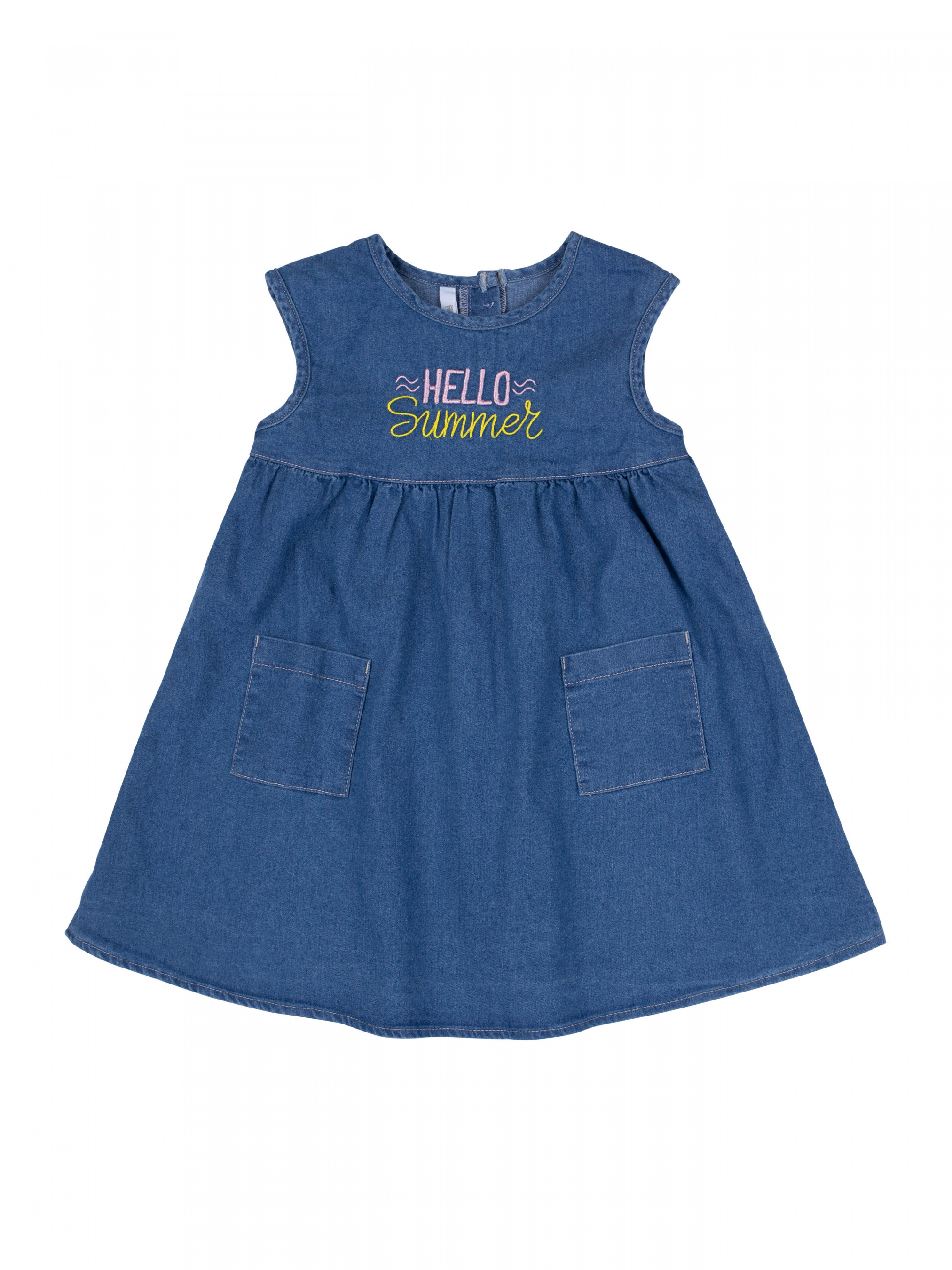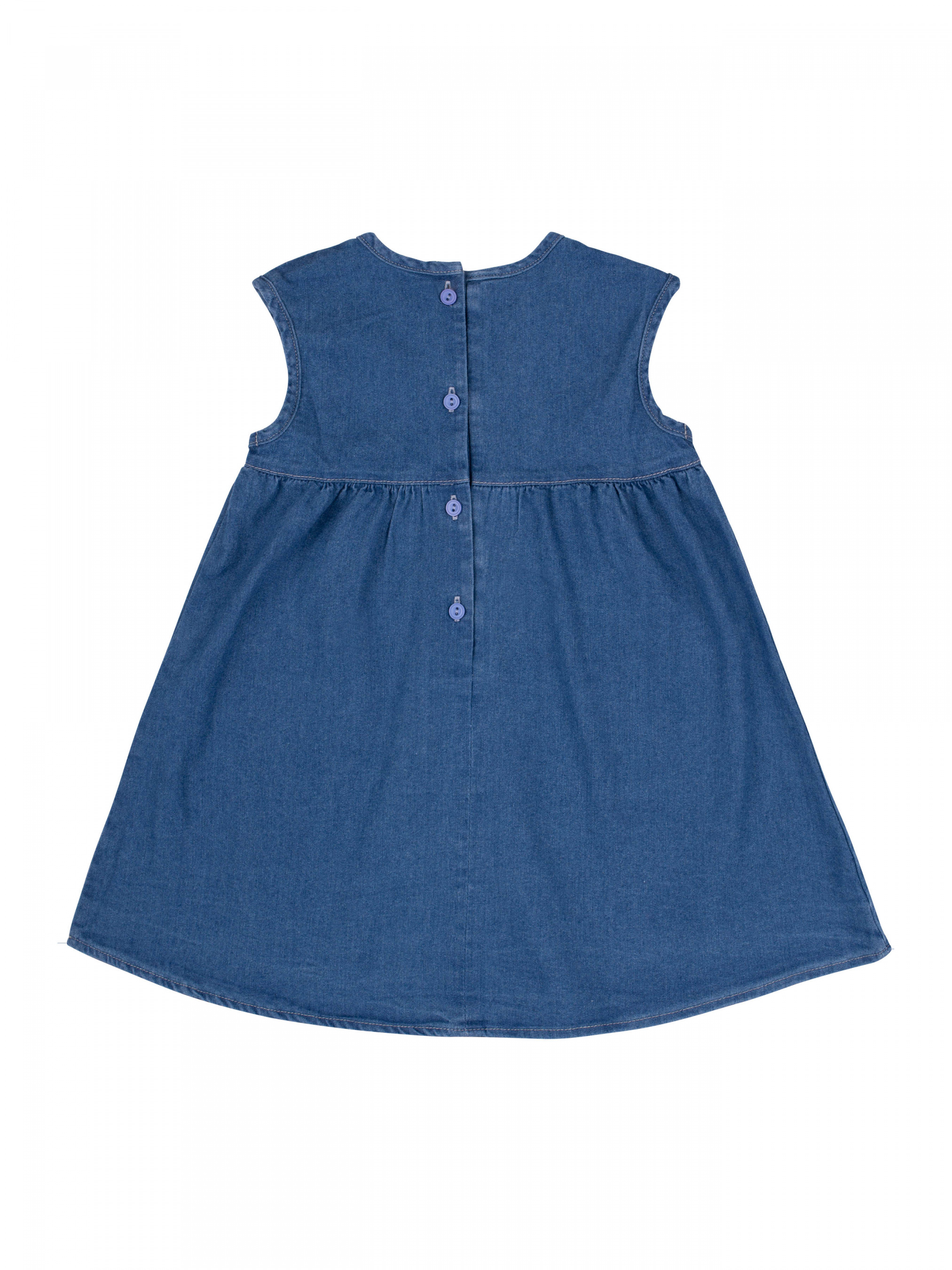 Платье без рукава для девочки. Отрезная по линии талии, два кармана. Ткань джинс, спереди вышивка.
