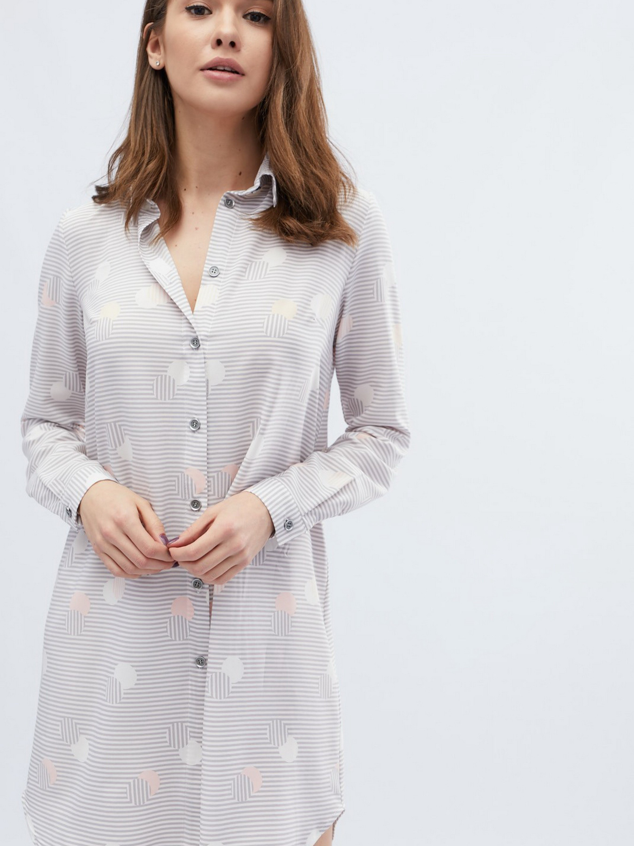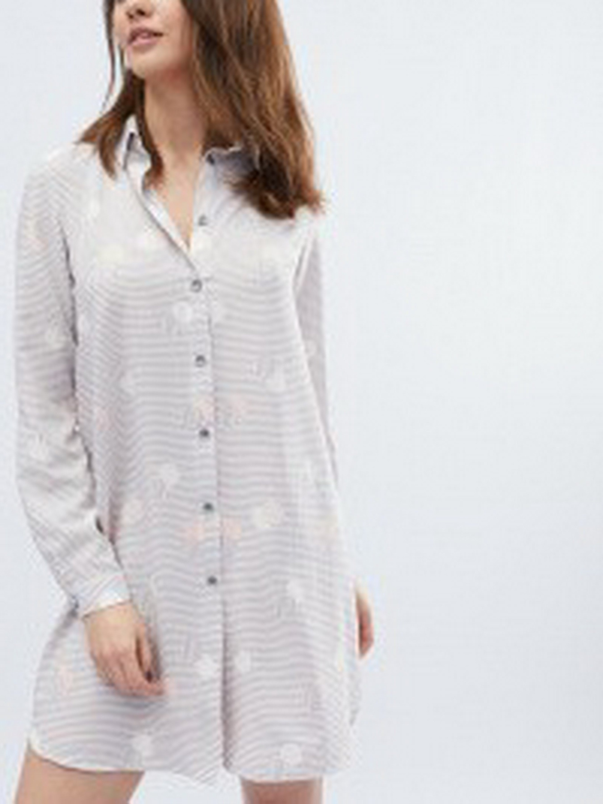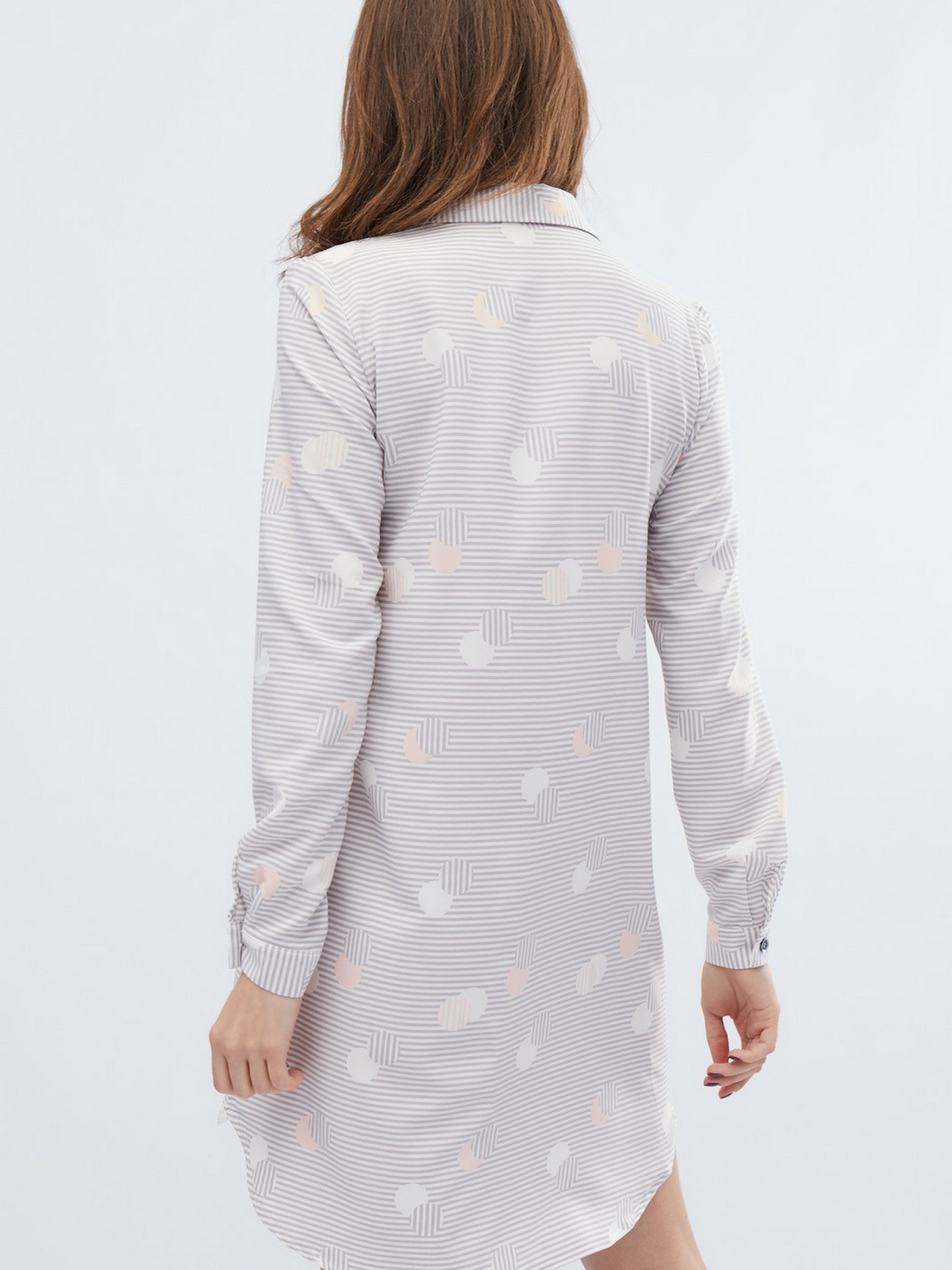 Платье стильного рубашечного фасона. Модель выделяется английским воротником, от воротника и практически к низу - планка с пуговицами, длинный рукав на манжете, длина мини. Спереди изделие немного короче, чем сзади, бока слегка закруглены. Светлый тон, ребристая расцветка.