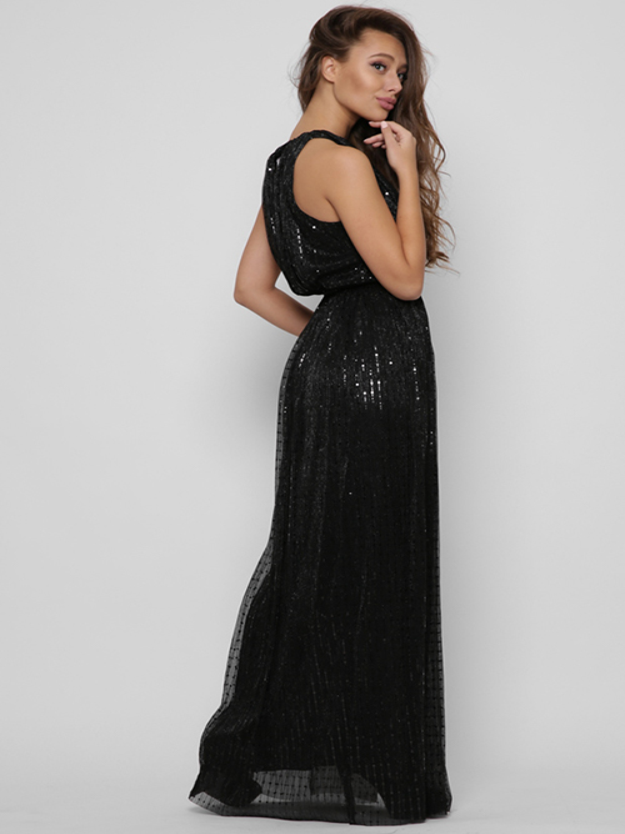 Вечернее платье-макси. Модель имеет аккуратный круглый вырез, высокий боковой разрез и широкий пояс на талии. Ткань изделия украшена блестящим фигурным декором. Сочетайте с туфлями на каблуке и клатчем.