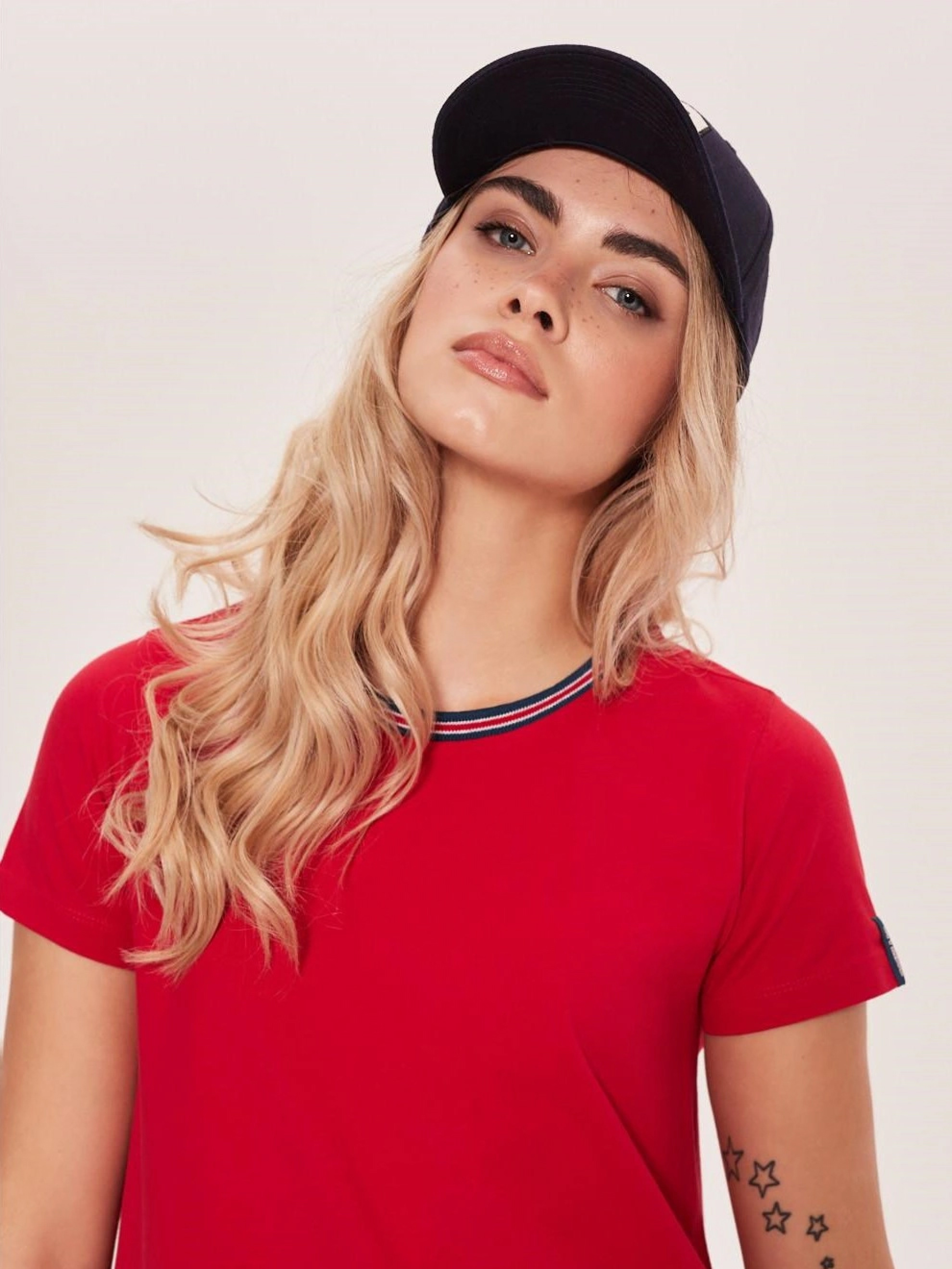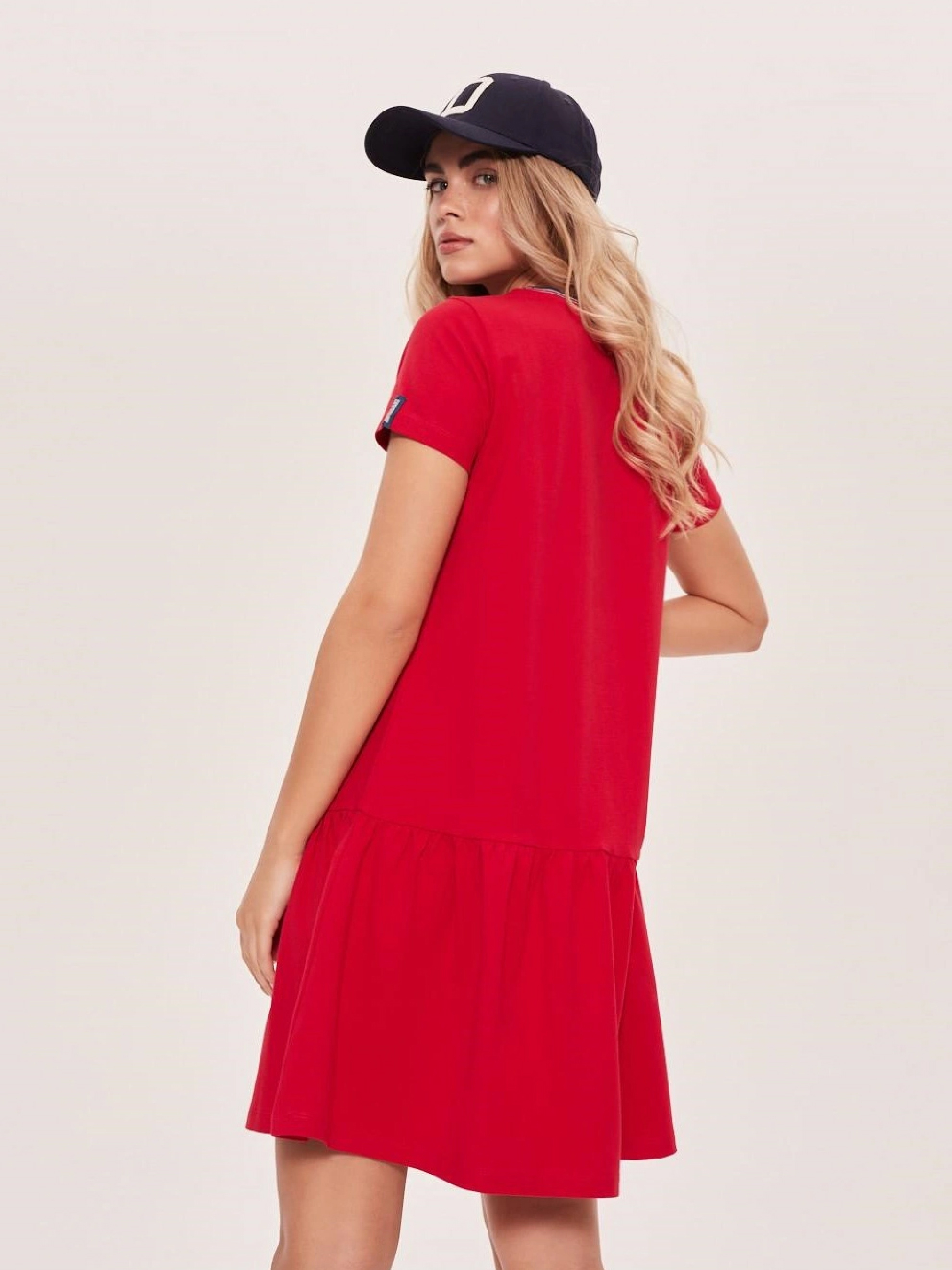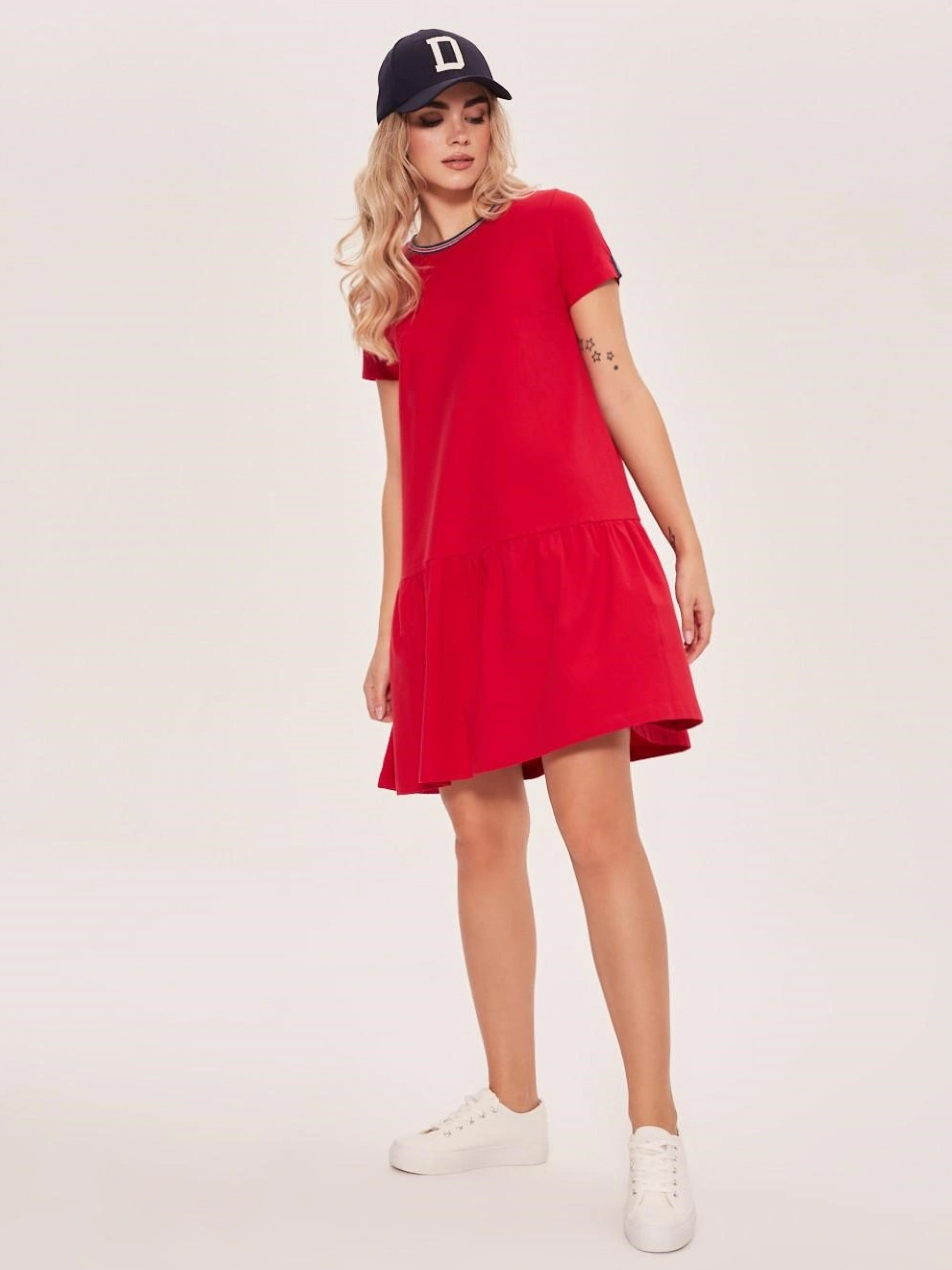 Платье GALORE Трикотажное платье на весну: - свободного кроя, - из хлопкового трикотажа с примесью эластана, - декольте обработанное рубчиком в разноцветные полоски, - широкая оборка внизу, - с короткими рукавами, - идеально подходит для повседневного использования, – в наличии красный. Сезон: Весна/Лето Состав: 95% хлопок, 5% эластан. Размер на модели – S Рост модели – 171 см