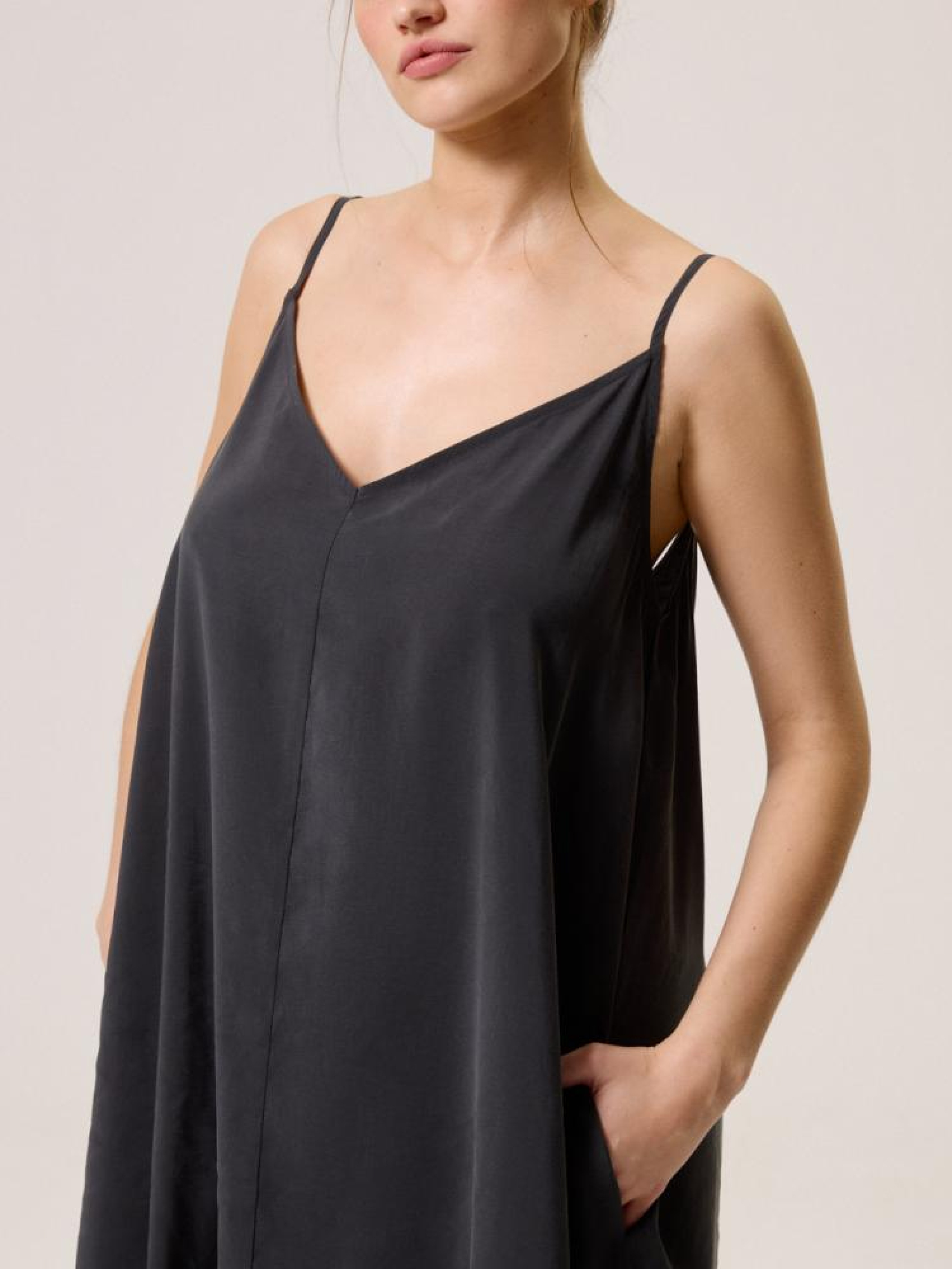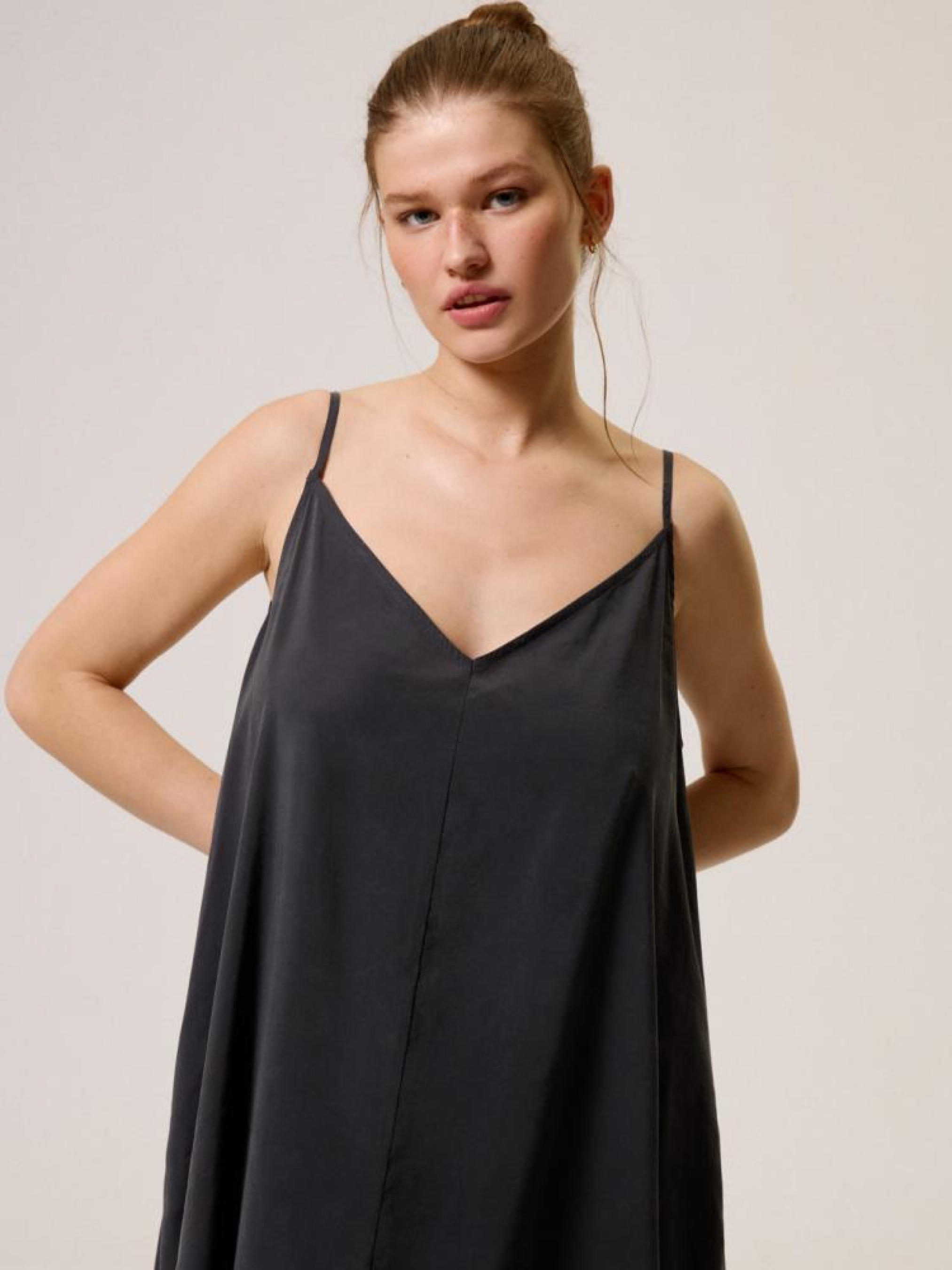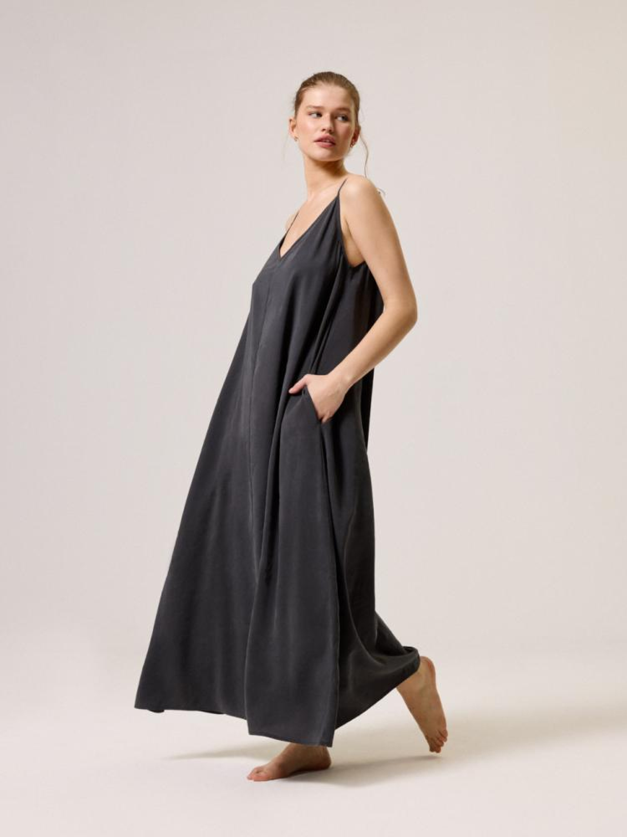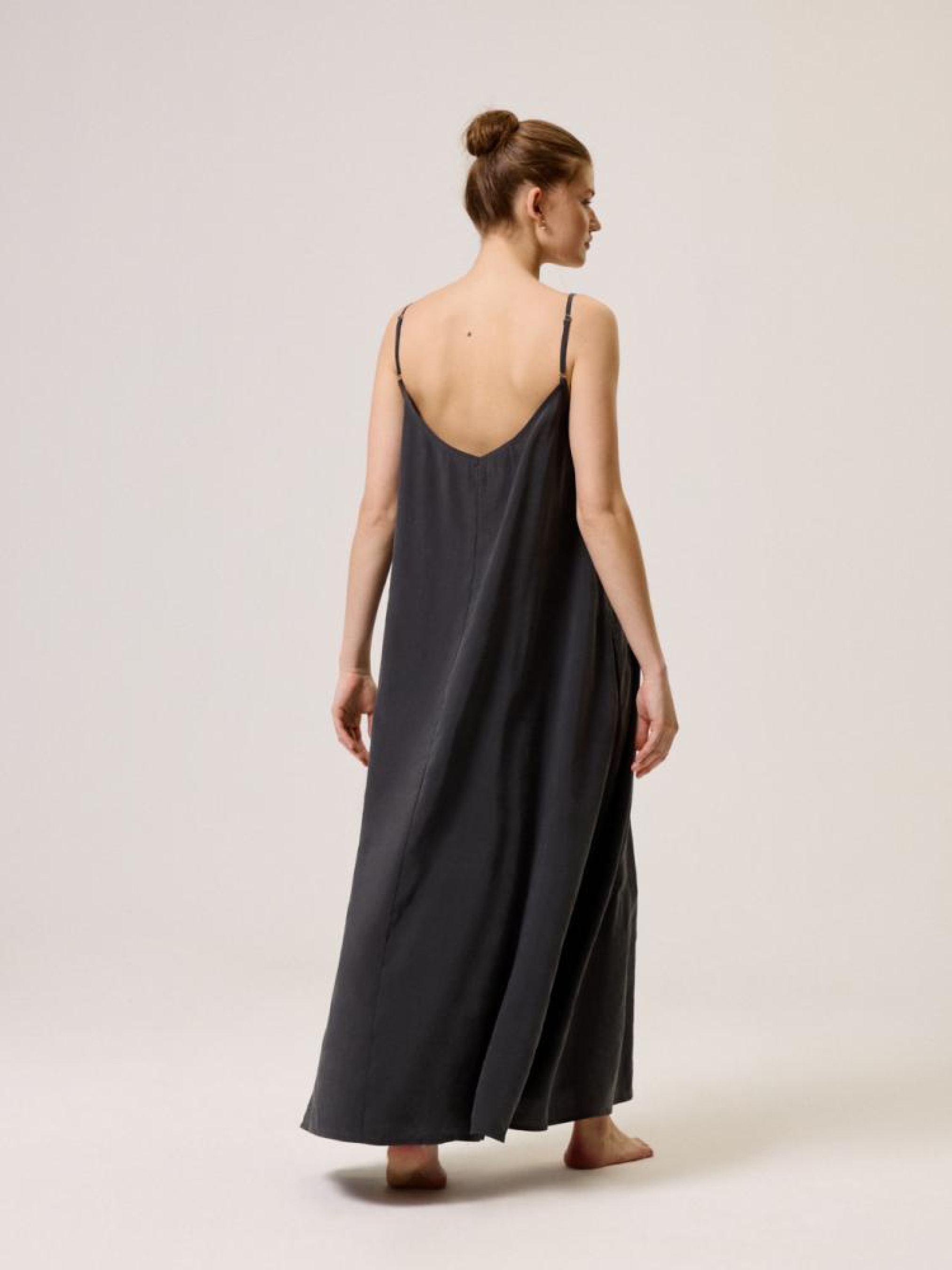Платье CLTN BLACK 10044632 Свободное из модала платье с открытой спинкой: - свободный крой, - изготовлено из купро ткани с полиэстером, - с карманами, - с вышивкой на спине, - на тонких регулируемых бретелях, - с открытой спиной, - с V-образным вырезом, - доступна в цвете антрацит. Сезон: Весна/Лето 2024 Состав: 84% модал, 16% полиэстер Уход: - стирка при максимум 30 °С - не отбеливать - не сушить в сушильной машине - гладить максимум при темп. 110 °С - не химчистка Размер на модели - S Рост модели - 175 см