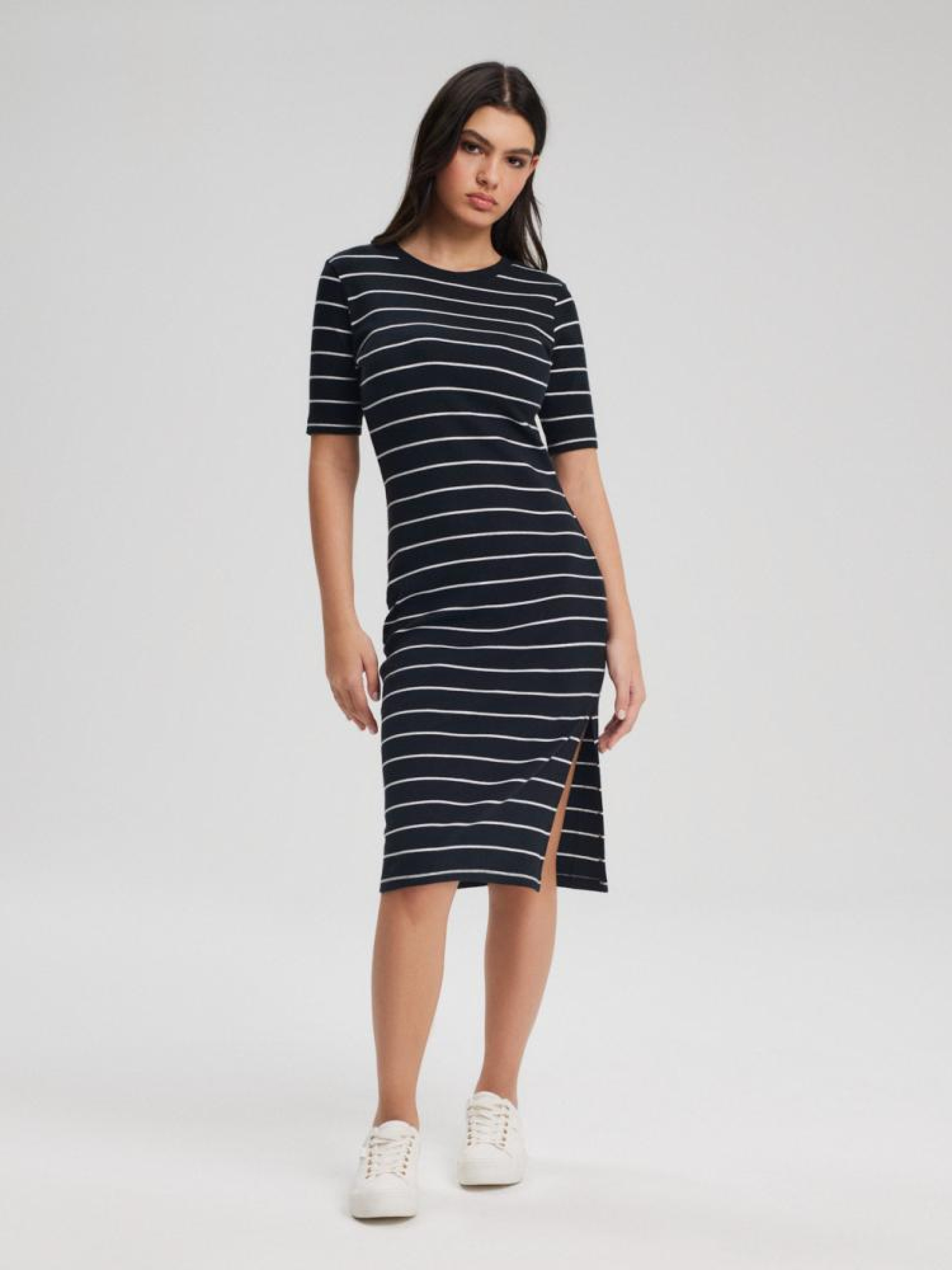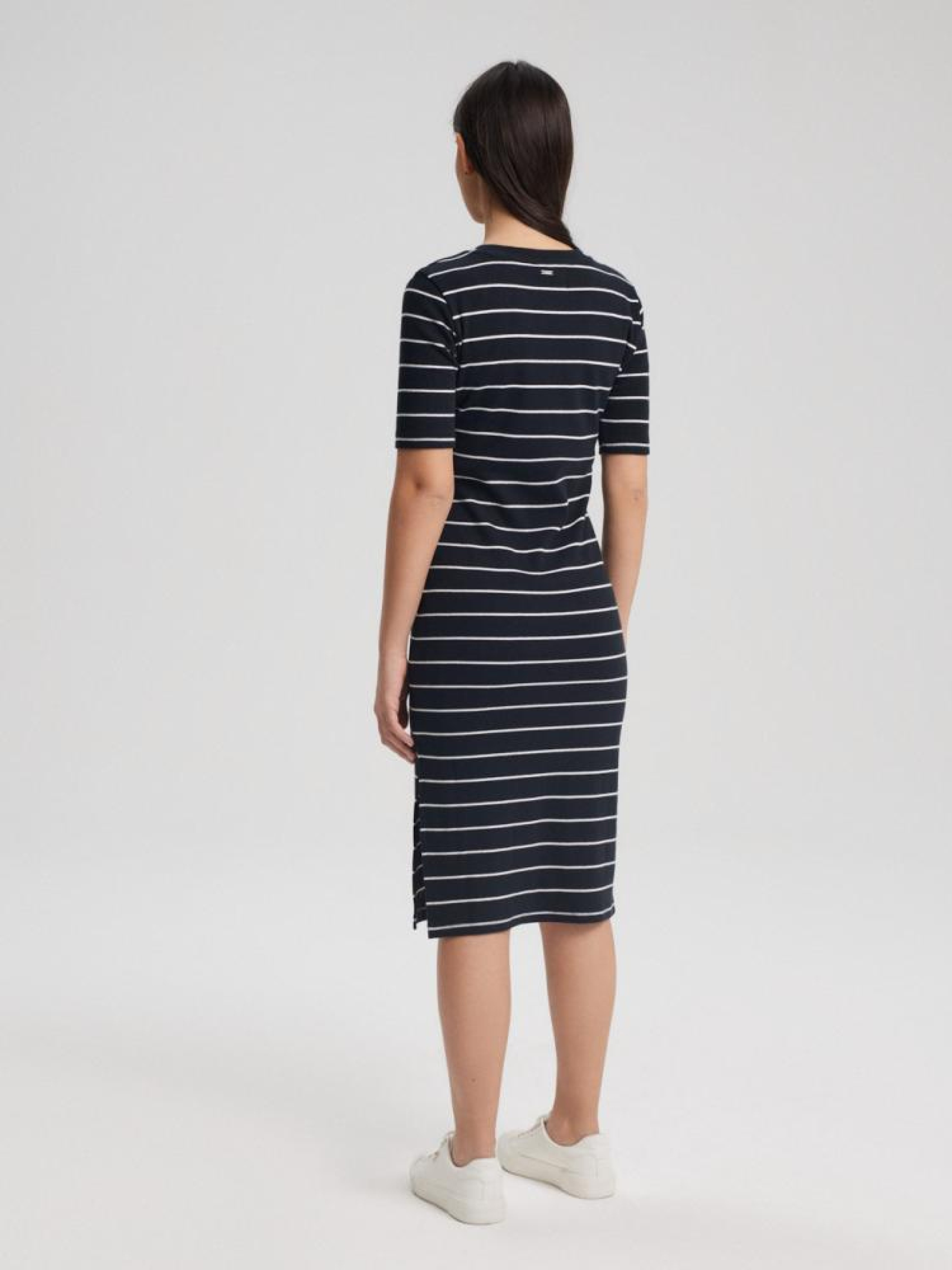 Платье PASSKI 10044040 Трикотажное приталенное платье ниже колена: - приталенный крой, - из хлопкового трикотажа с примесью эластана, - с рукавами до локтя, - с разрезом с одной стороны, - в черно-белой полоске. Состав: 95% хлопок 5% эластан Сезон: Весна/Лето 2024 Уход: - не отбеливать - не сушить в сушильной машине - гладить максимум при темп. 110 °С - не химчистка - ручная стирка Размер на модели - S Рост модели - 171 см