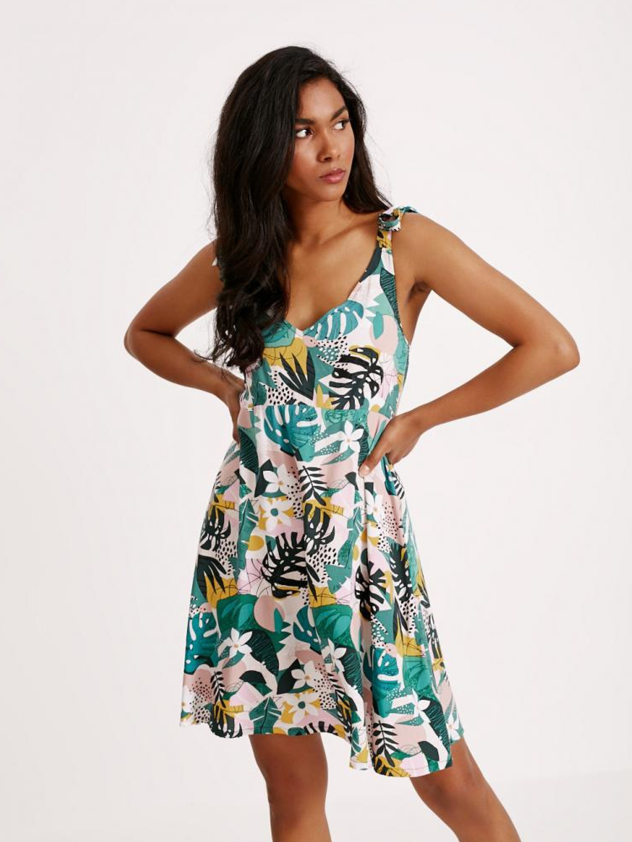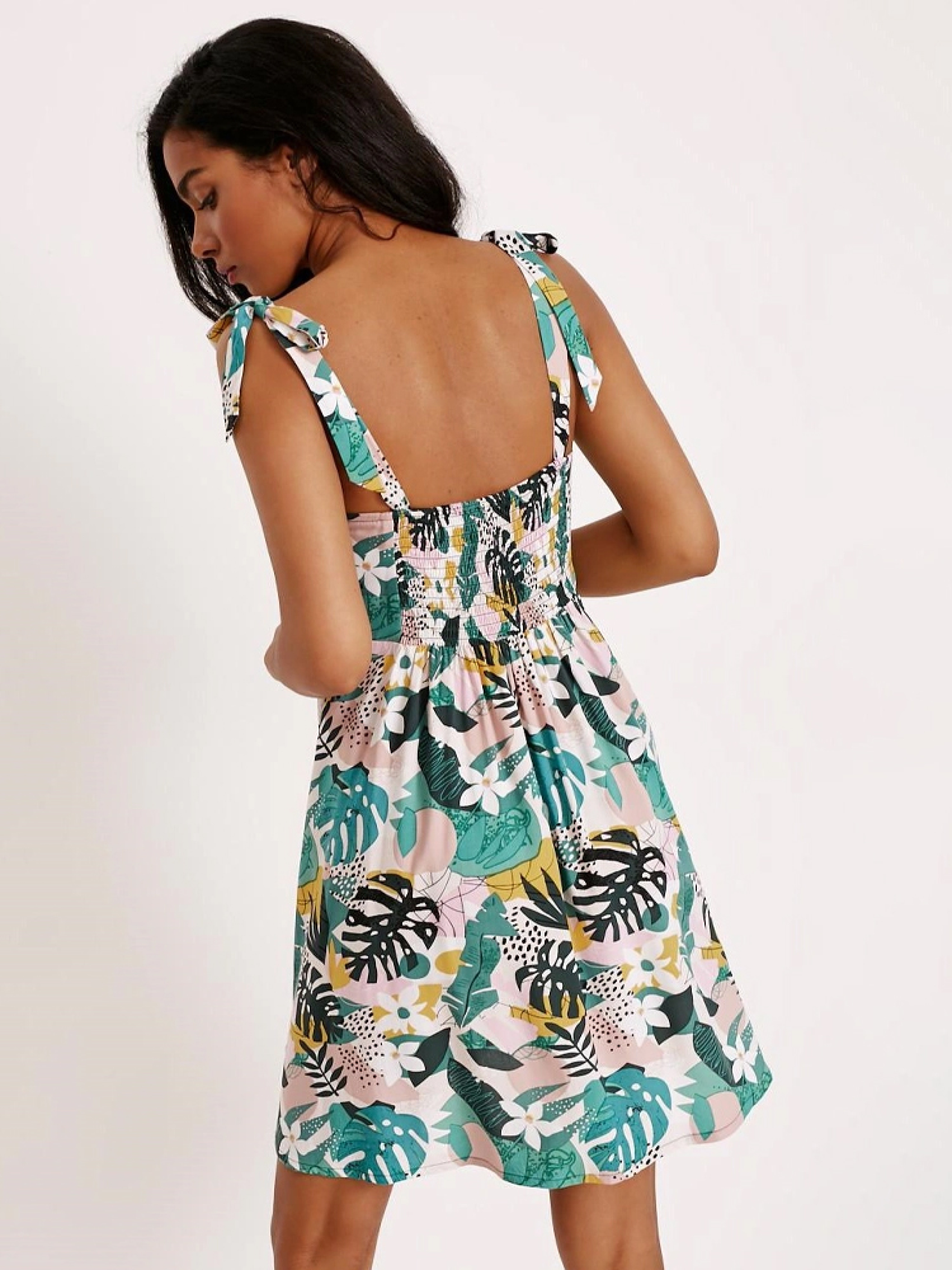Короткое женское платье INTENSA с тропическим рисунком. Основные характеристики: - приталенный верх, - вырез под бюст, - расклешенный низ, - широкие завязанные бретельки. - резинки на спине приспосабливают платье к фигуре, - из вискозы с красивым цветочным принтом. Сезон: Весна/Лето. Состав: 100% вискоза Размер на модели - S Рост модели - 174 см